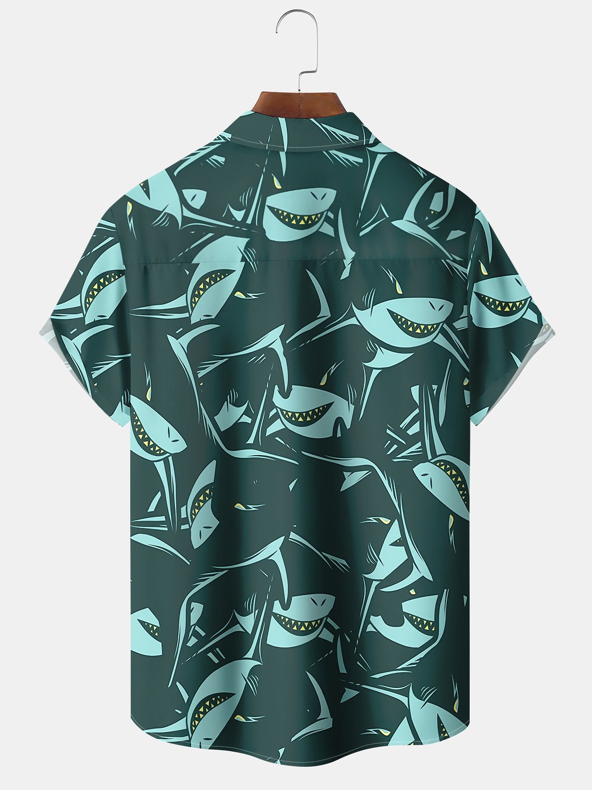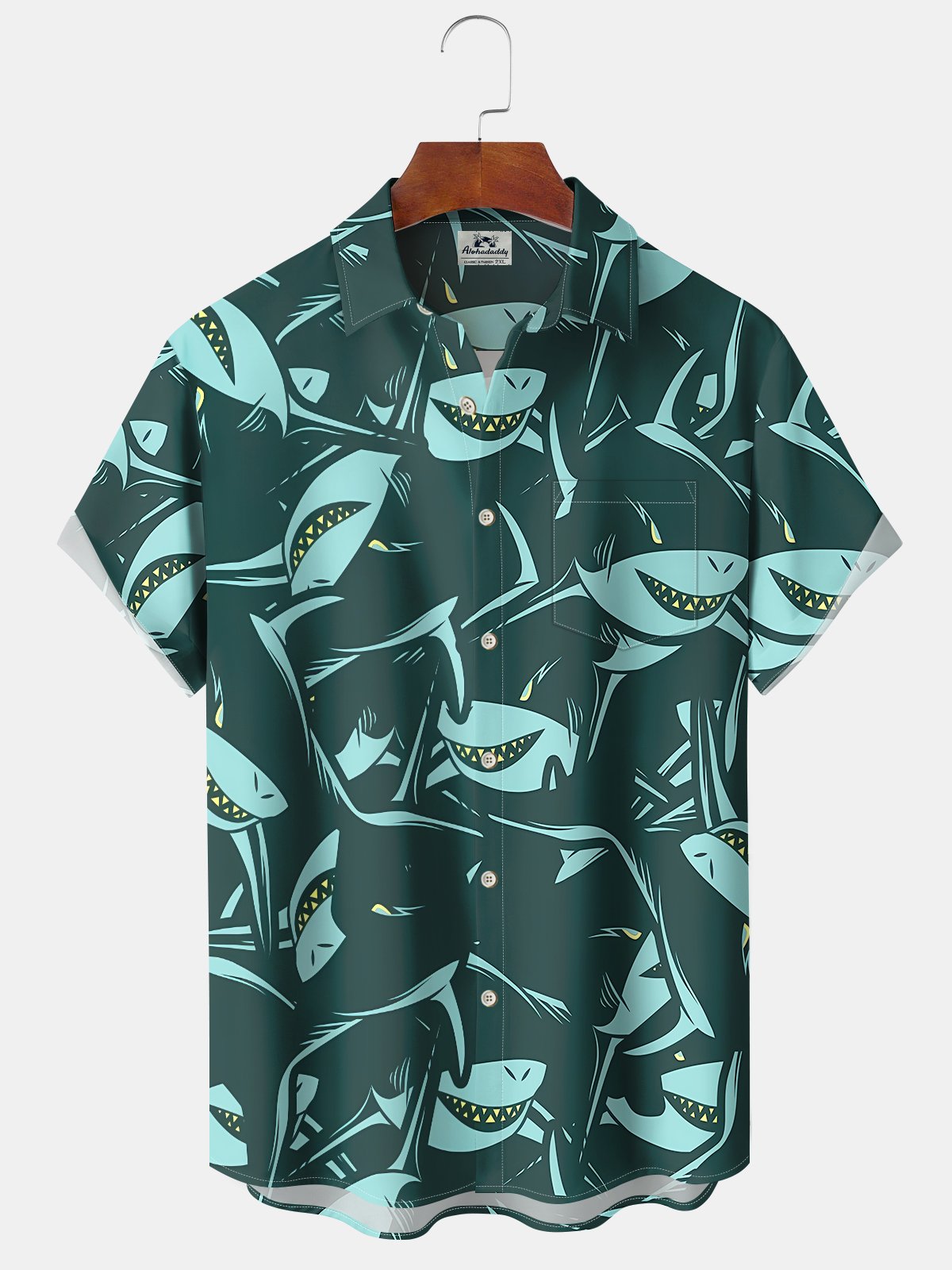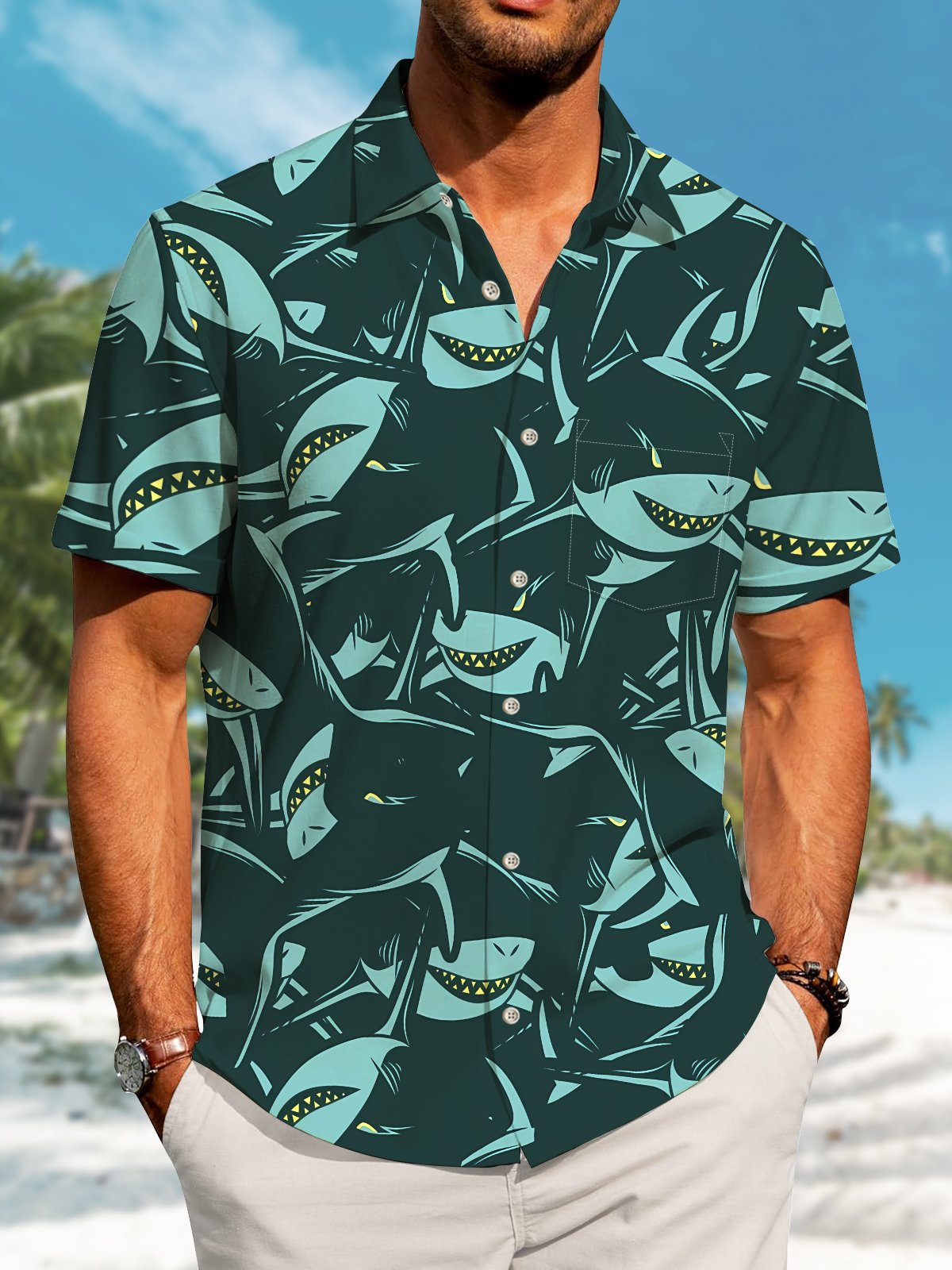 Alohadaddy Hawaii Ocean Shark Print Art Pockets Buttons Stretch Oversized Shirt
