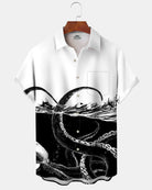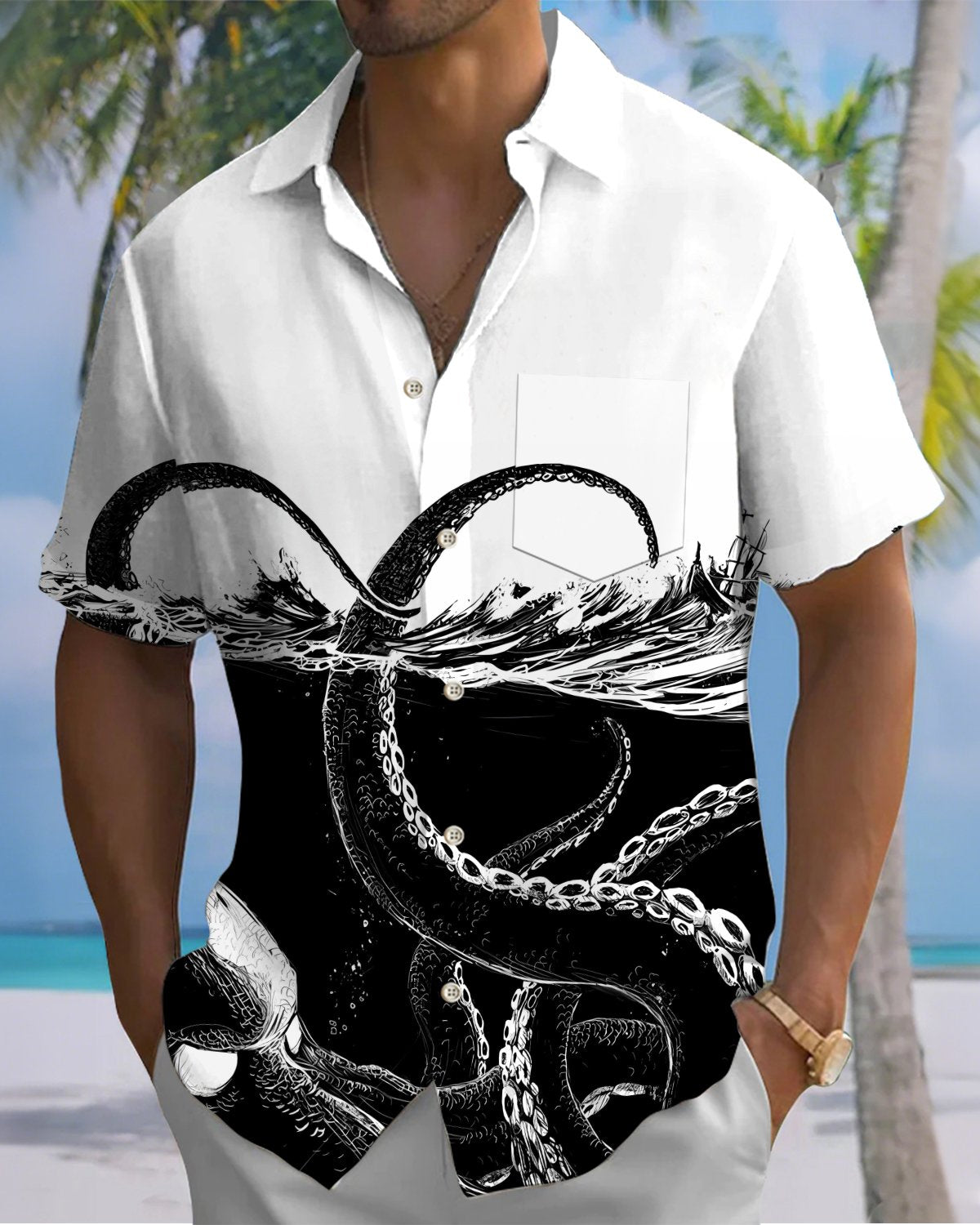 Alohadaddy® Casual Octopus Wave Art Print Pocket Elastic Button Men's Short Sleeve Shirt Big & Tall