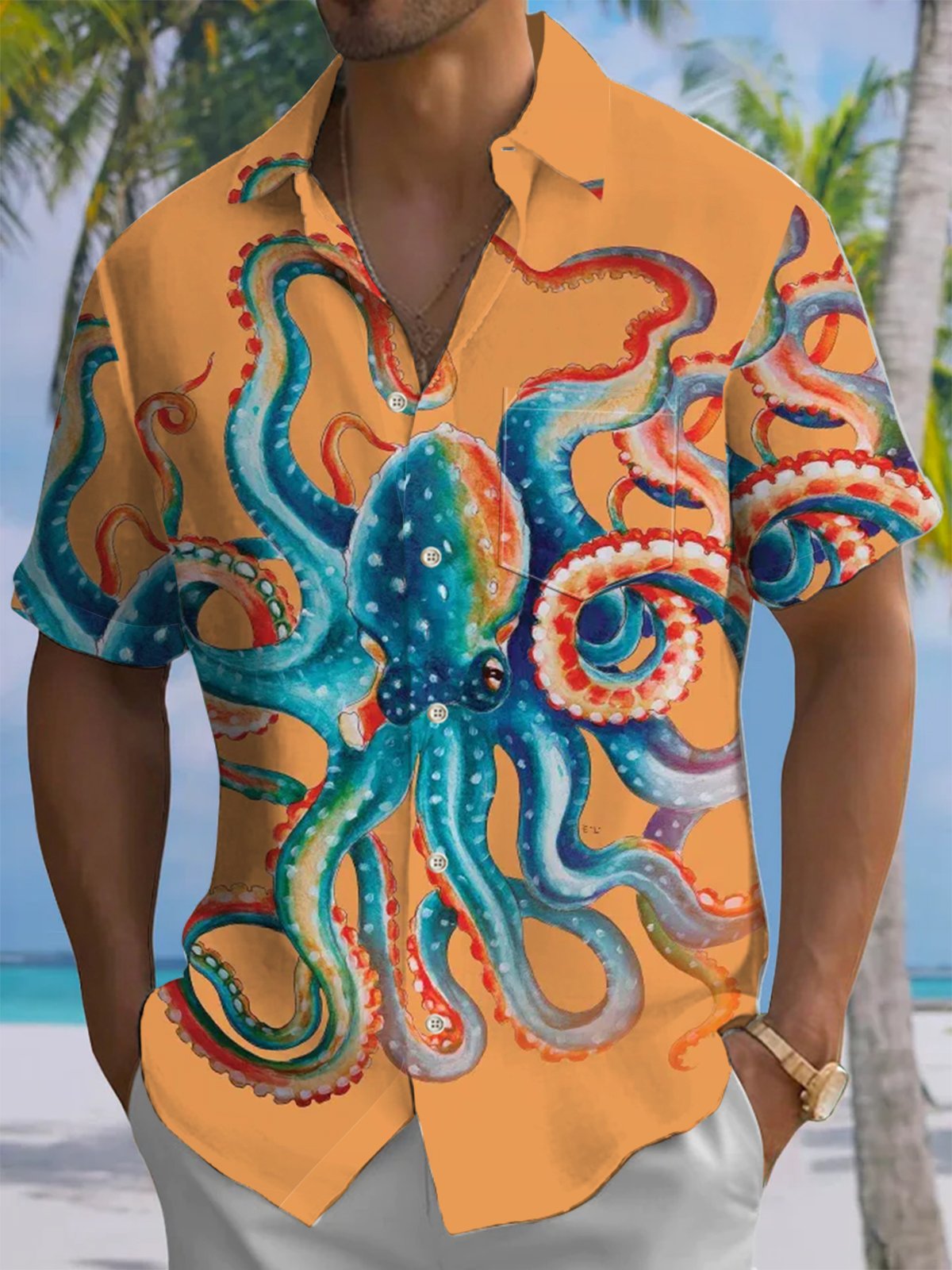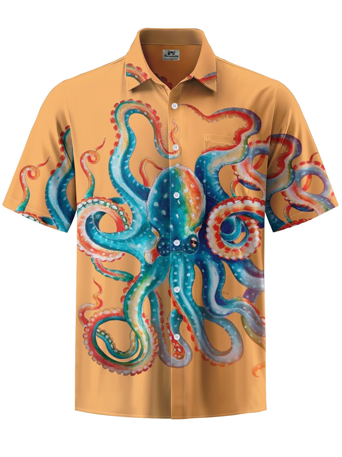 Alohadaddy® Hawaiian Octopus Art Print Chest Pocket Men's Short Sleeve Shirt Big & Tall