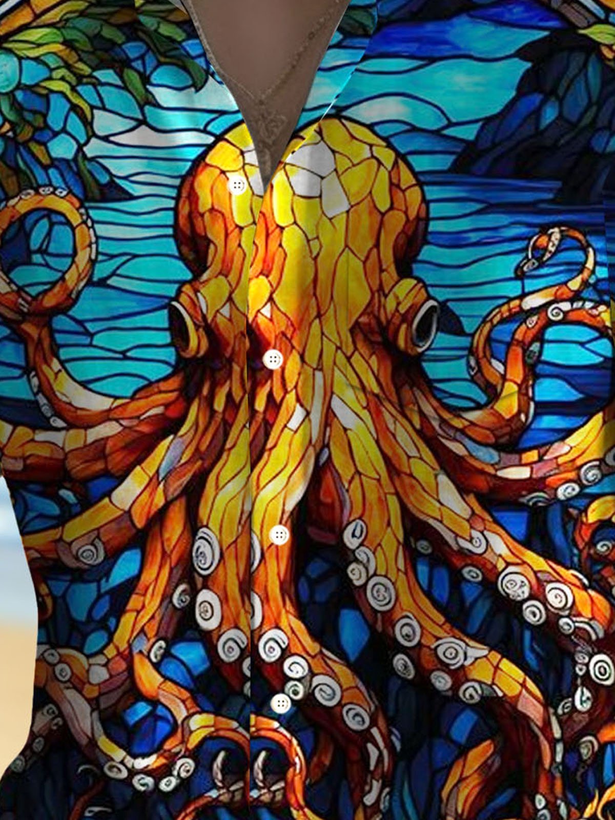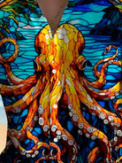 Alohadaddy Hawaiian Octopus Art Oil Painting Print Men's Button Pocket Short Sleeve Shirt