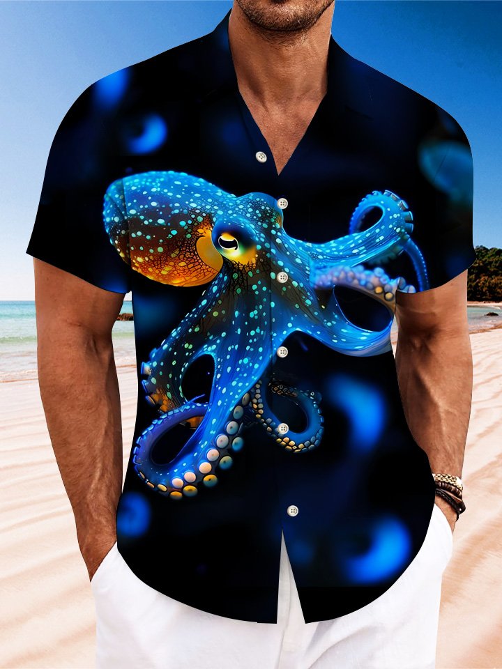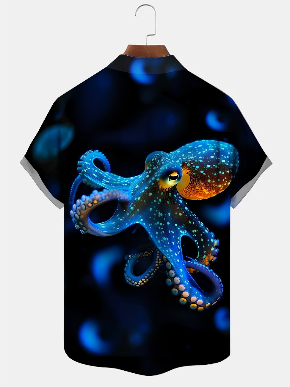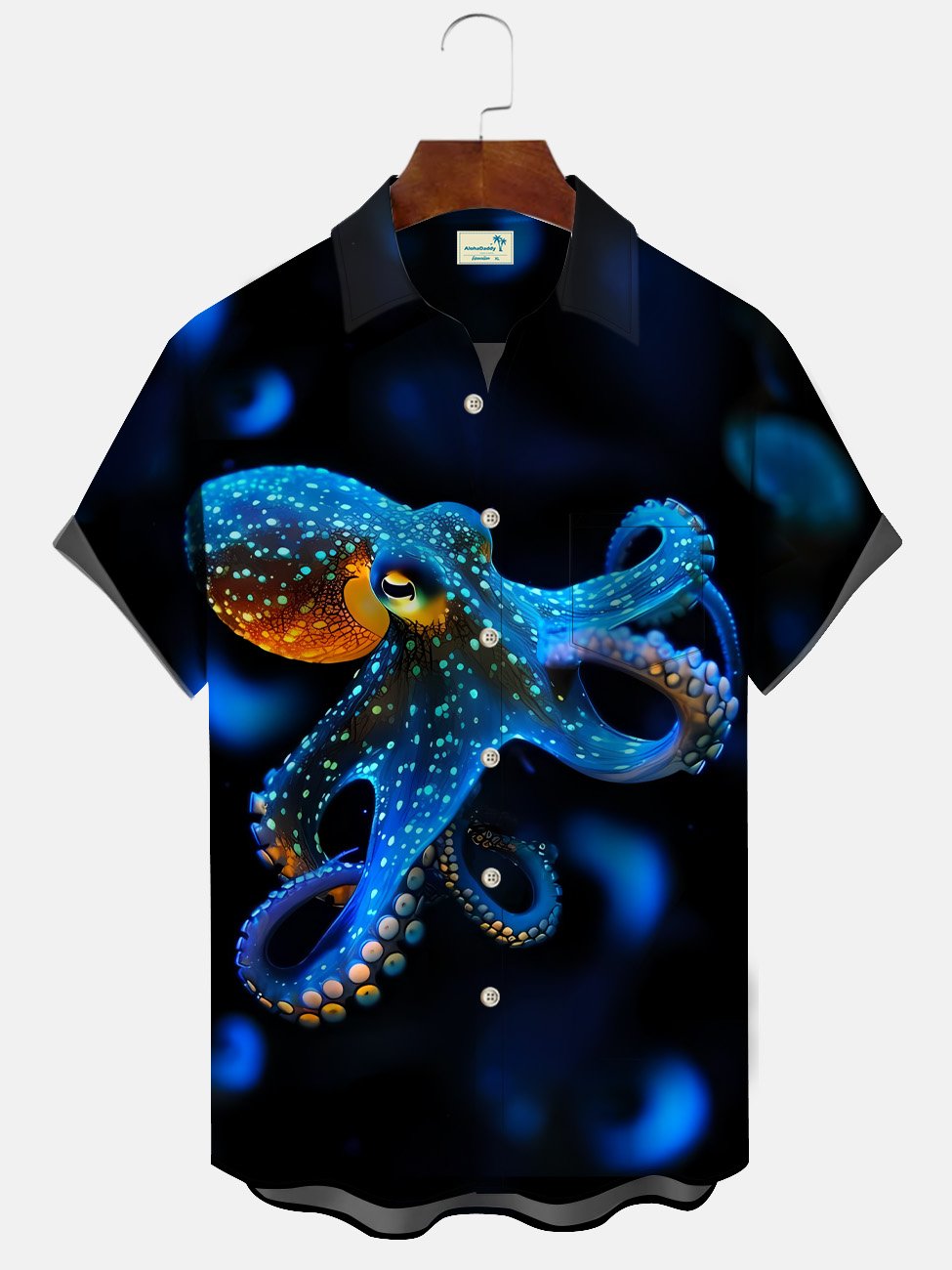 Alohadaddy Summer Ocean Animal Squid Mens Polyester Button Pocket Short Sleeve Vacation Shirt