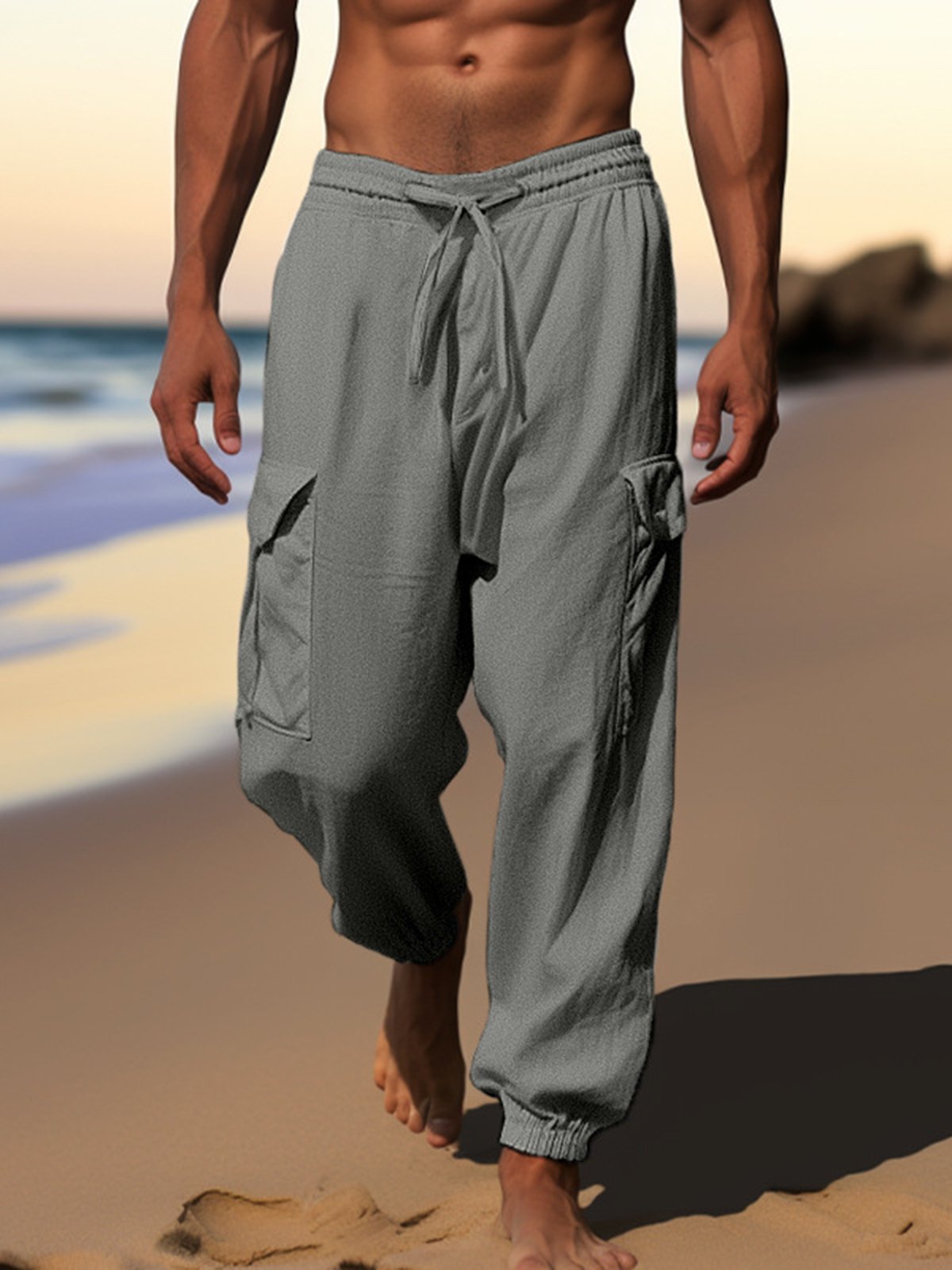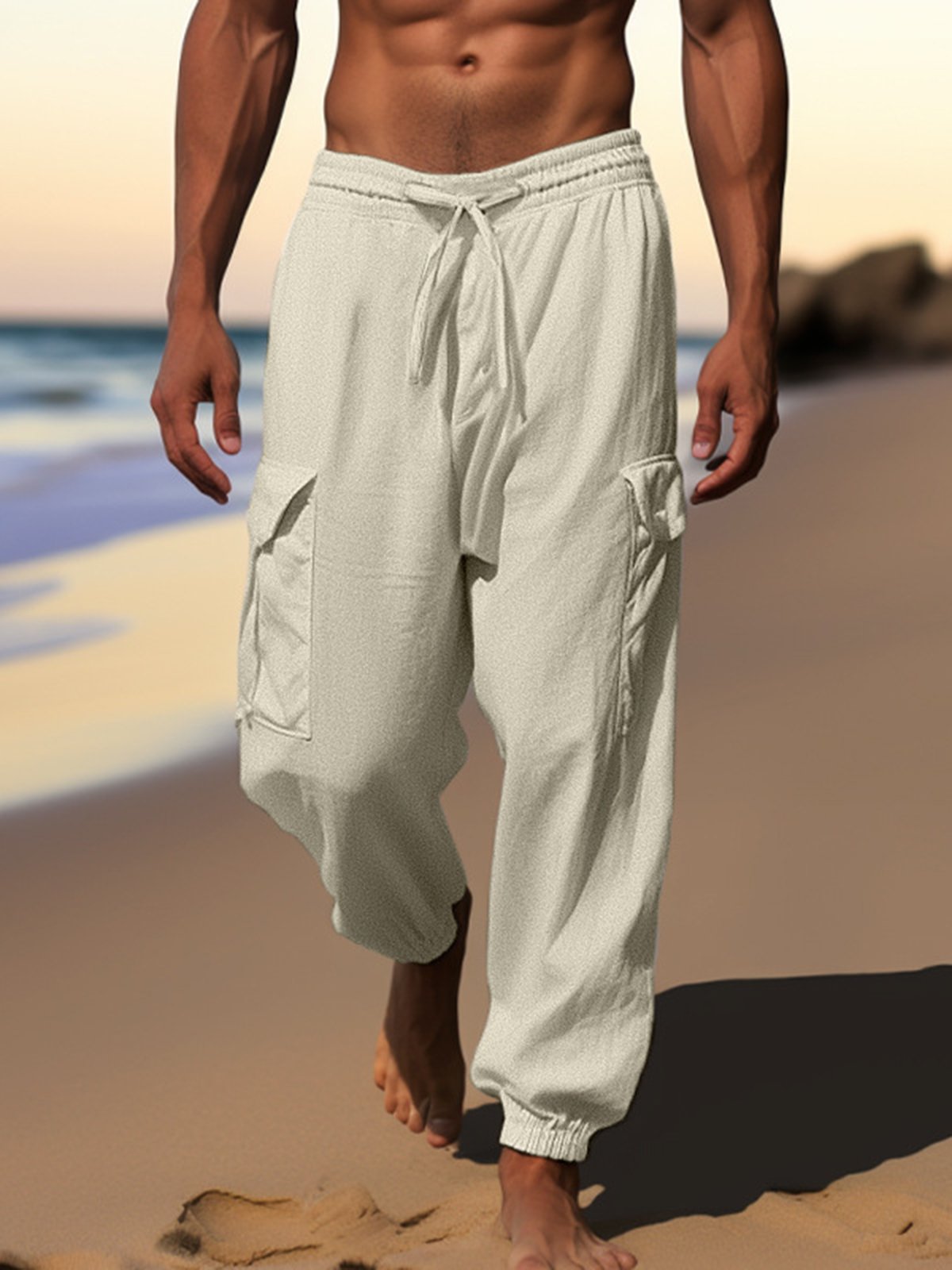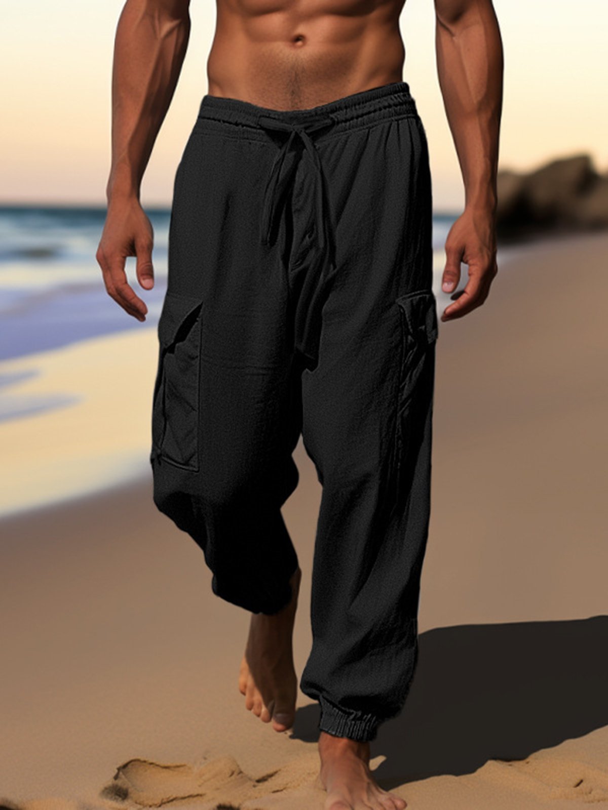 Alohadaddy® Men's Sport Linen Thin Cuff Design Cargo Pocket Drawstring Solid Color Loose Fit Pants Big & Tall