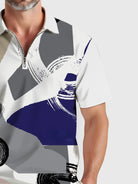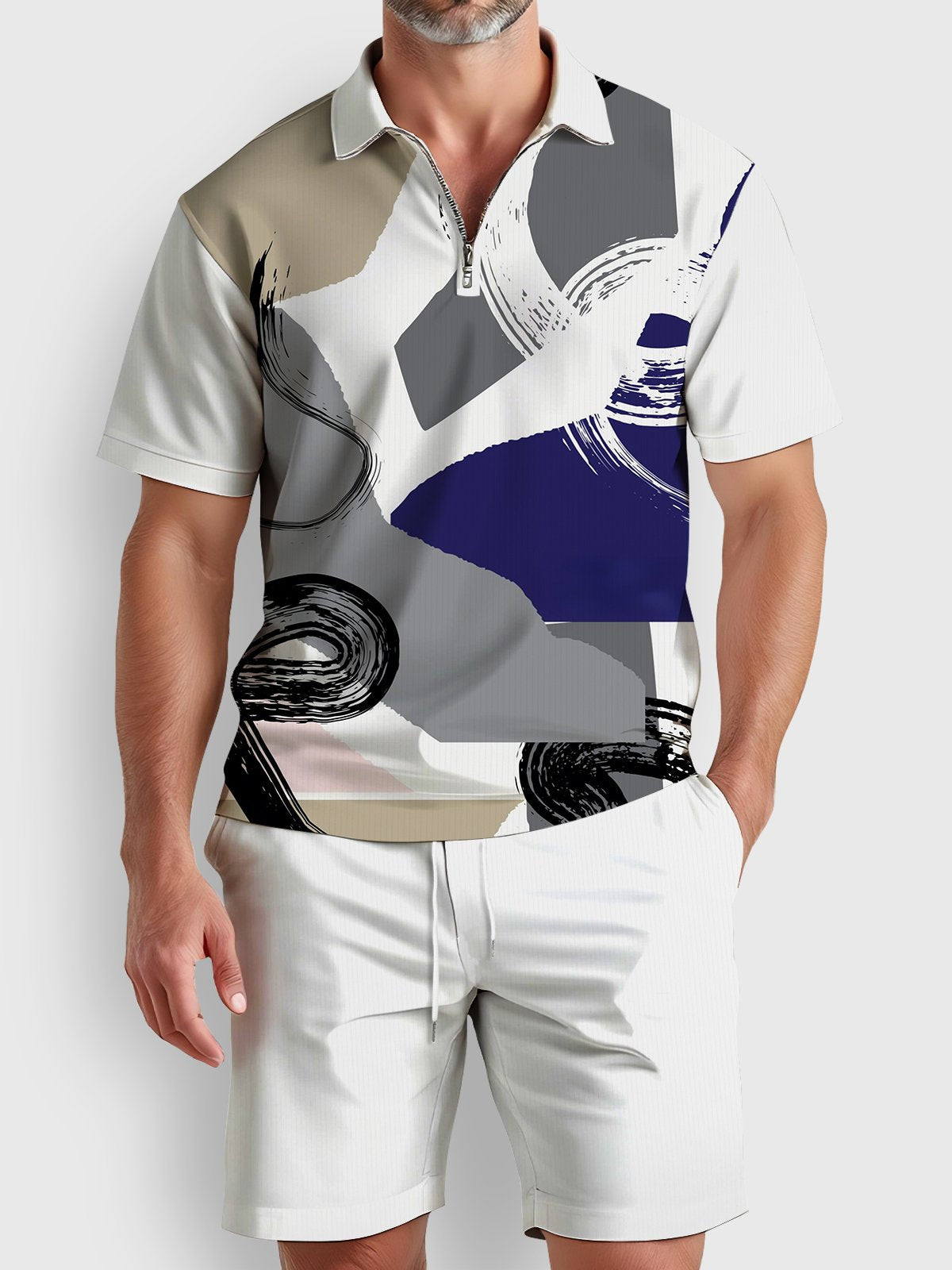 Alohadaddy® Casual Abstract Print Zipper Elastic Large Size Men's Short Sleeve Polo Shirt Set