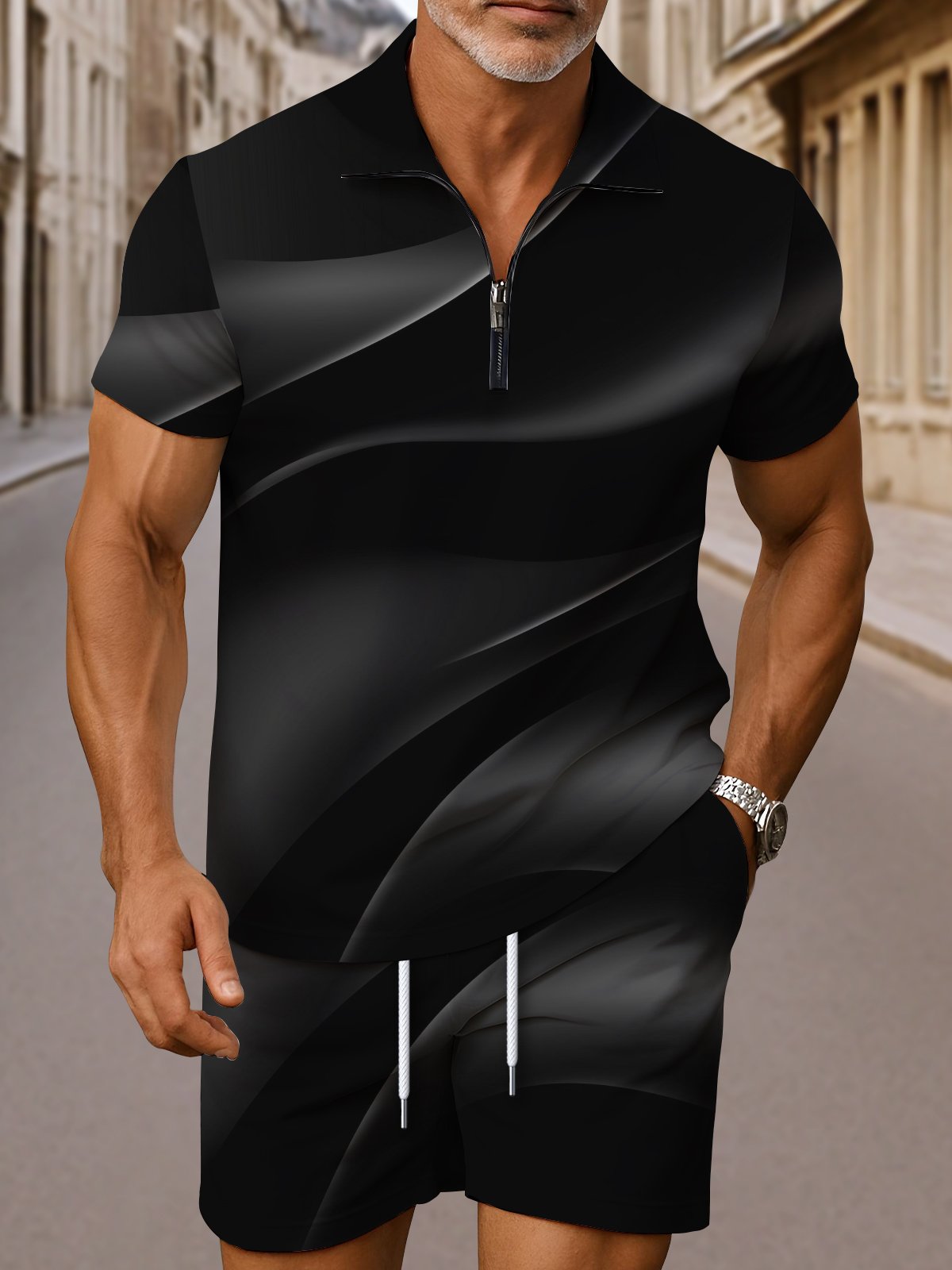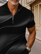 Alohadaddy® Casual Abstract Texture Print Moisture Wicking Zipper Men's Short Sleeve Polo Shirt Shorts Set