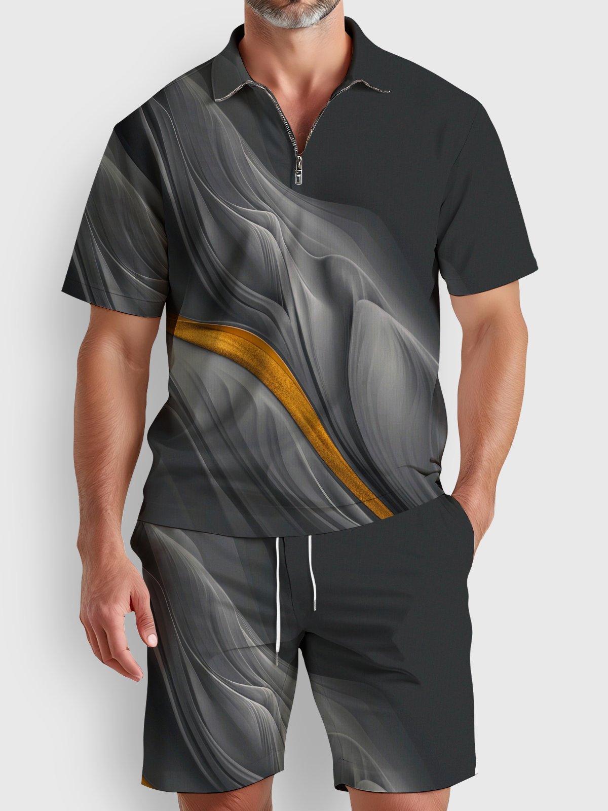Alohadaddy® Casual Gradient Abstract Print Art Zipper Elastic Large Size Men's Short Sleeve Polo Shirt Set