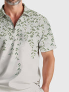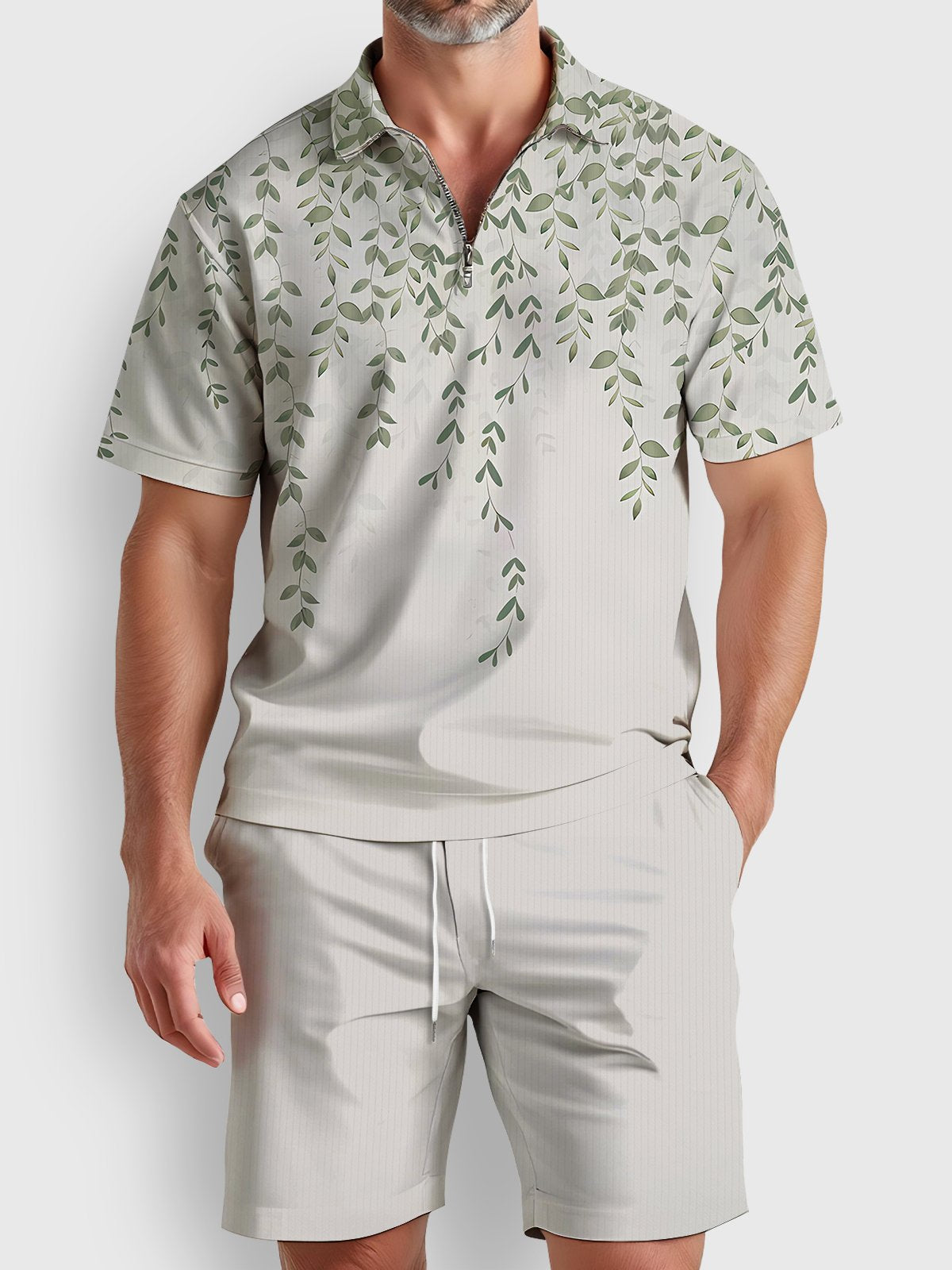 Alohadaddy® Casual Leaves Abstract Print Art Zipper Elastic Large Size Men's Short Sleeve Polo Shirt Set