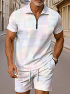 Alohadaddy® Casual Plaid Printed Elastic Large Size Men's Short Sleeve Shorts Polo Shirt Set