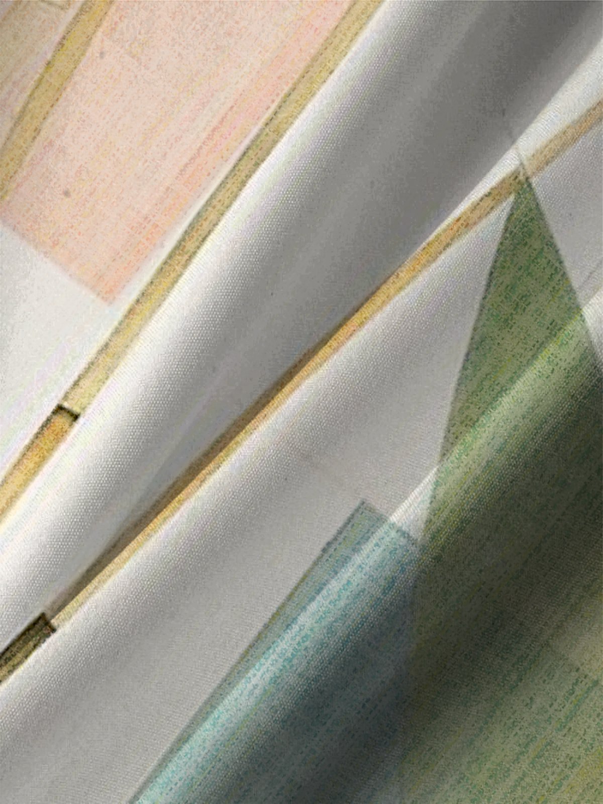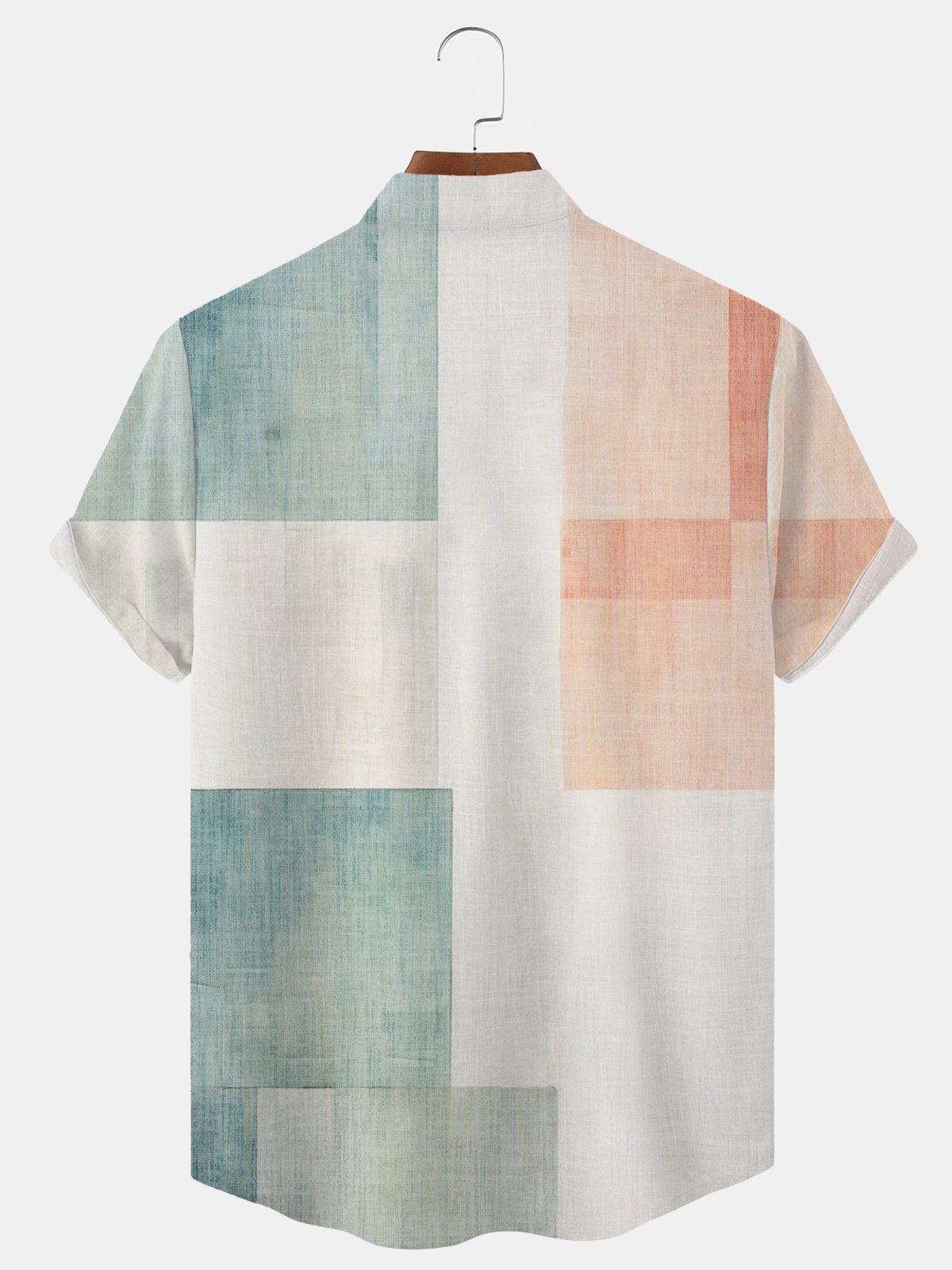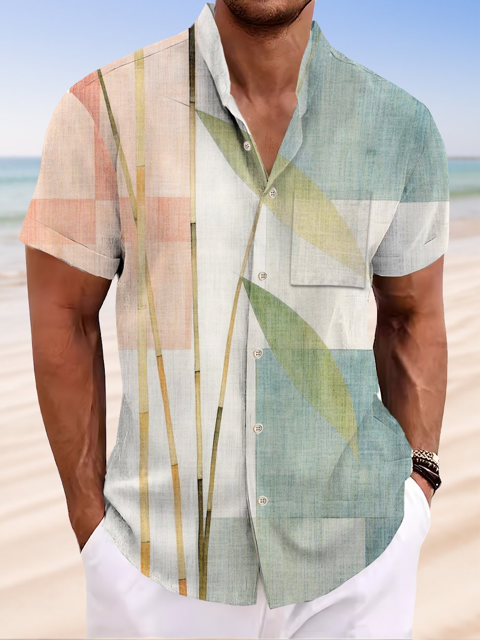 Alohadaddy Geometric Colorblock Plant Button Pocket Casual Short Sleeve Stand Collar Shirt