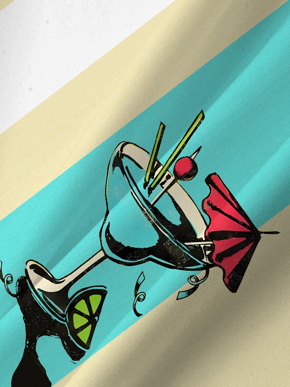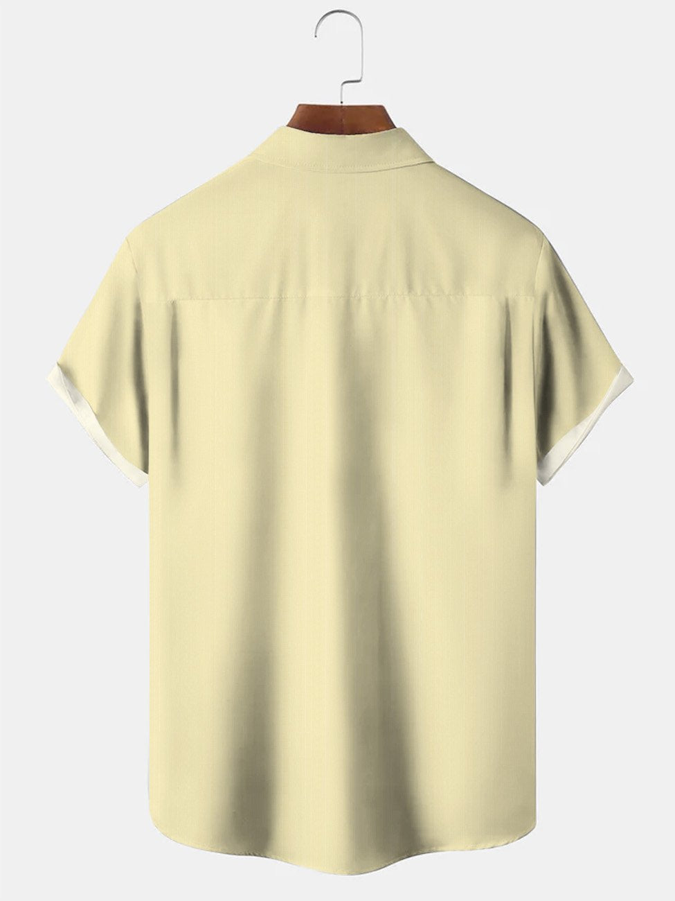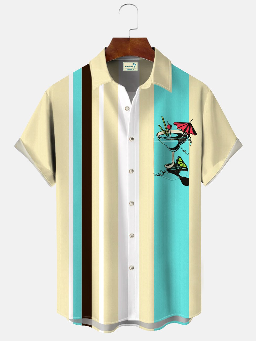 Alohadaddy Geometric Stripes Contrast Color Wine Glass Men Button Pocket 50S Bowling Commuter Casual Short Sleeve Shirt