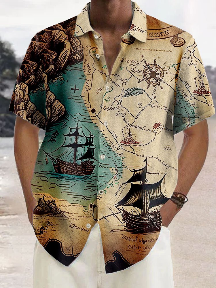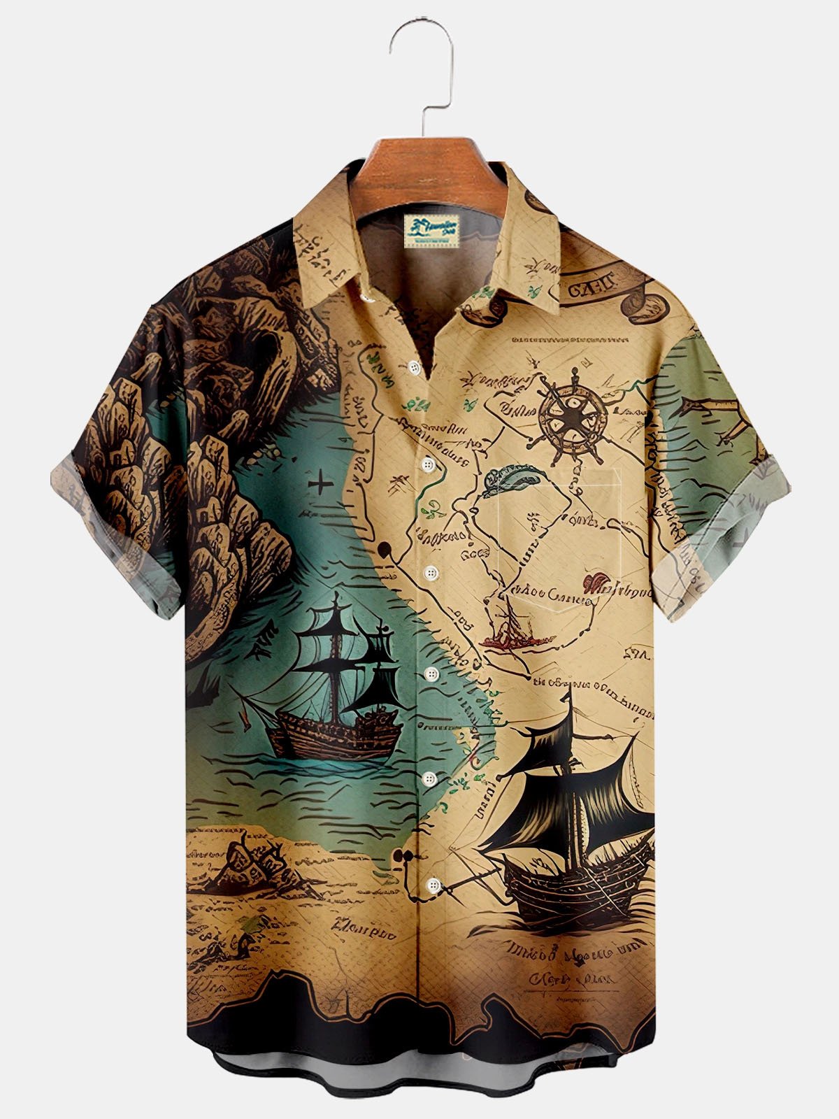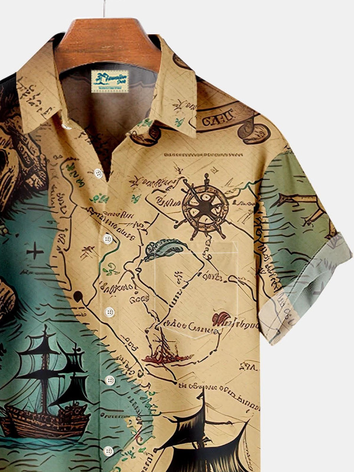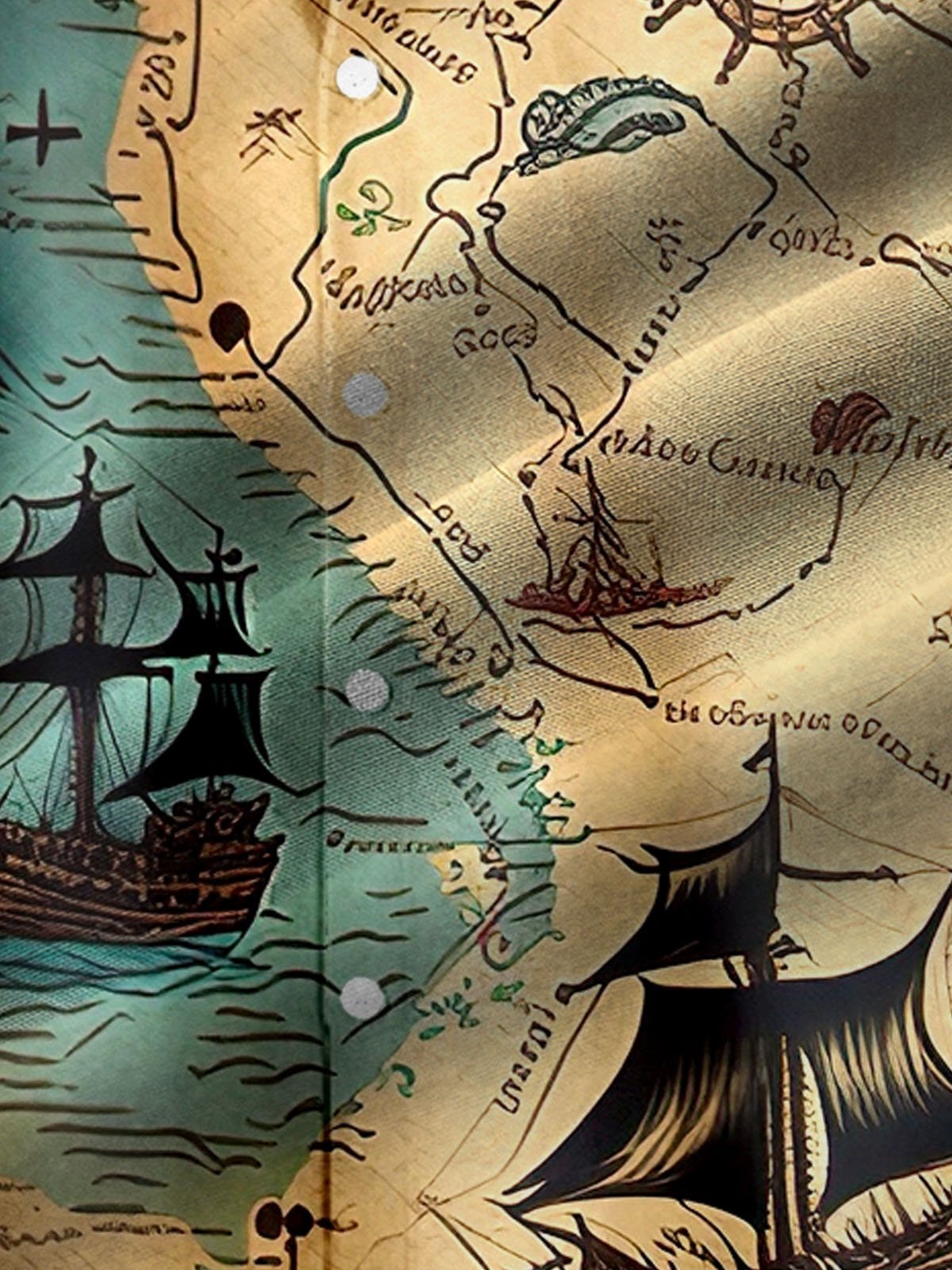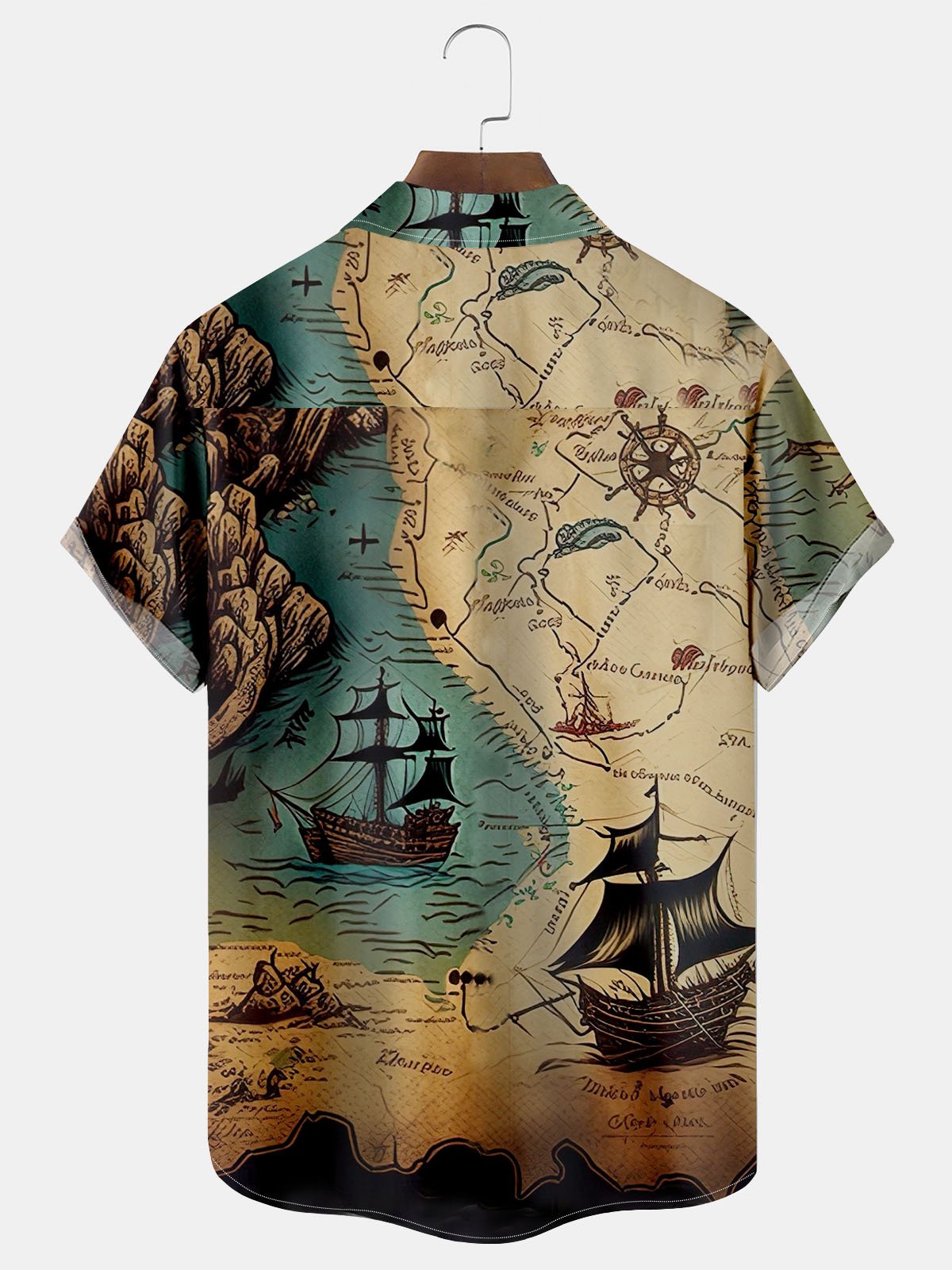 Alohadaddy Vintage Nautical Map Sailboat Print Men's Button Down Pocket Shirt