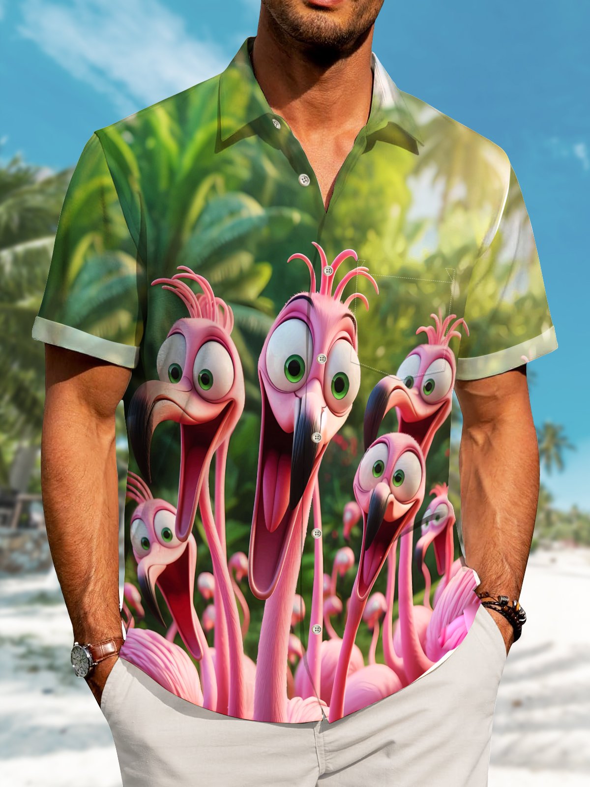 Alohadaddy Hawaii Resort Style Graffiti Flamingo Print Art Buttons Stretch Large Size Men's Shirt
