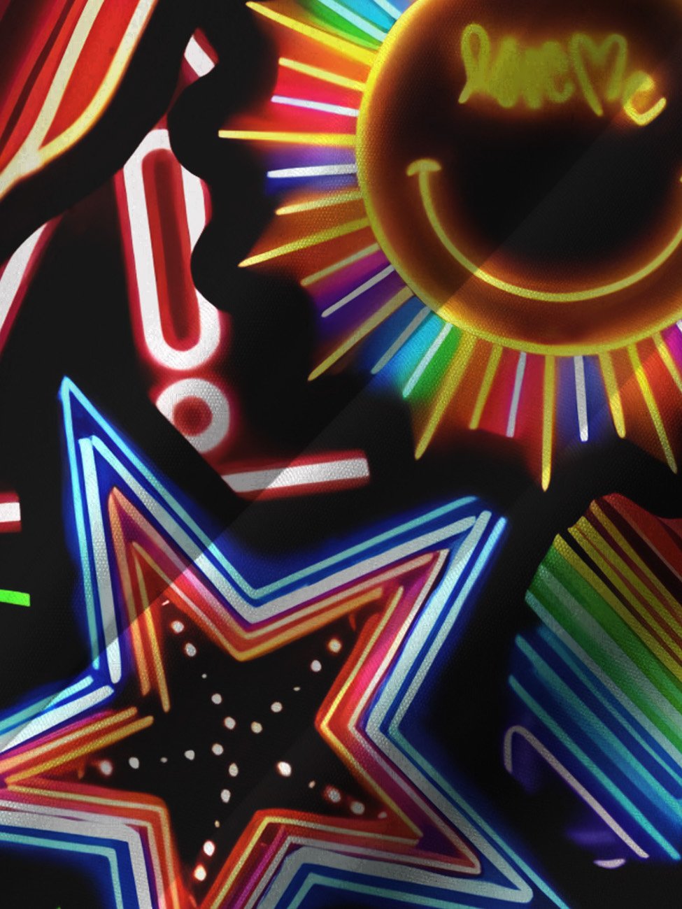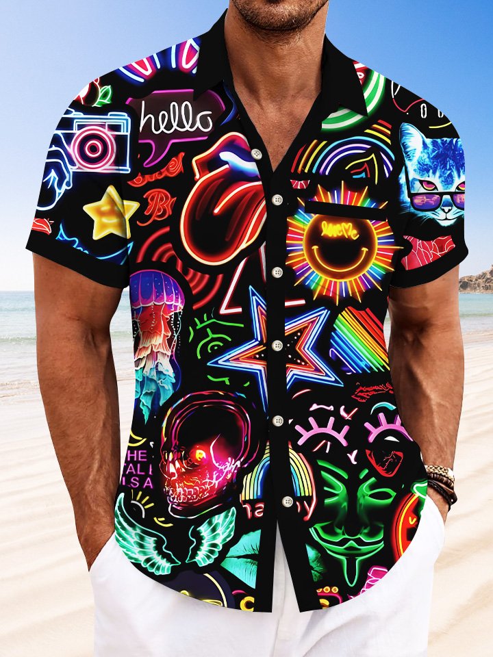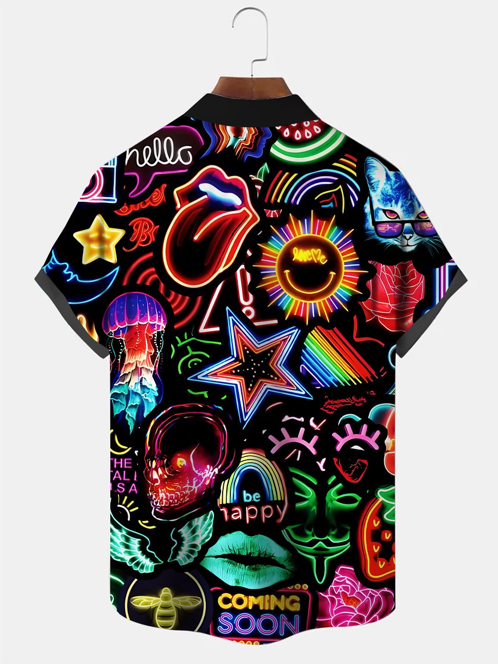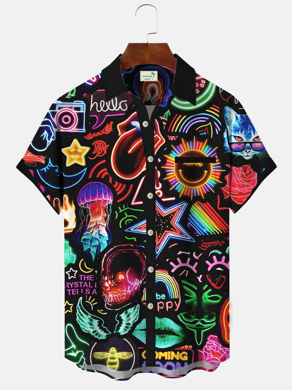 Alohadaddy Fluorescent Geometric Pattern Button Pocket Casual Short Sleeve Shirt