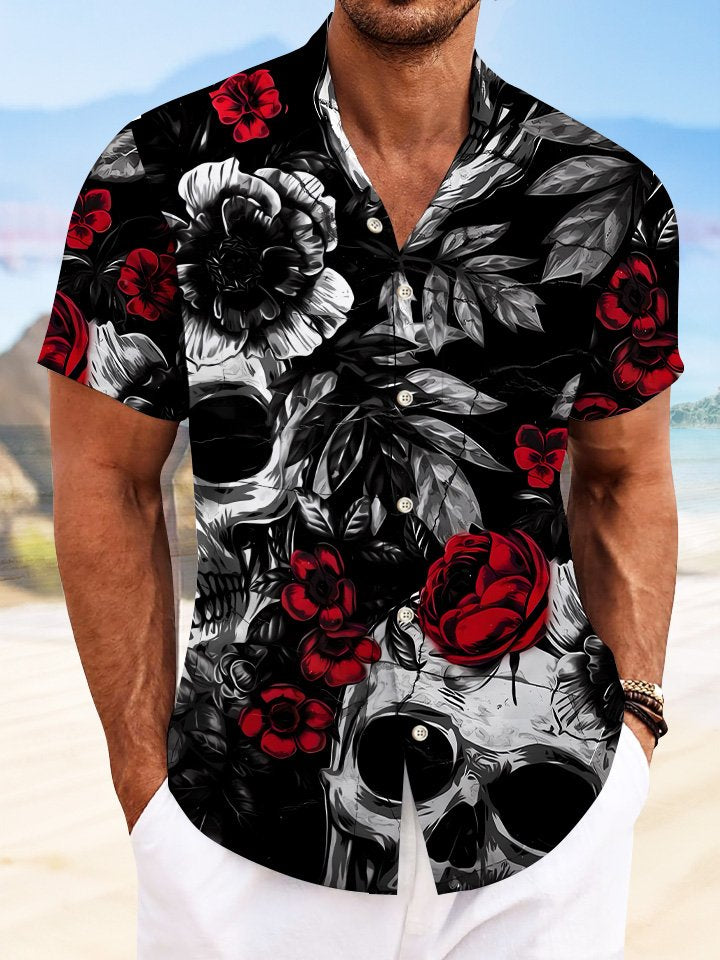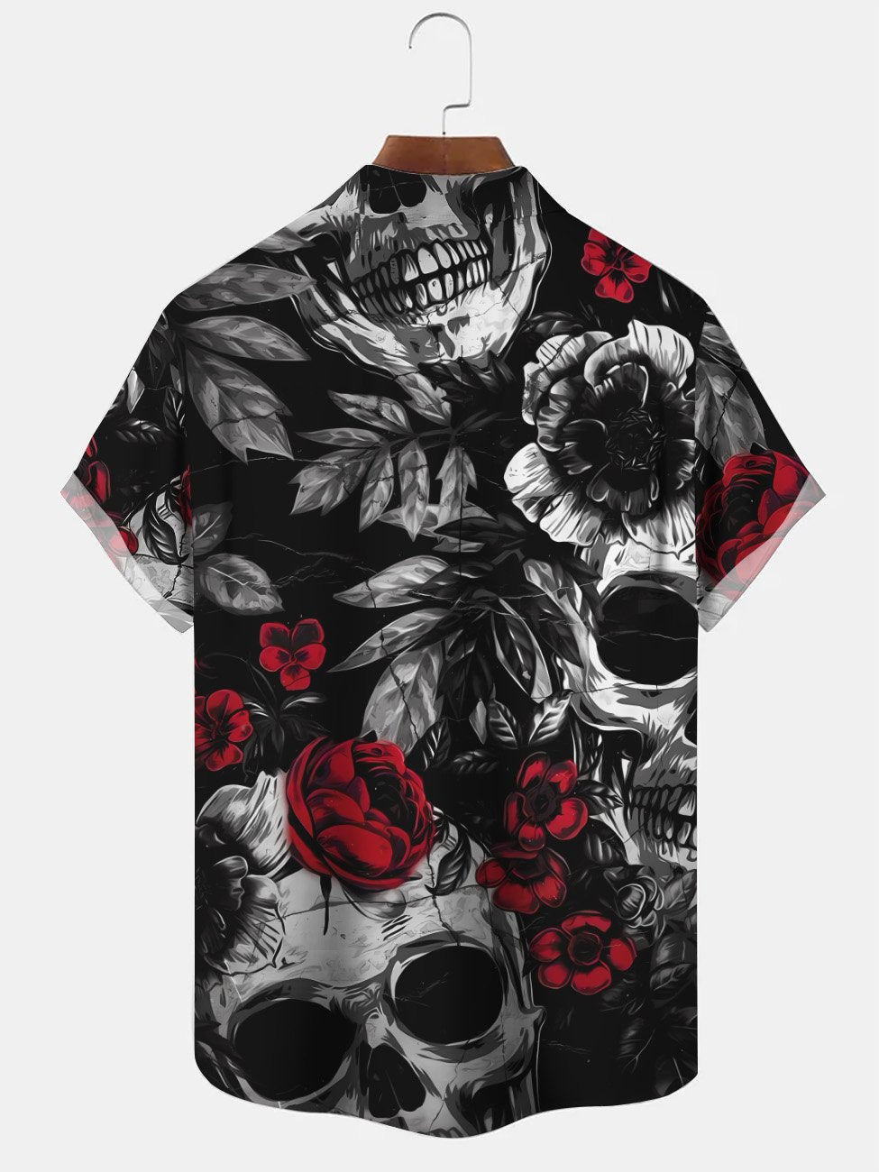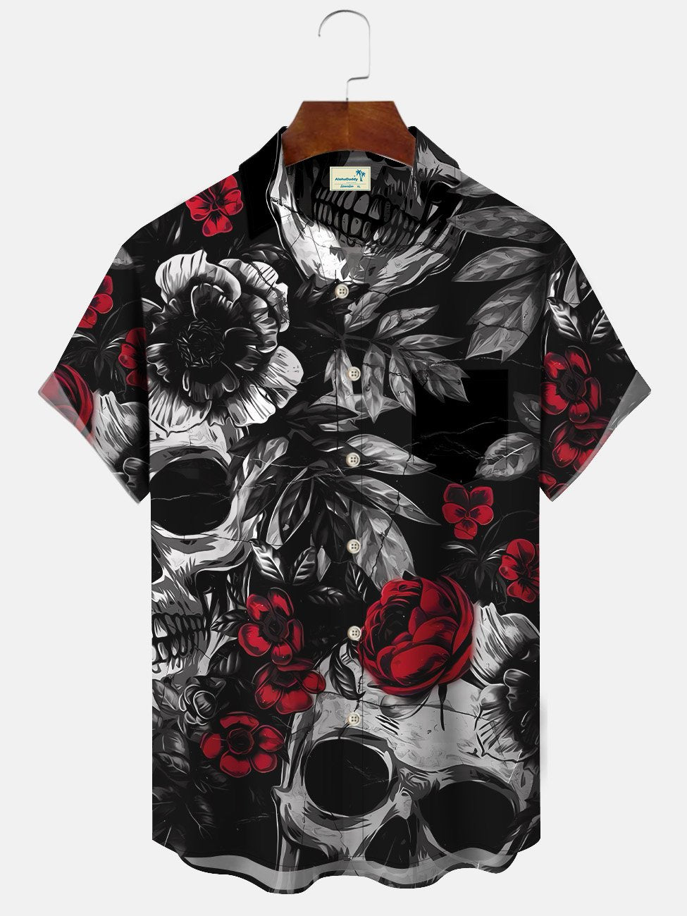 Alohadaddy Skull Rose Flower Mens Pocket Button Casual Short Sleeve Shirt