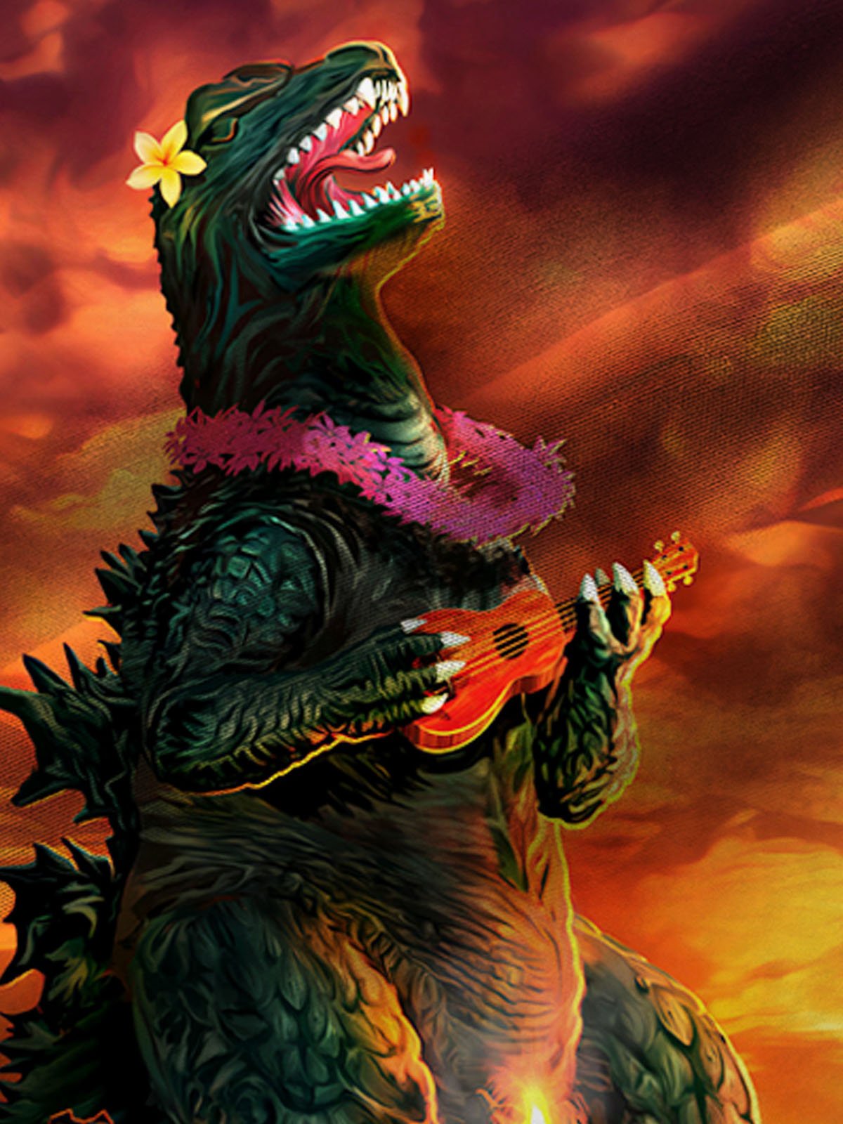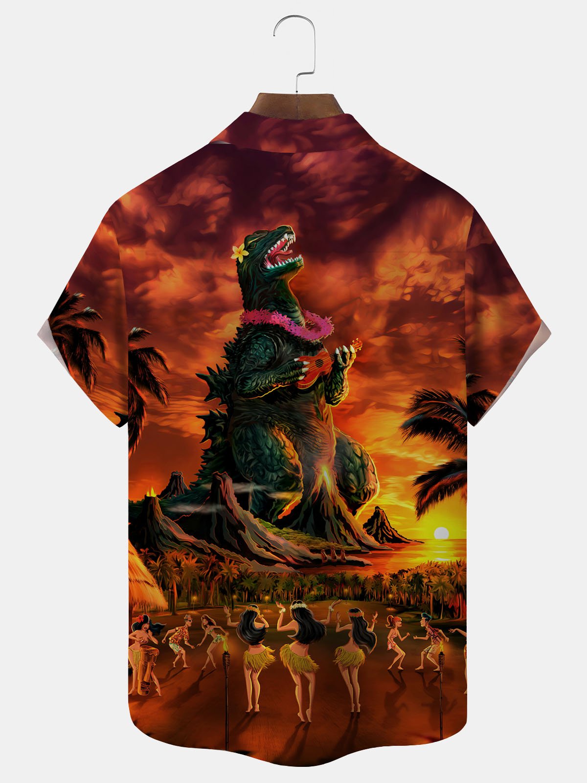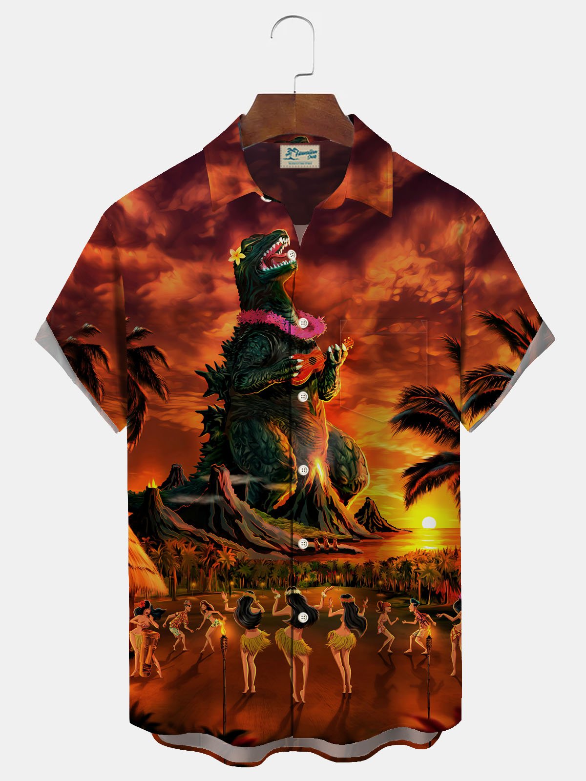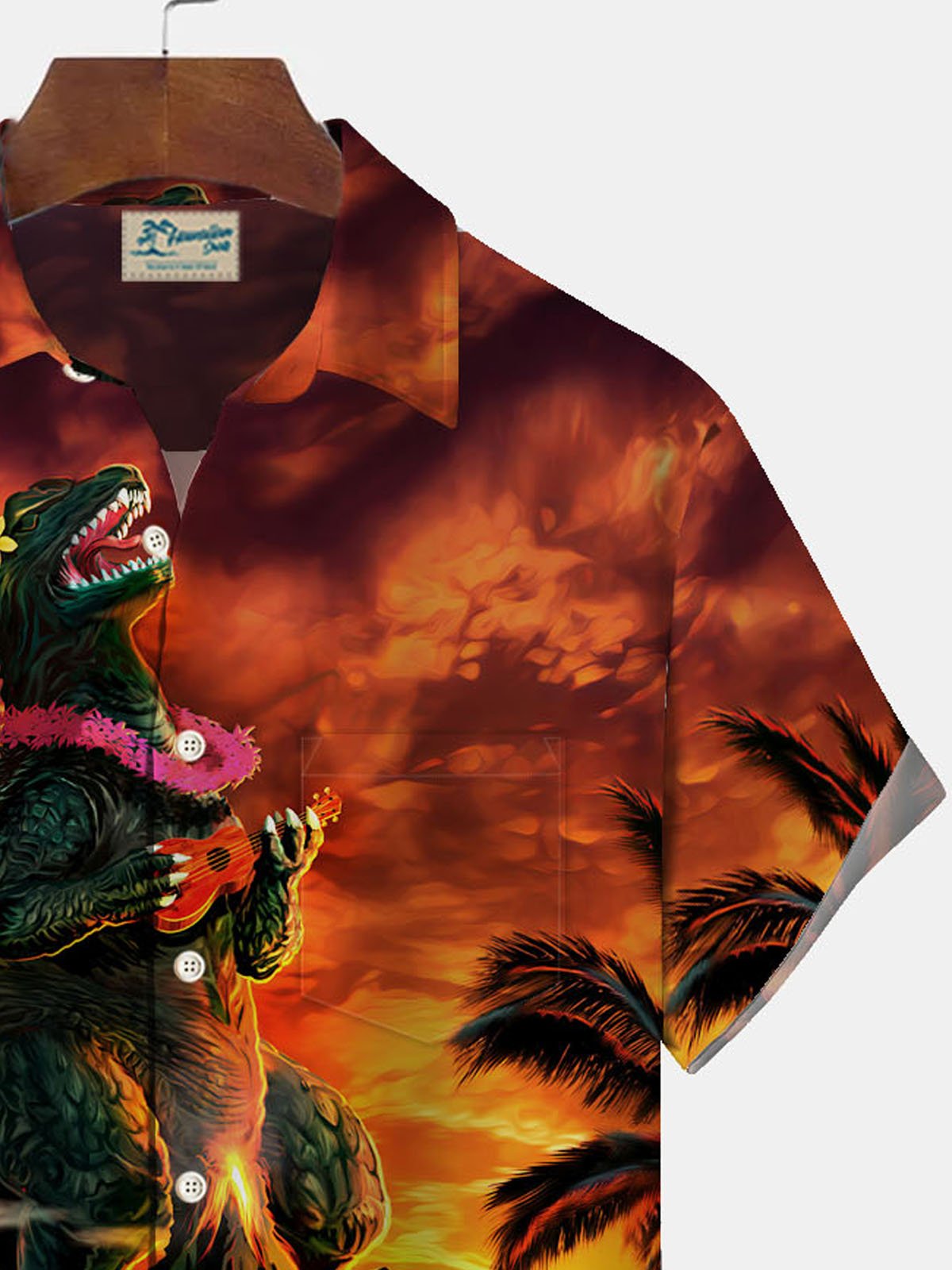 Alohadaddy Hawaiian Godzilla Monster Print Men's Button Down Pocket Shirt