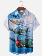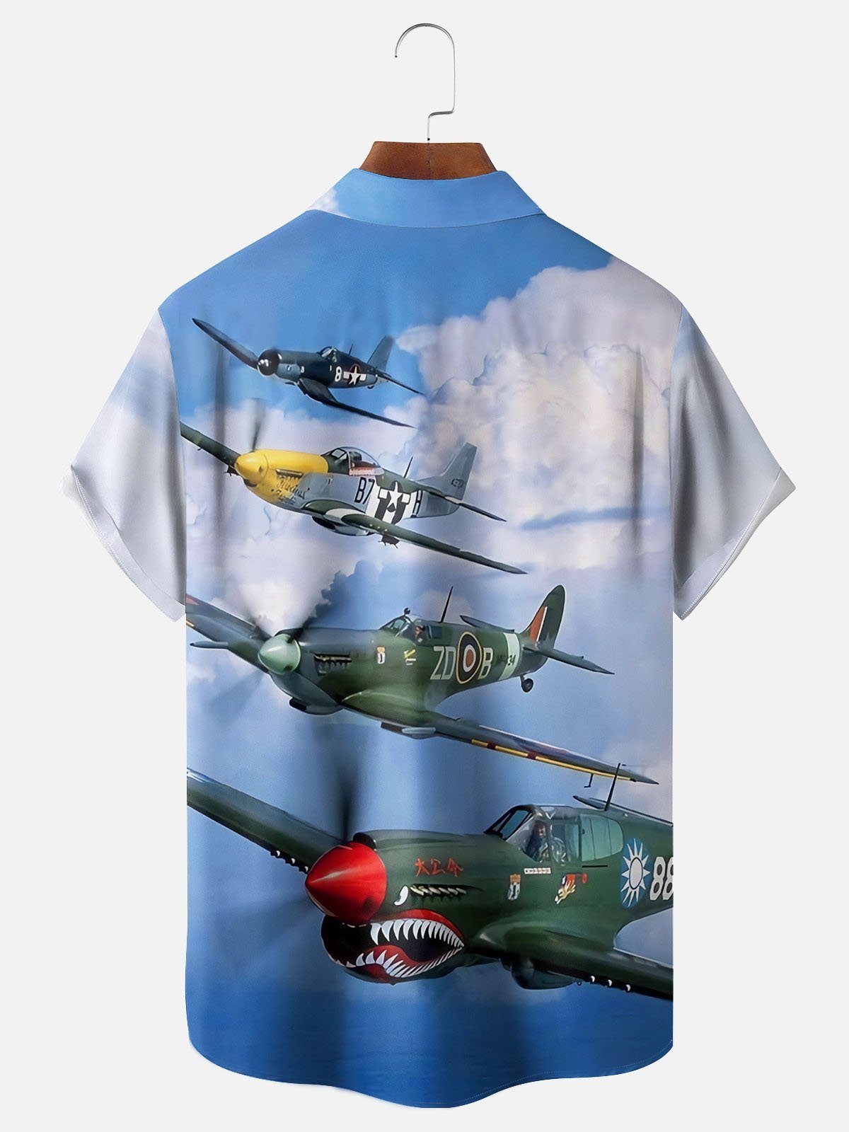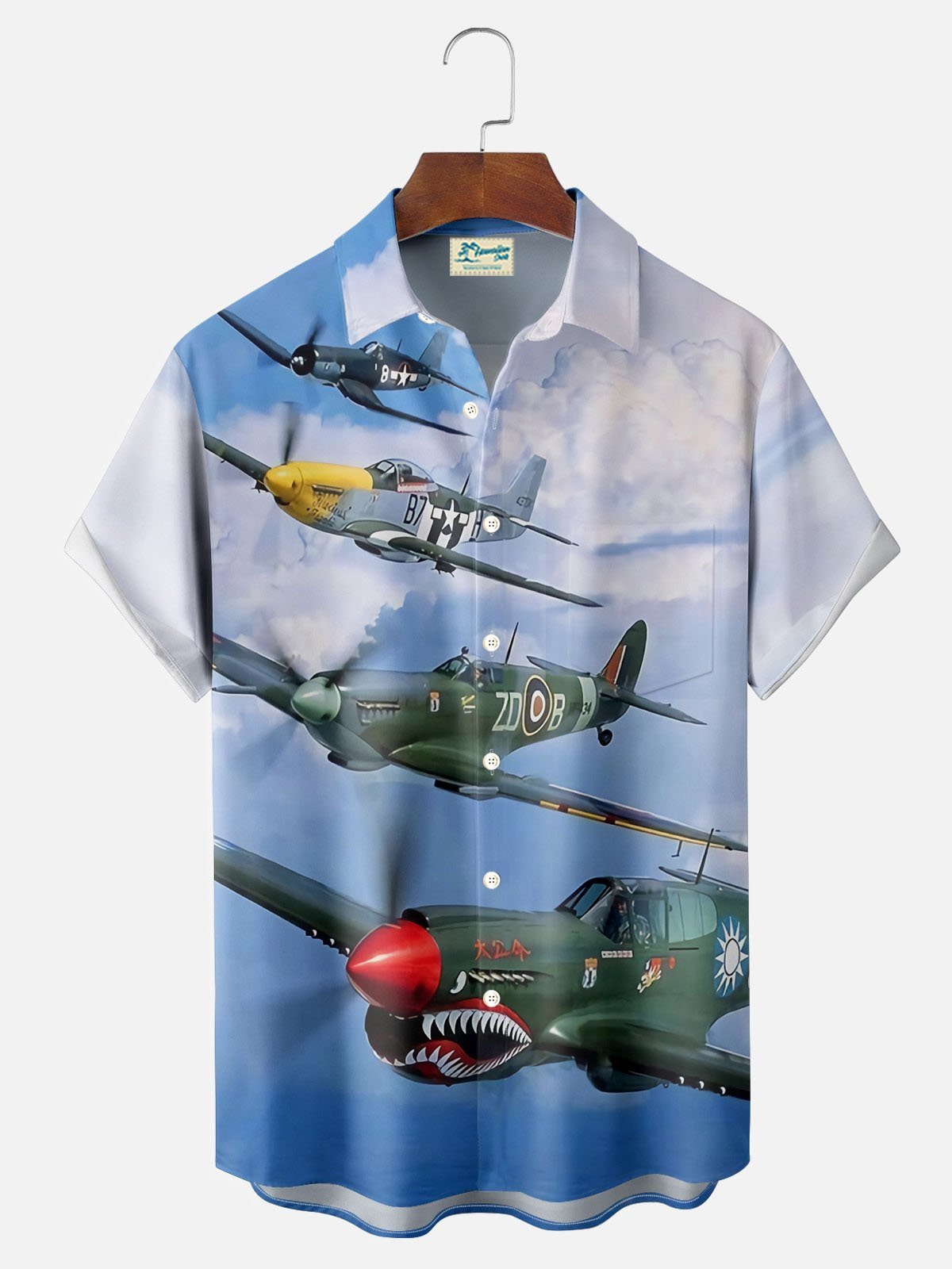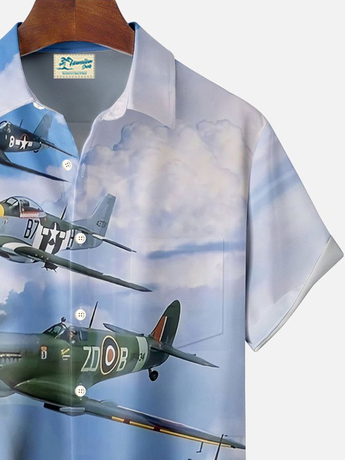 Alohadaddy Vintage Fighter Planes Print Men's Button Pocket Short Sleeve Shirt