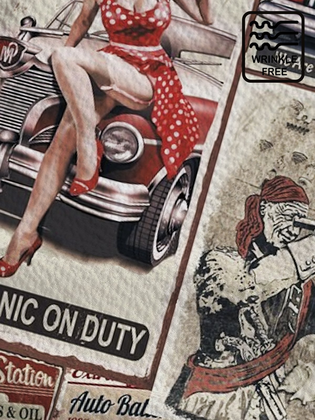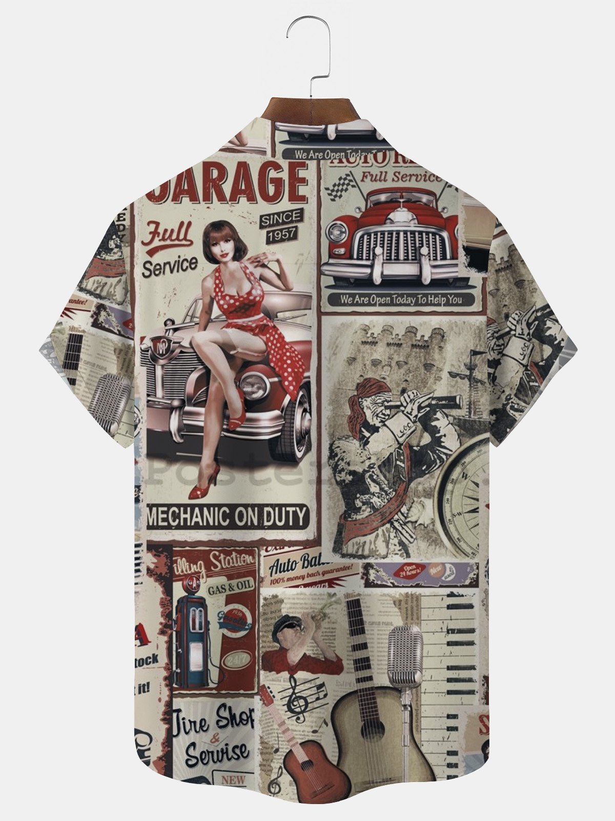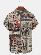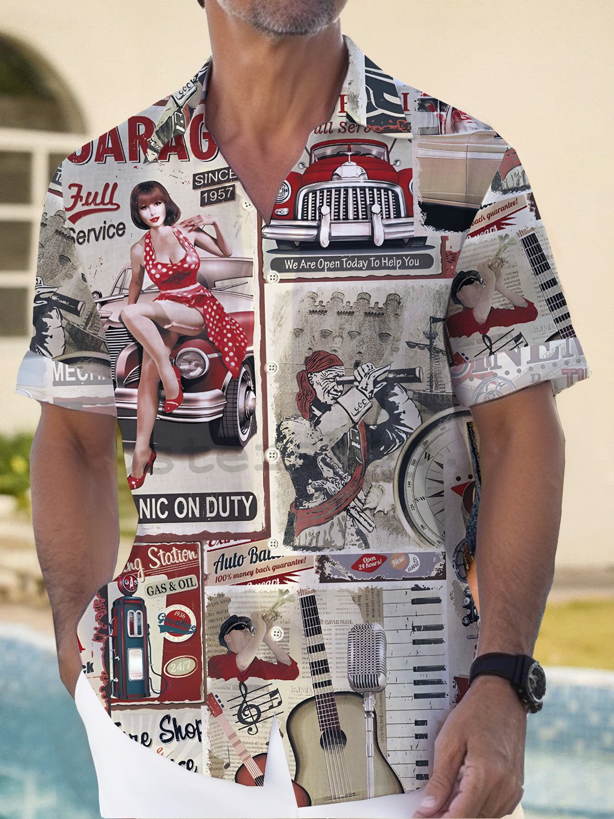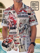 Alohadaddy 50's Vintage Car Men's Hawaiian Shirts Wrinkle Free Seersucker Retro Pin-up Girl Aloha Camp Pocket Shirts