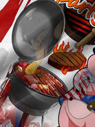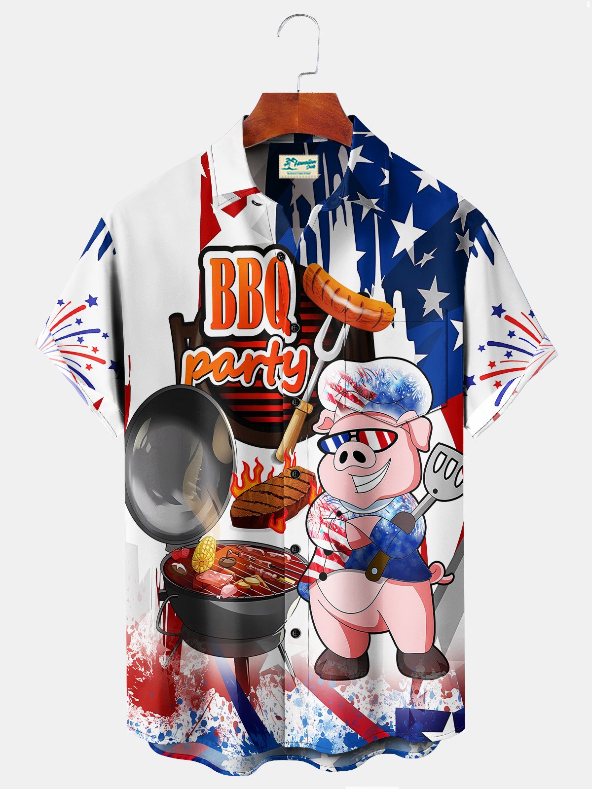 Alohadaddy BBQ Party Blue Men's Hawaiian Shirts Cartoon Pig American Flag Fireworks Stretch Plus Size Aloha Camp Pocket Shirts