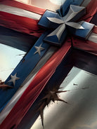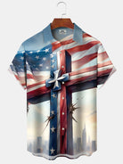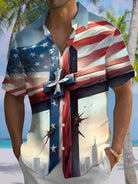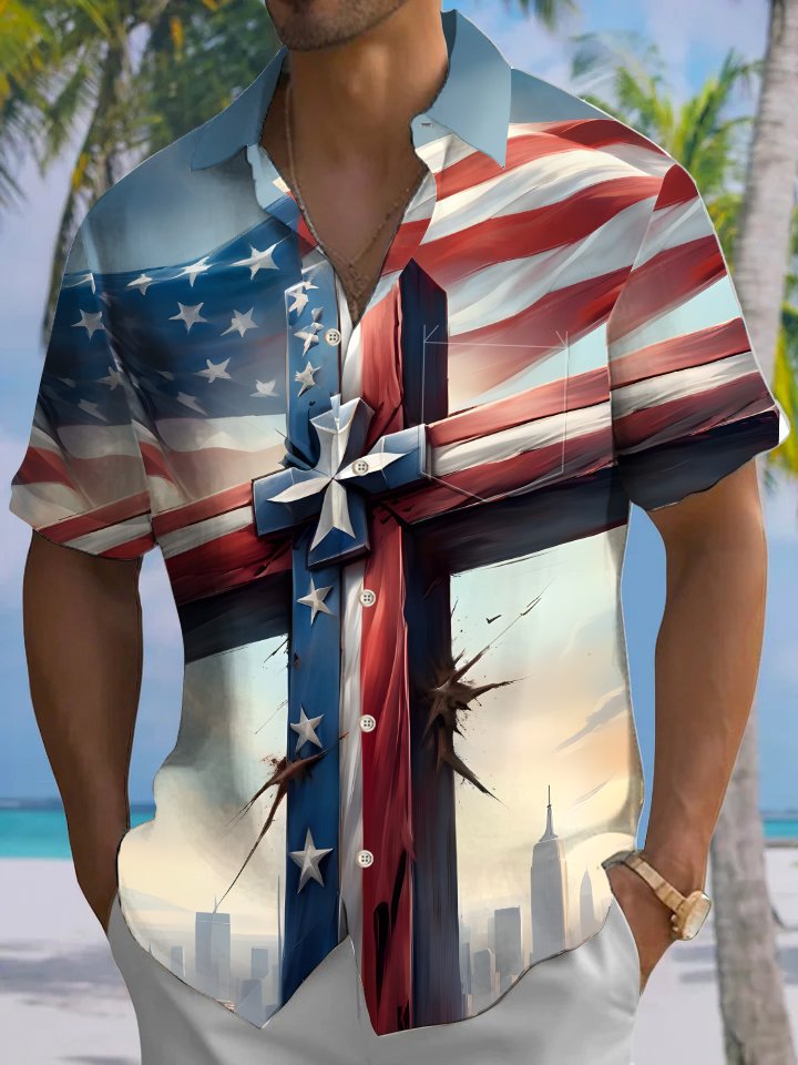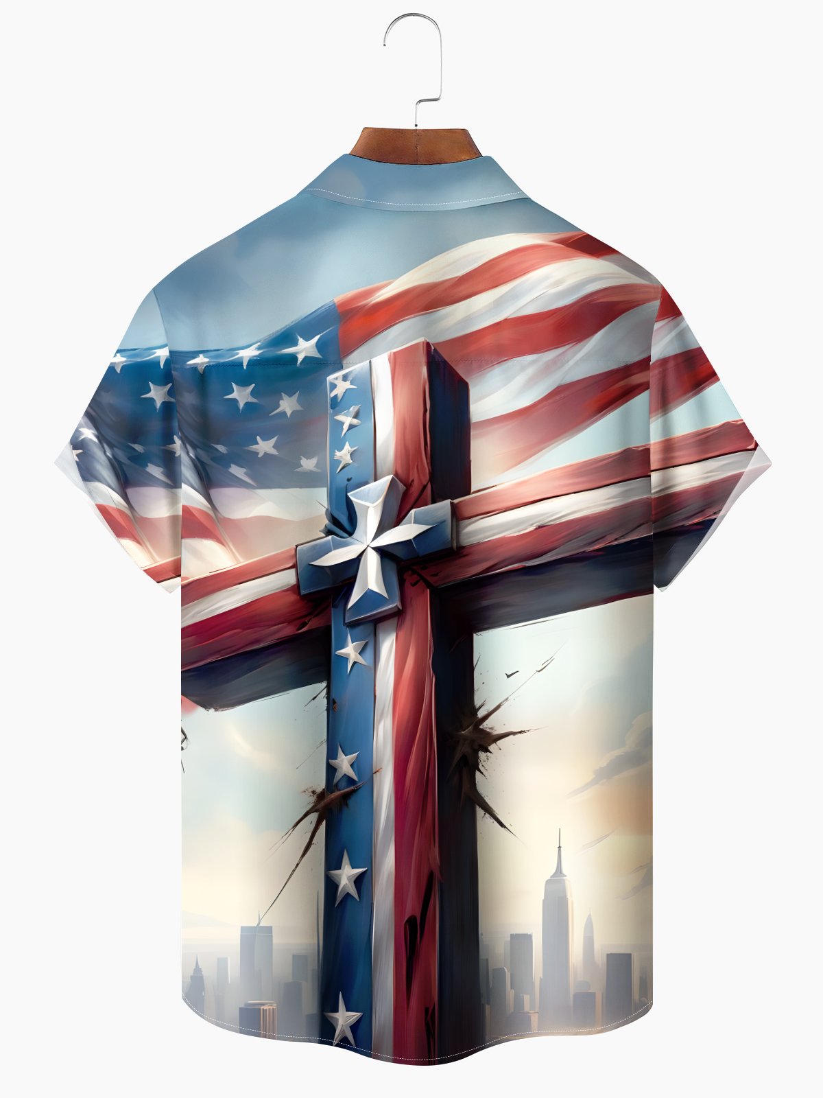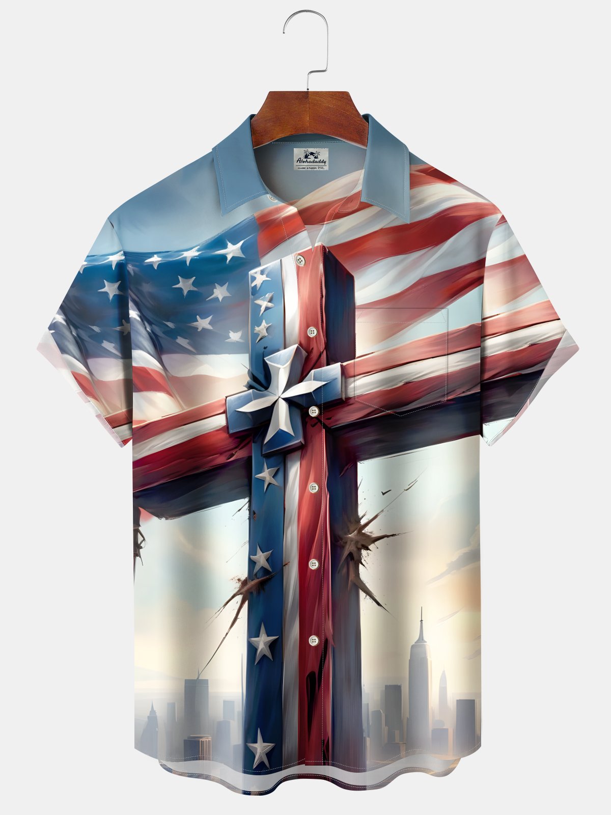 Alohadaddy Holiday Collection American Flag Cross Print Art Button Pocket Cardigan Stretch Oversized Short Sleeve Shirt