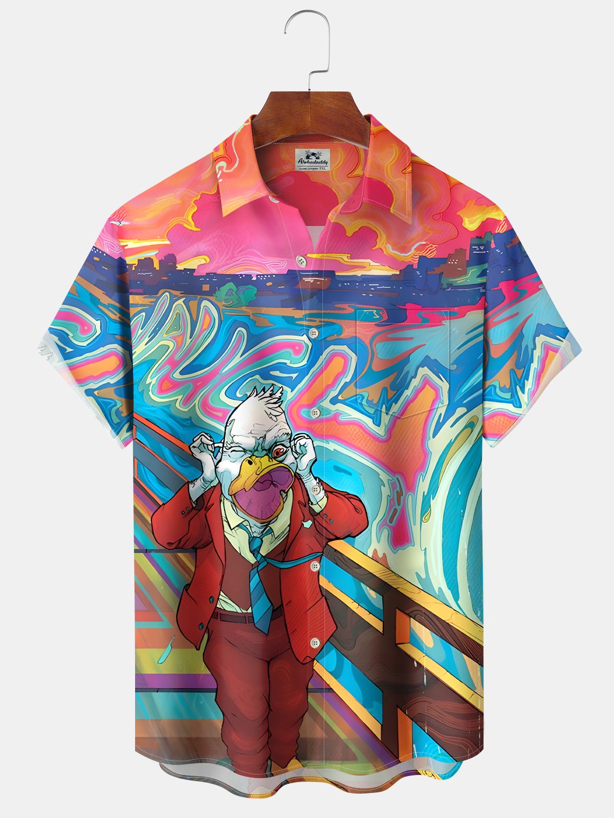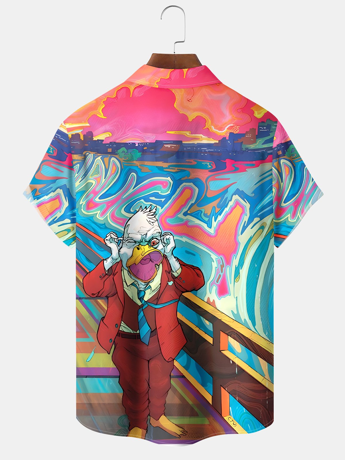 Alohadaddy® 1970s Retro Animation Cartoon Funny Oil Painting Screaming Duck Pocket Shirt