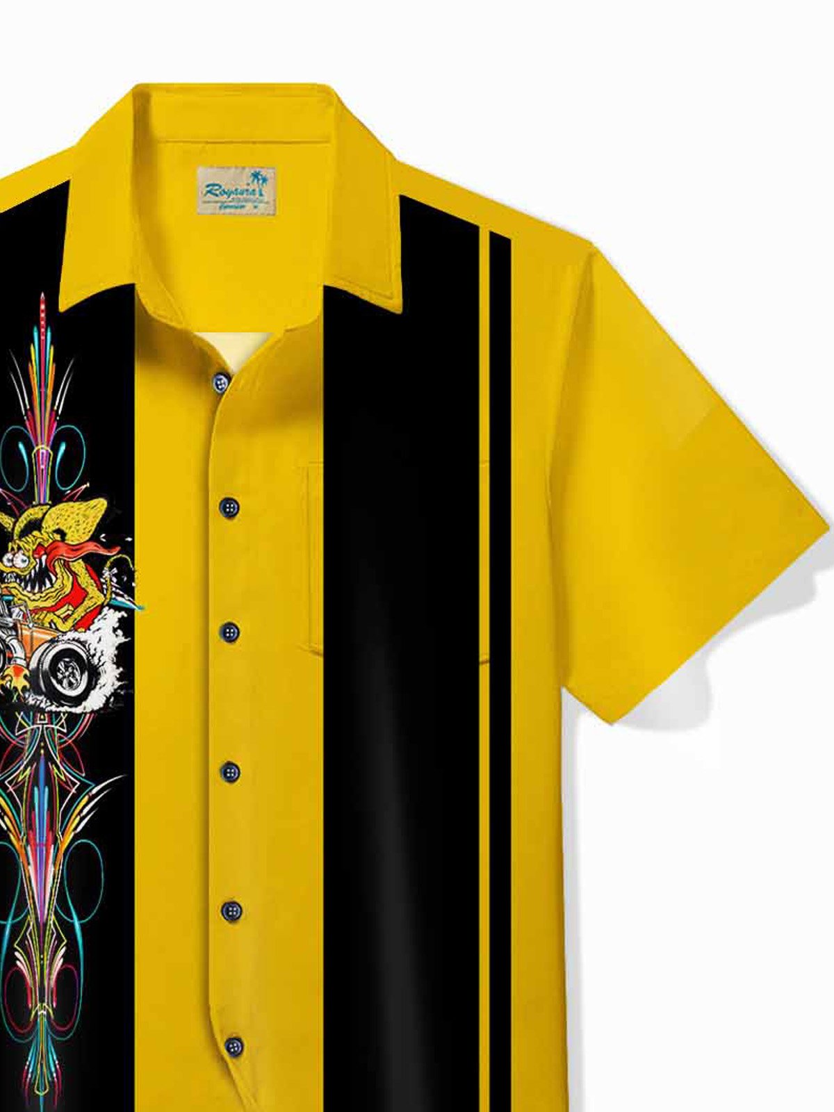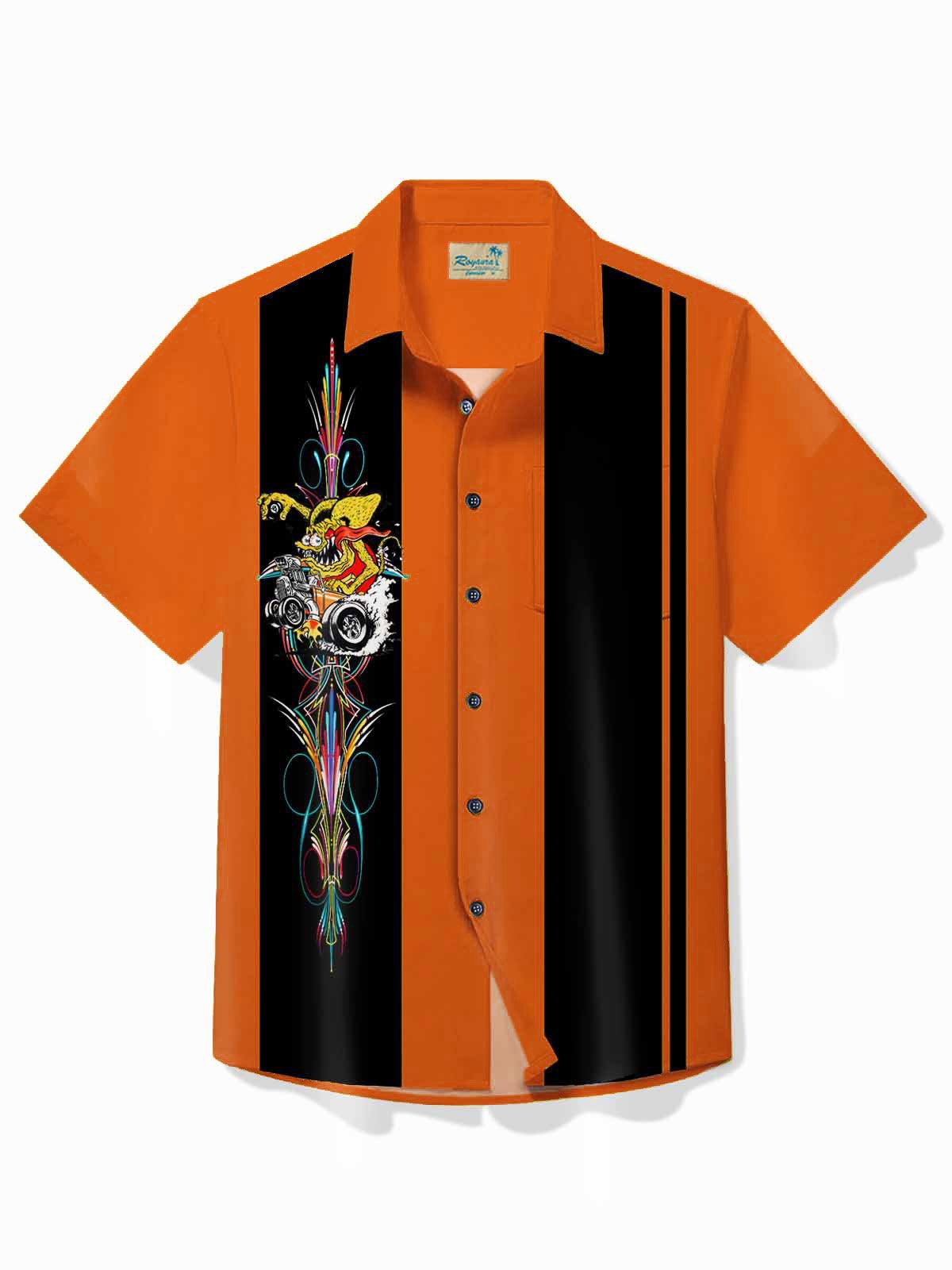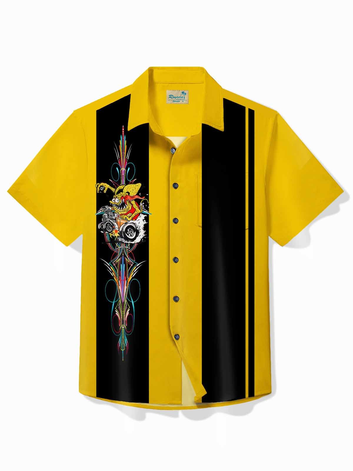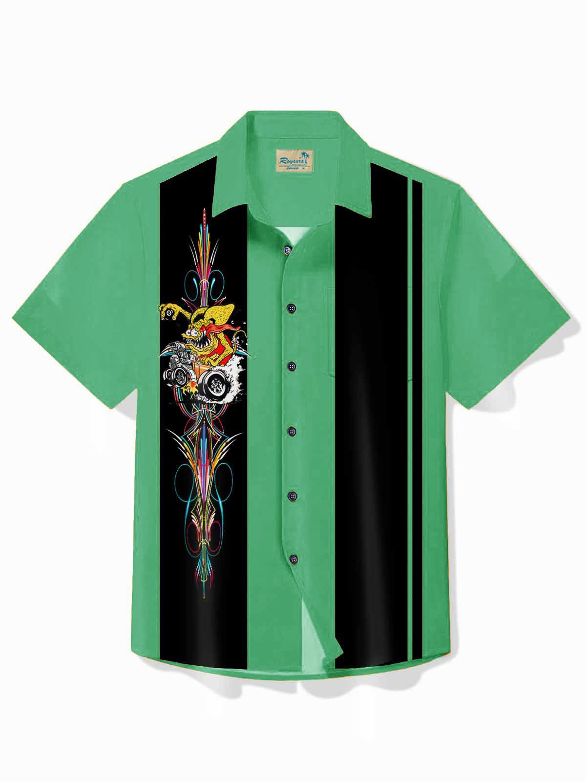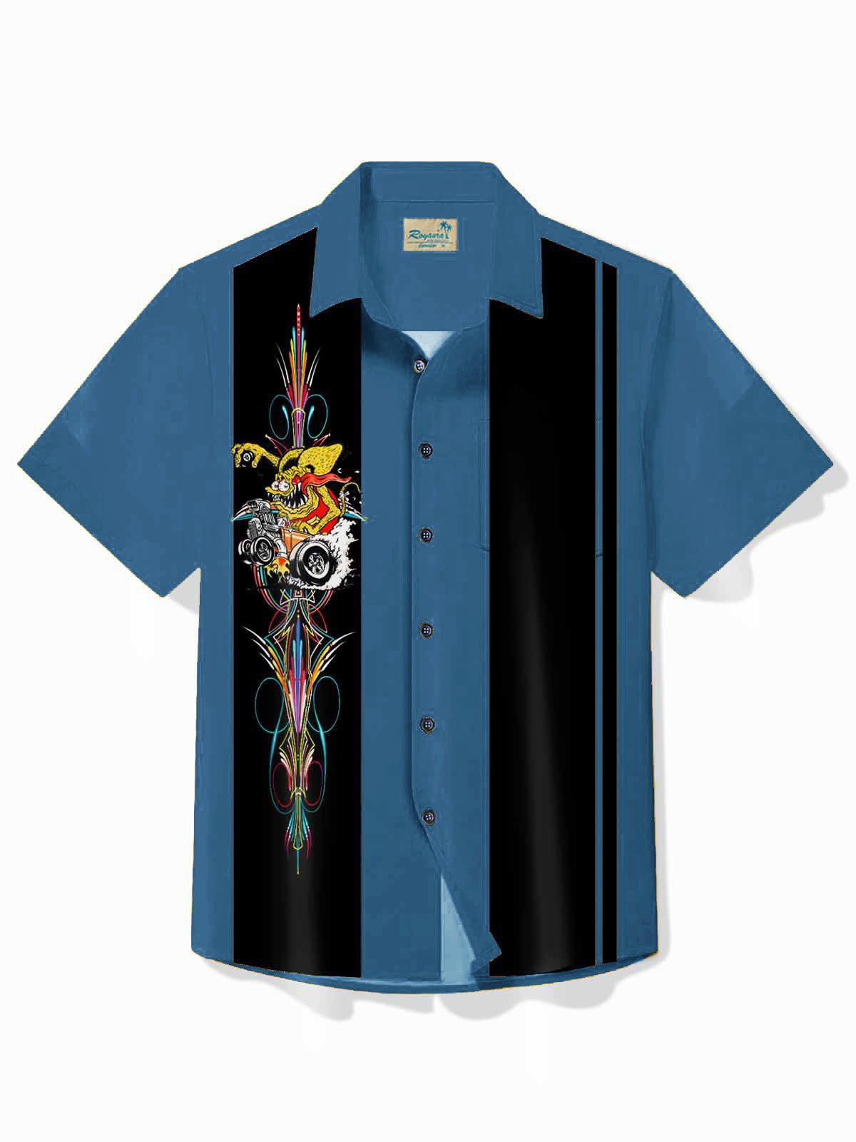 Alohadaddy 50's Retro Pinstripe Car Men's Bowling Shirt Cartoon Art Stretch Pocket Camp Shirt Big Tall