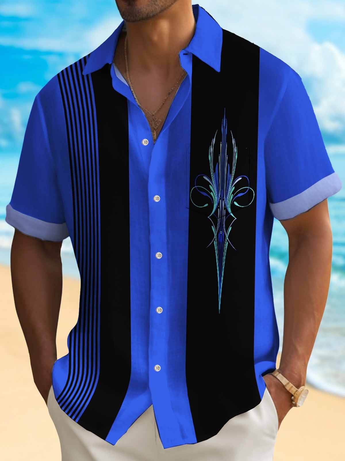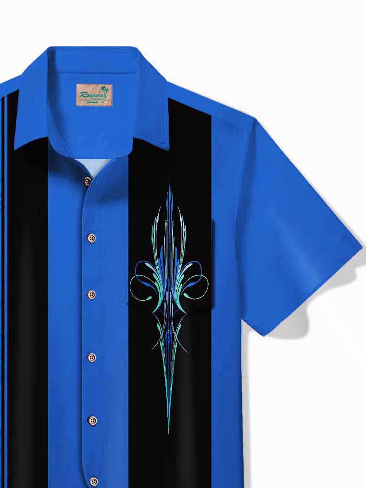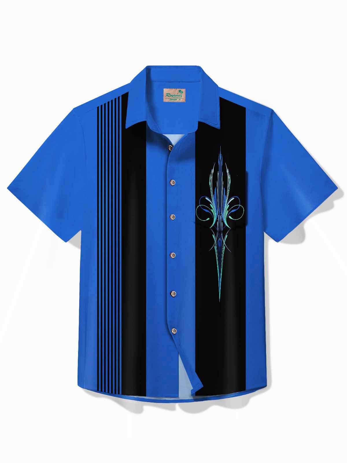 Alohadaddy 50's Retro Pinstripe Car Men's Bowling Shirt Cartoon Art Stretch Pocket Camp Shirt Big Tall