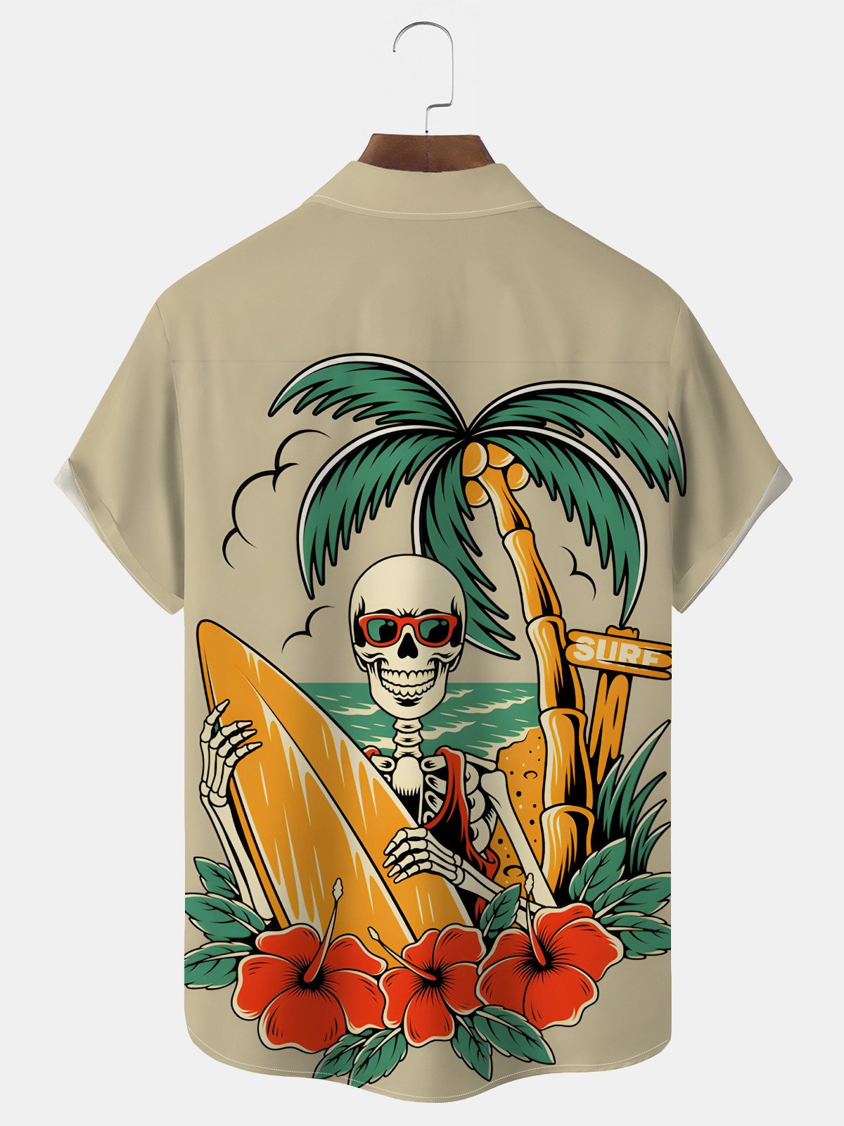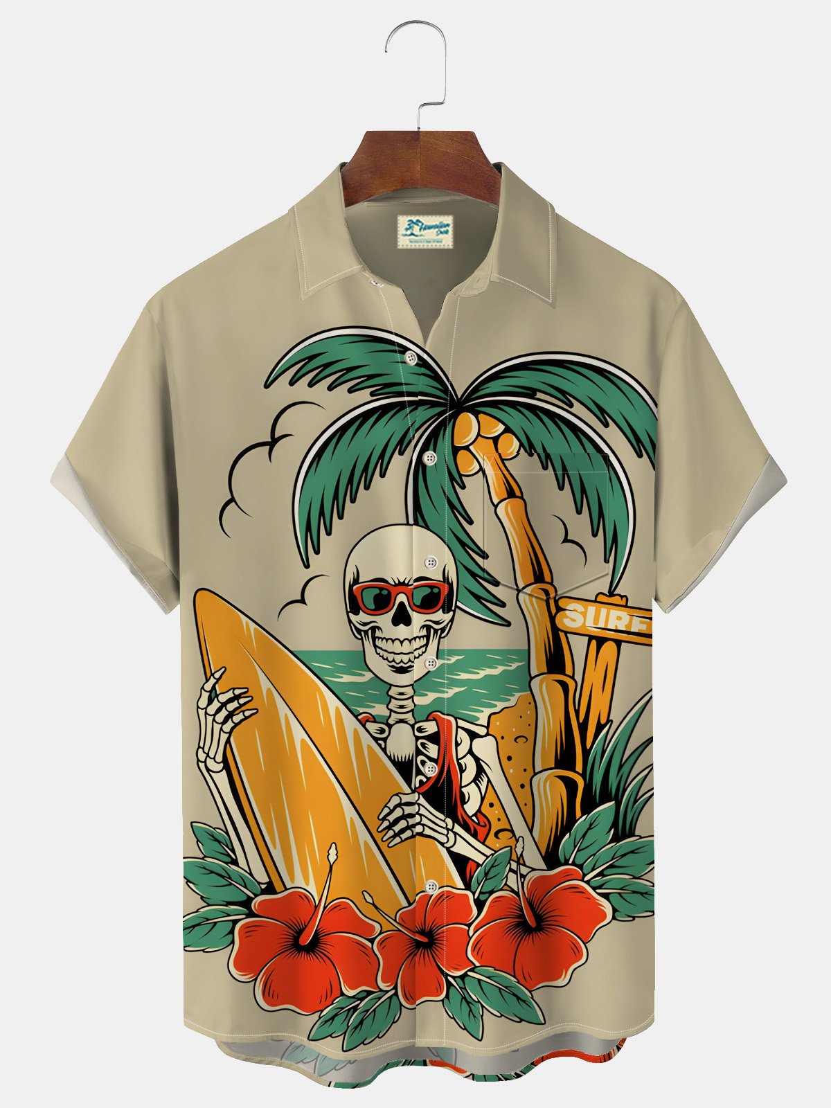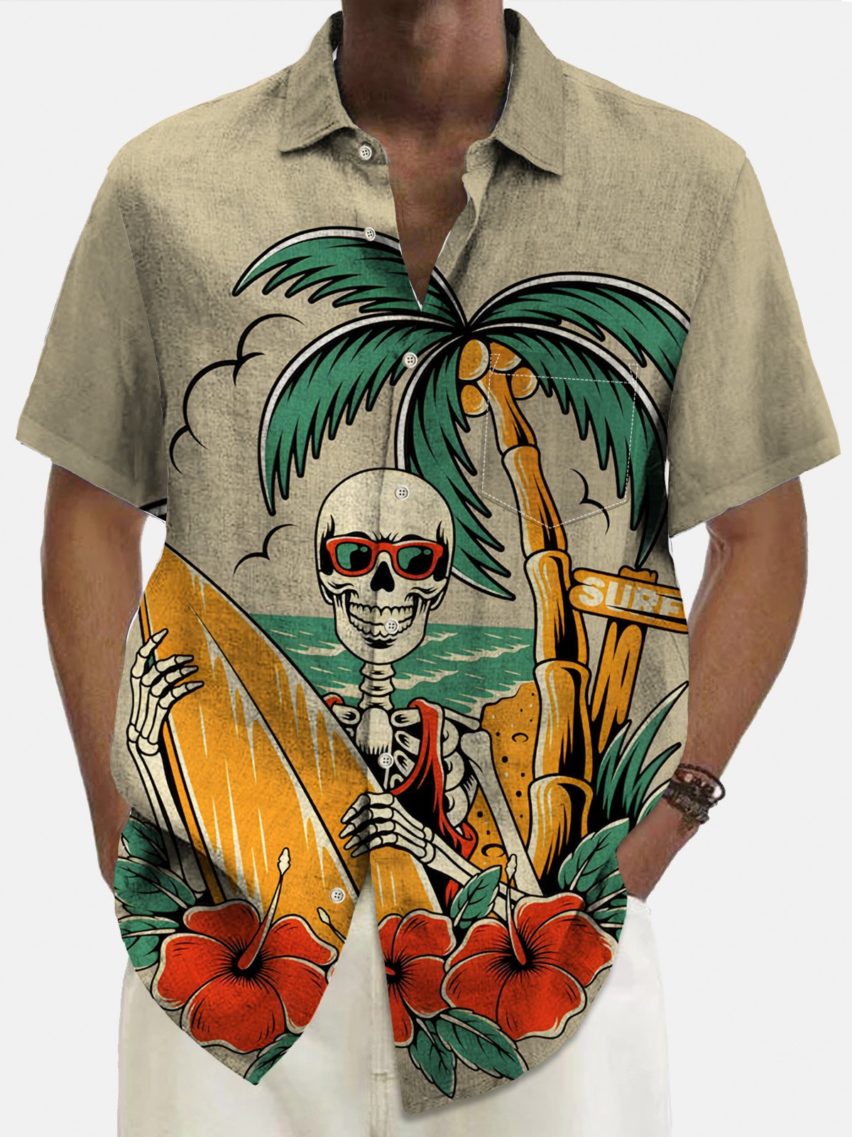 Alohadaddy Hawaiian Coconut Tree Skull Surf Print Men's Button Pocket Shirt