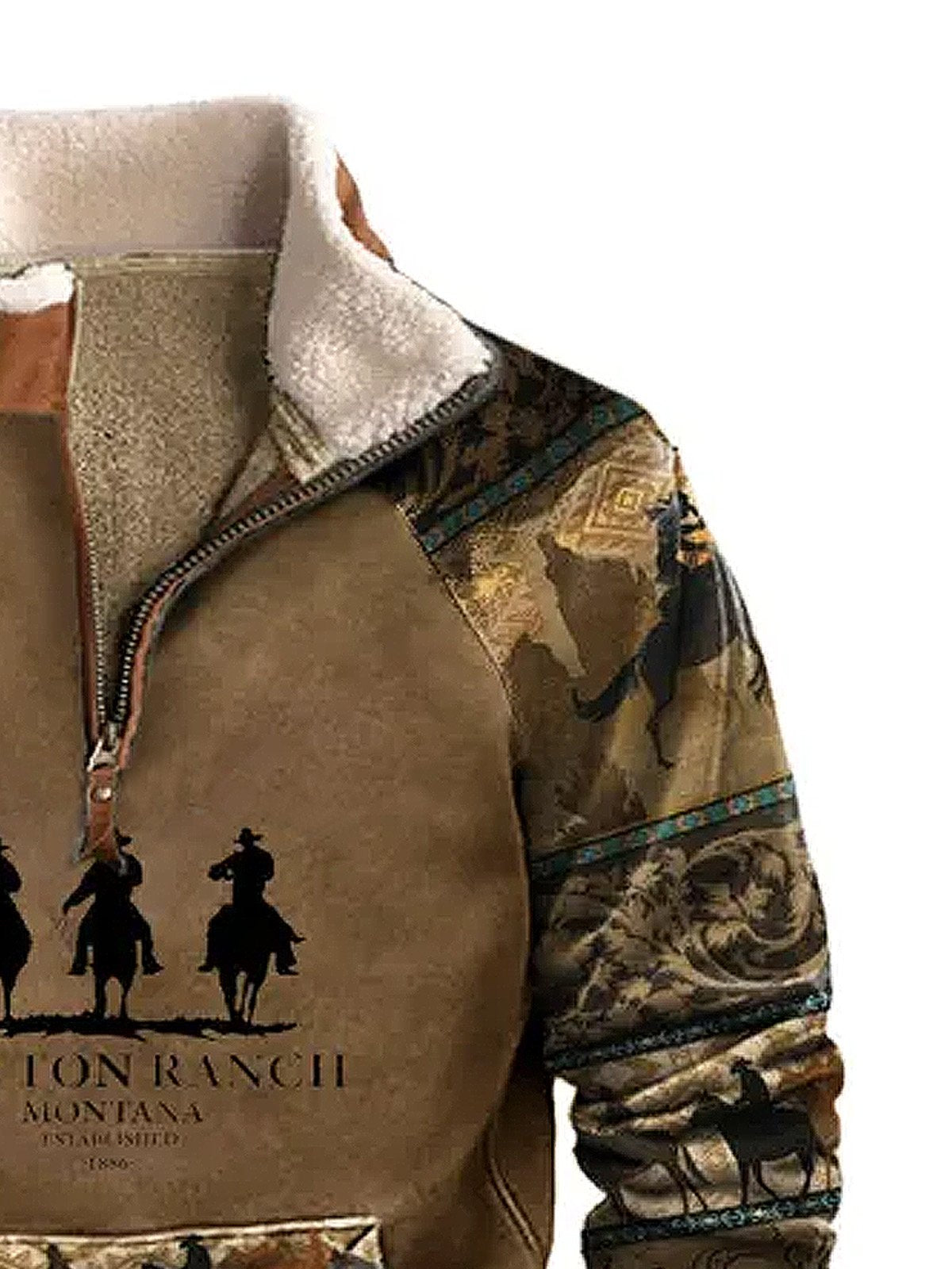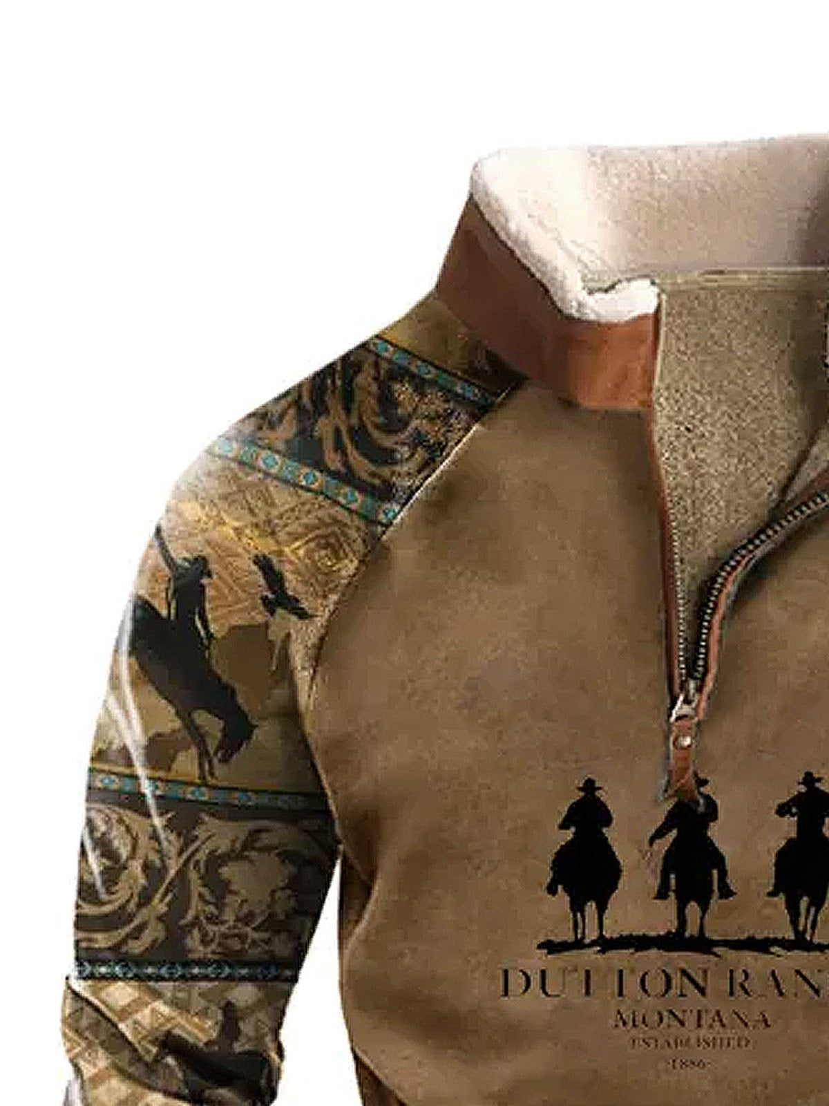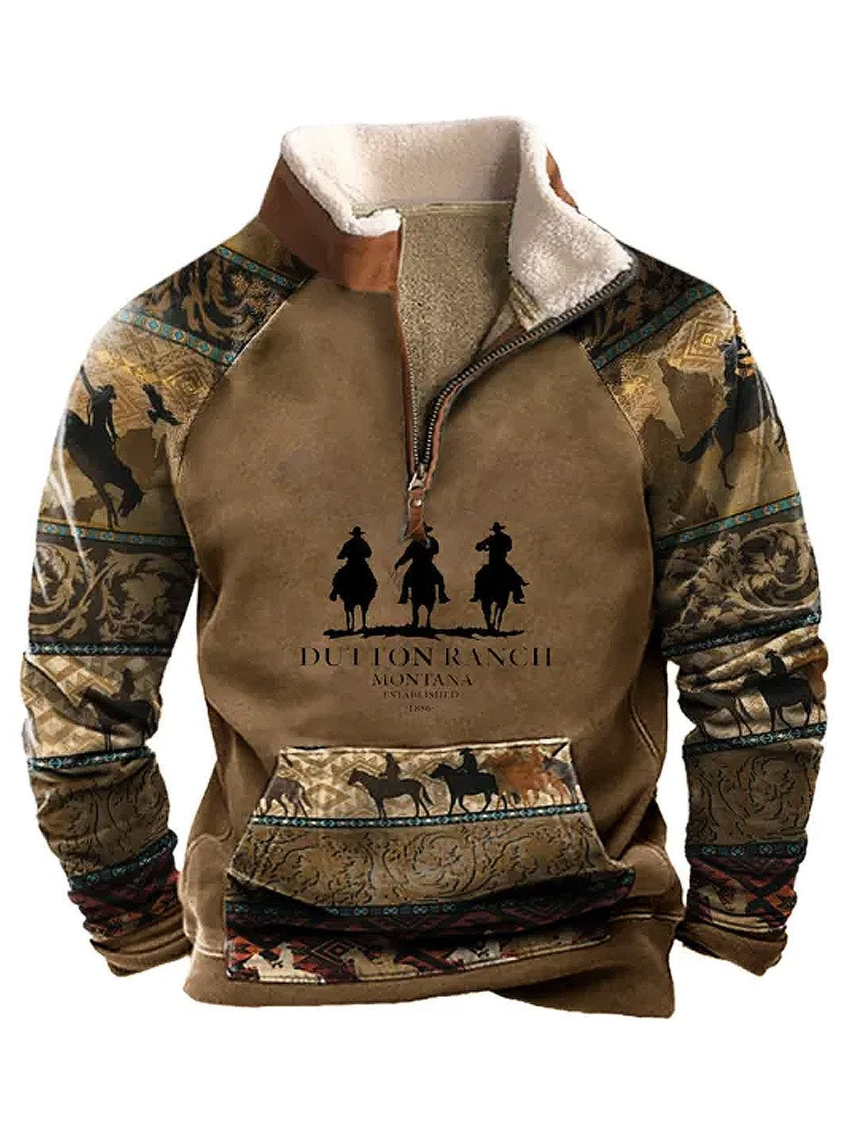 Alohadaddy Men's Vintage Bulls Park Print Warm Button Stand Collar Sweatshirt