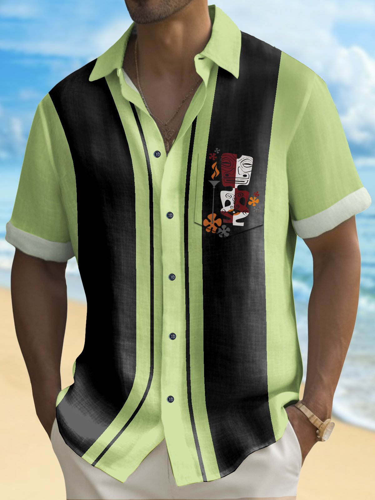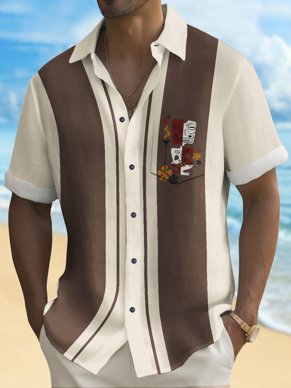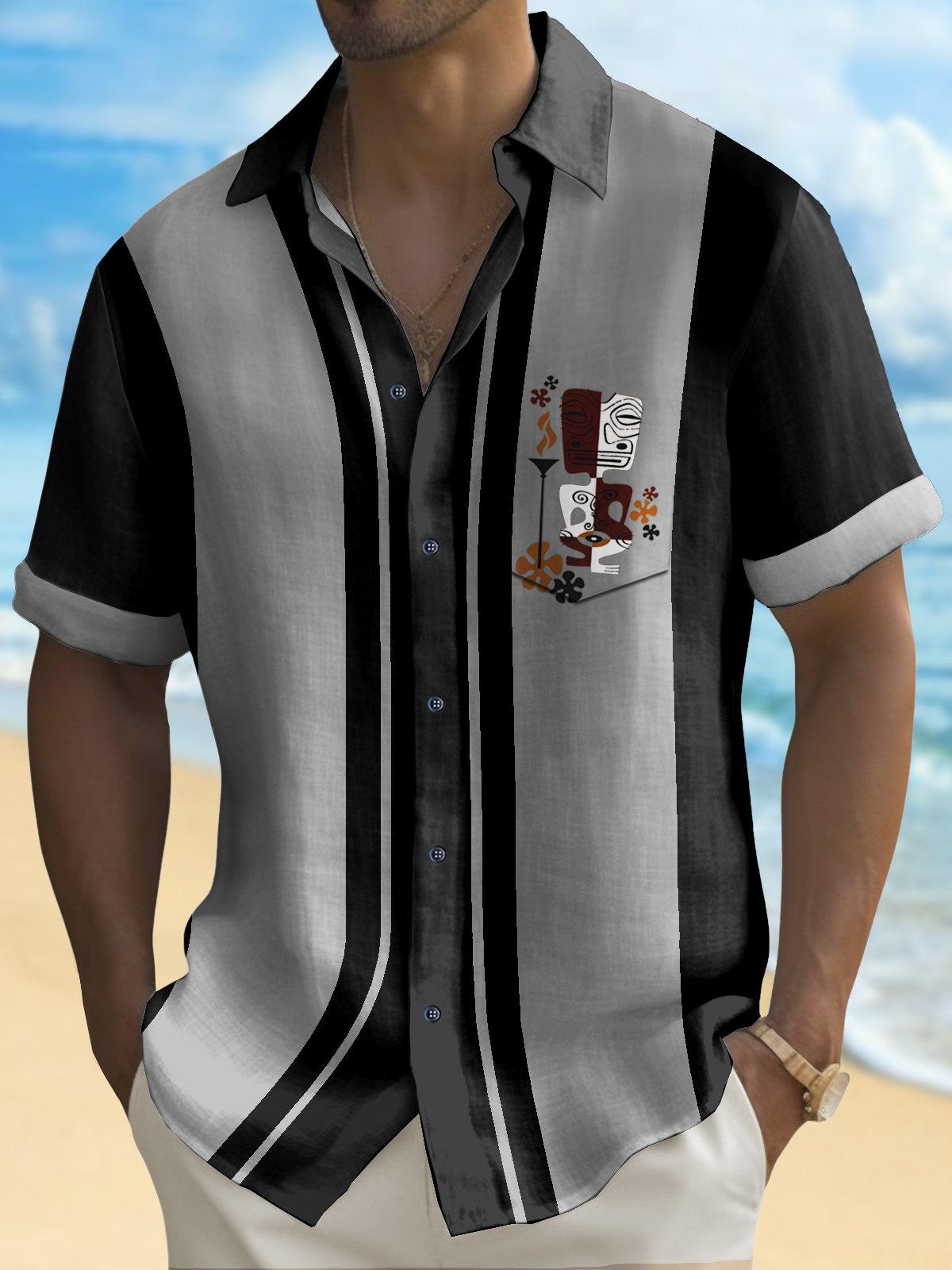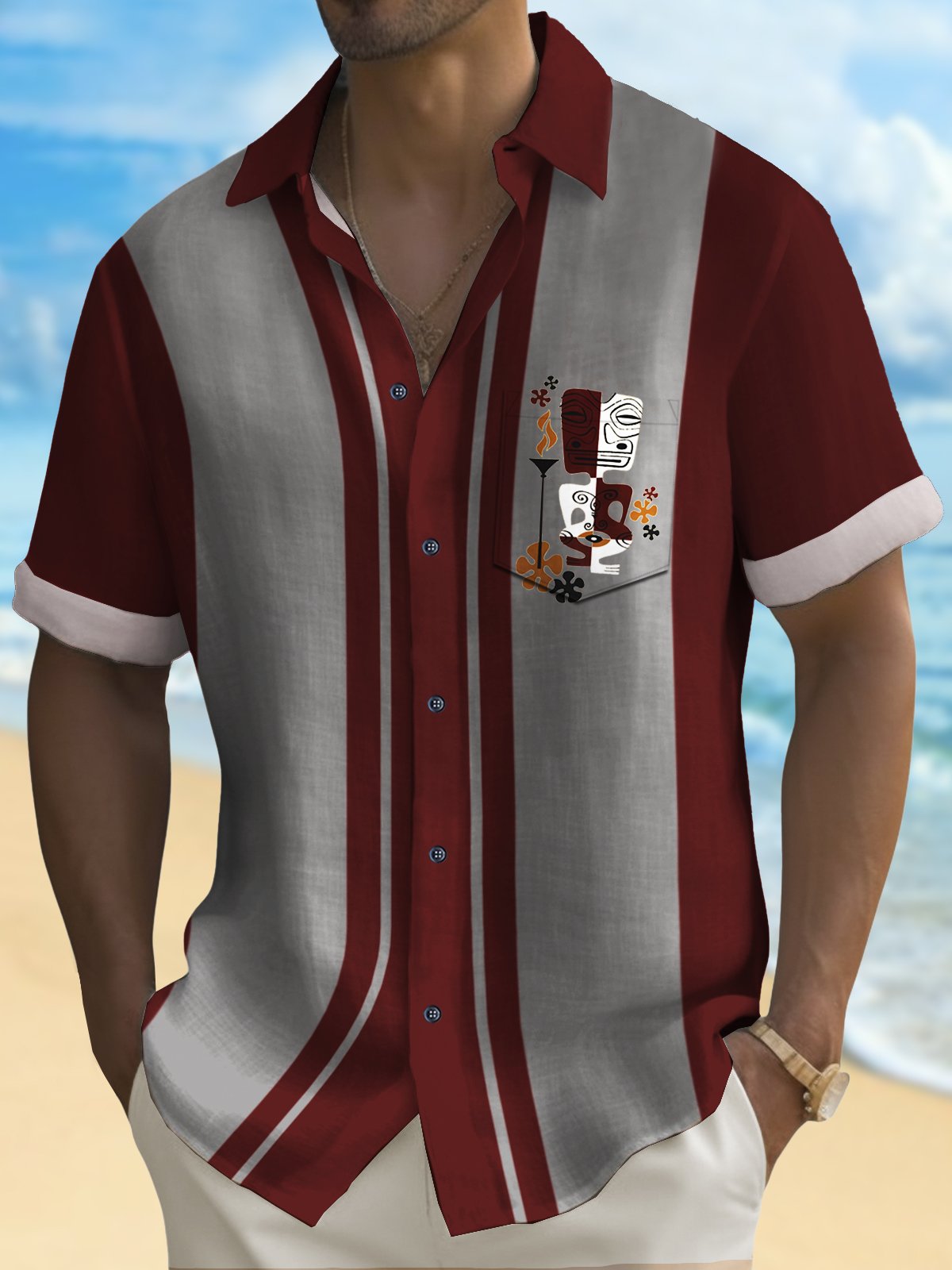 Alohadaddy Retro Bowling Men's Hawaiian Shirt Tiki Print Pocket Camping Shirt