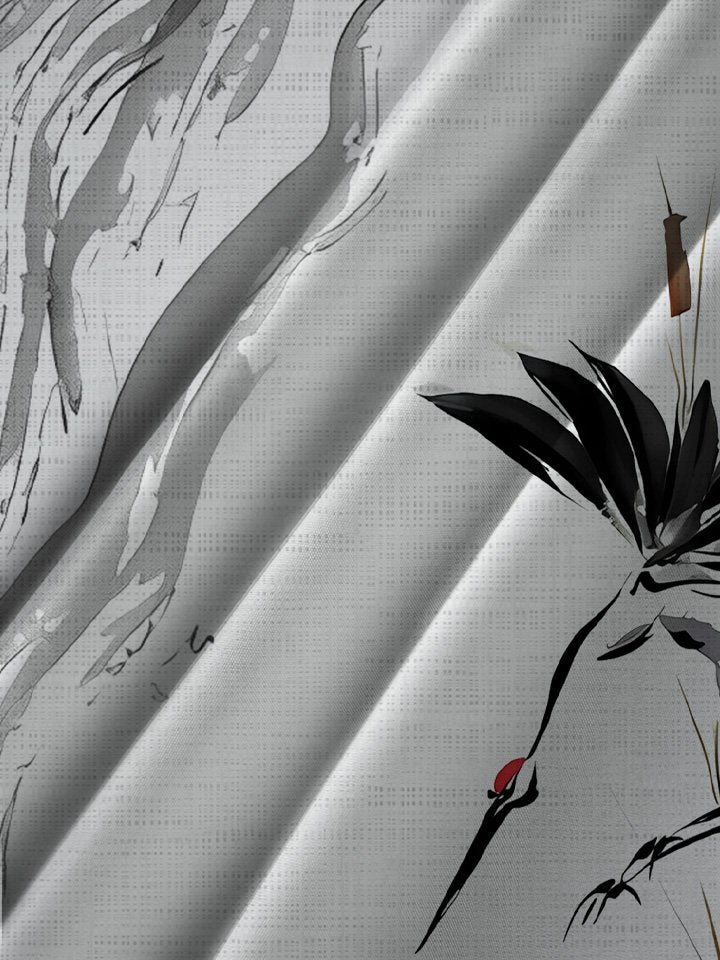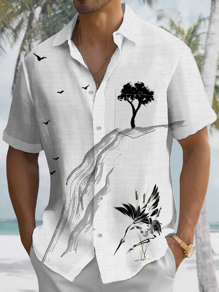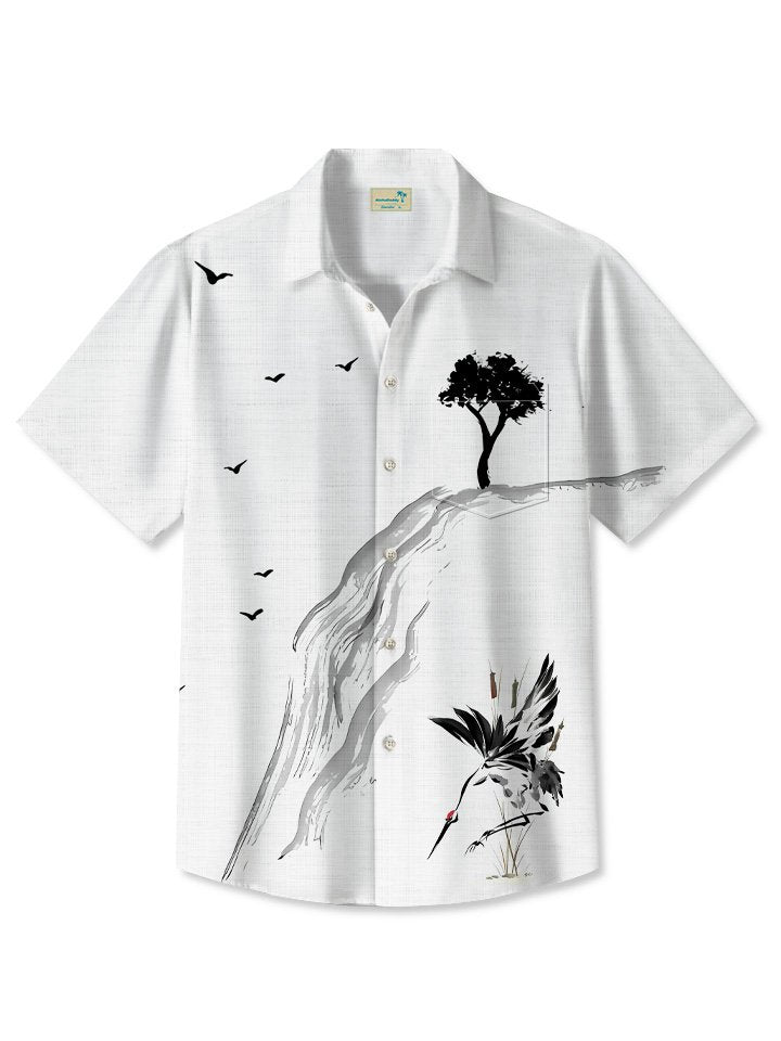 Alohadaddy Summer Plants Cranes Trees Ink Painting Bamboo Commuting Buttons Pockets Men 50s Vintage Bowling Shirt