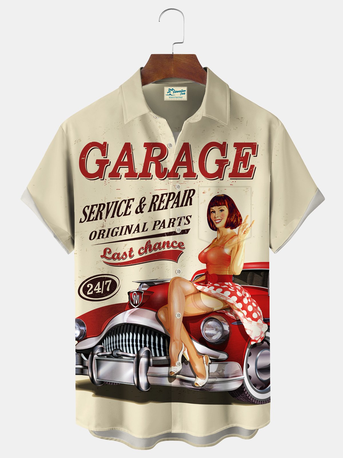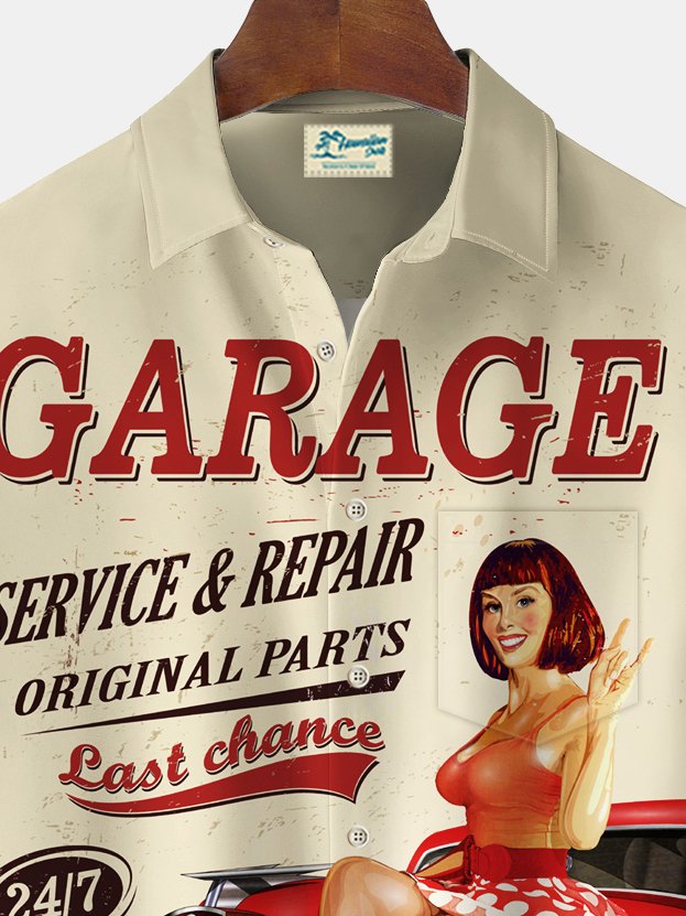 Alohadaddy Vintage Car Girl Poster Print Men's Chest Pocket Stretch Shirt Big Tall