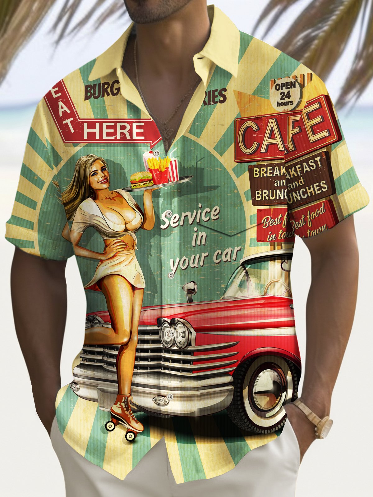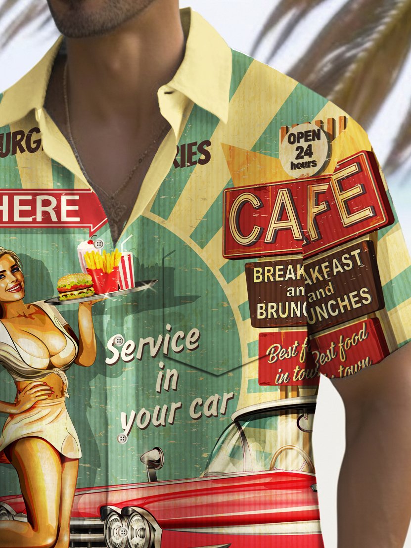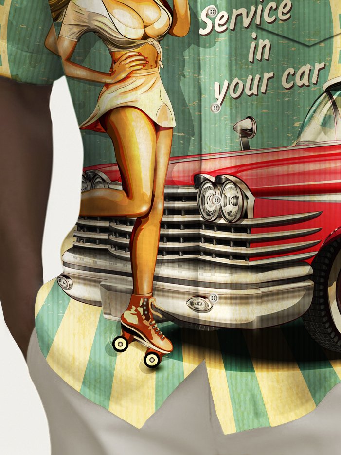 Alohadaddy Vintage Car Girl Poster Print Men's Chest Pocket Stretch Shirt Big Tall