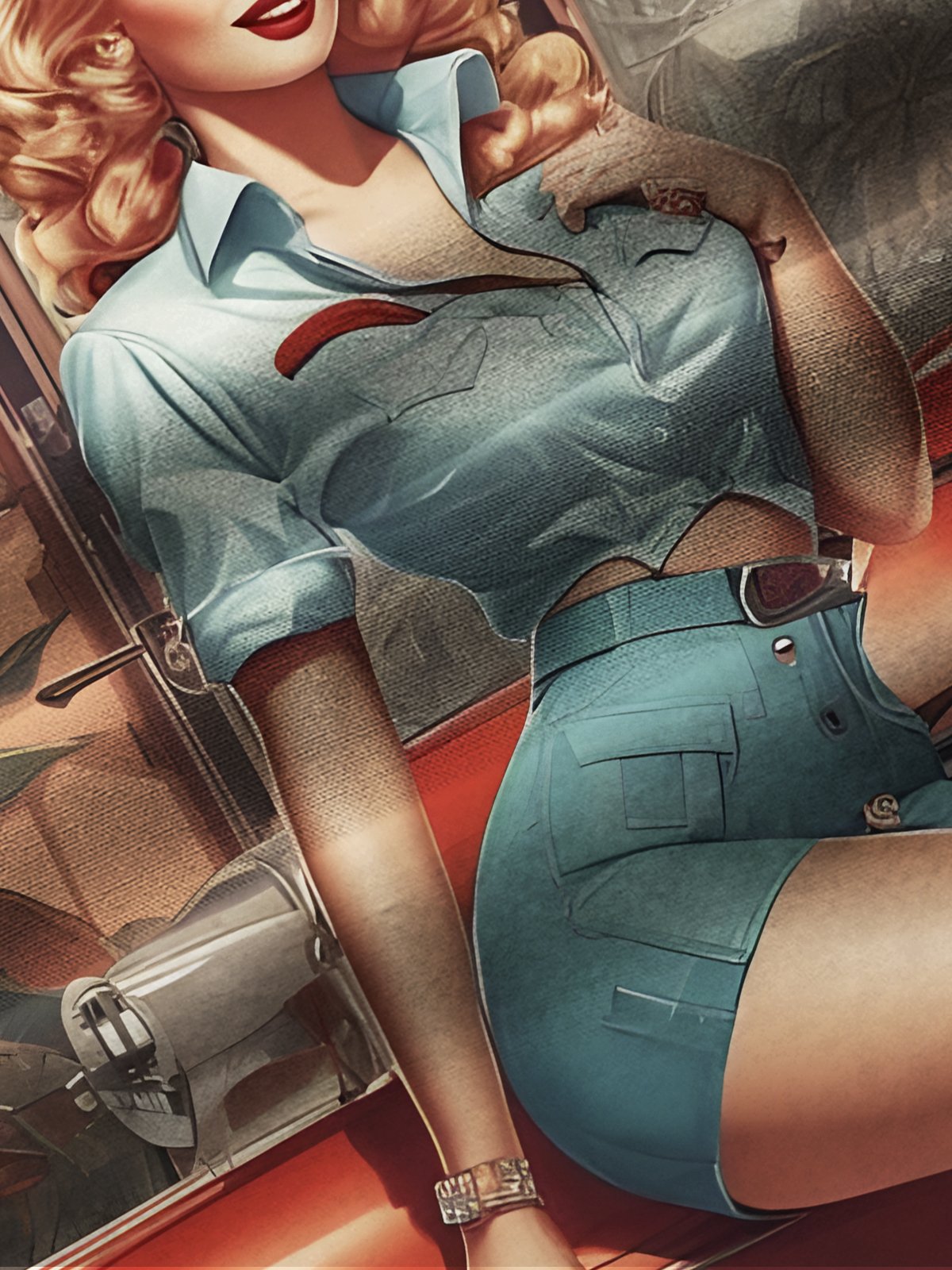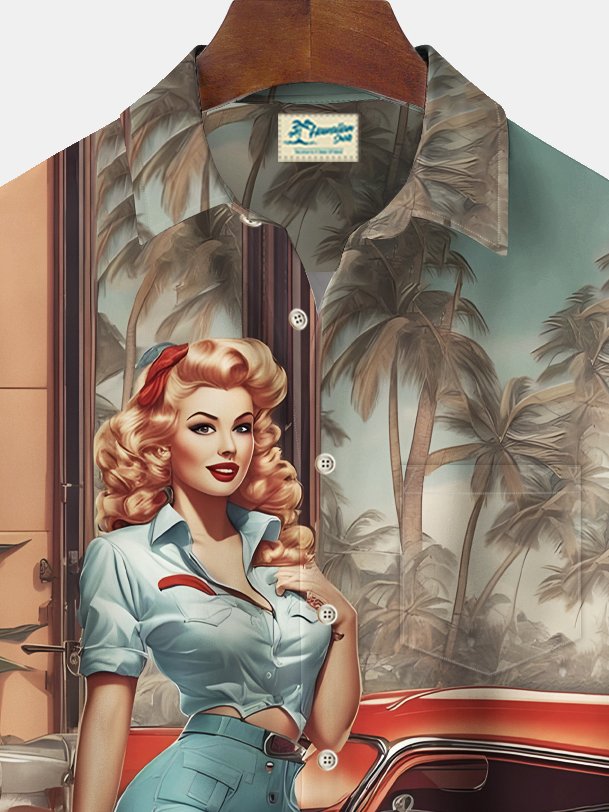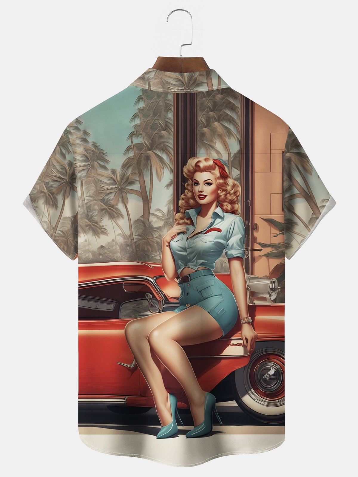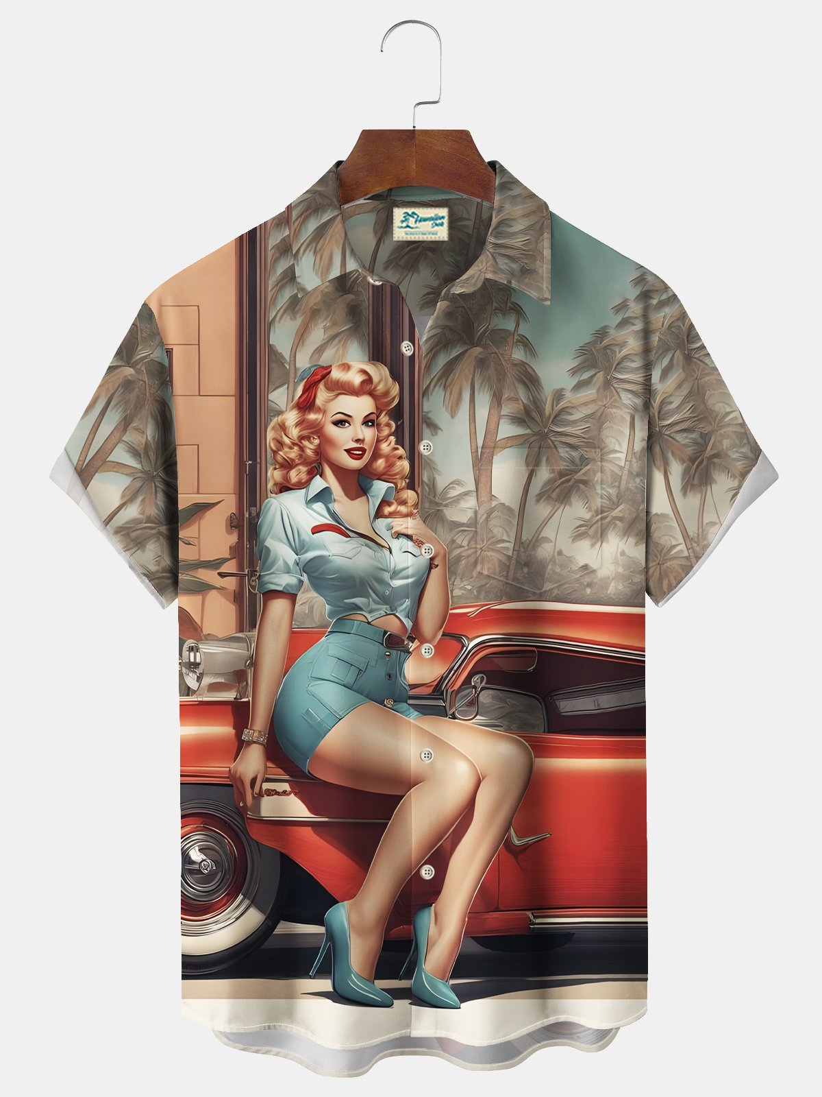 Alohadaddy Vintage Car Girl Poster Printed Men's Chest Pocket Stretch Shirt Big Tall