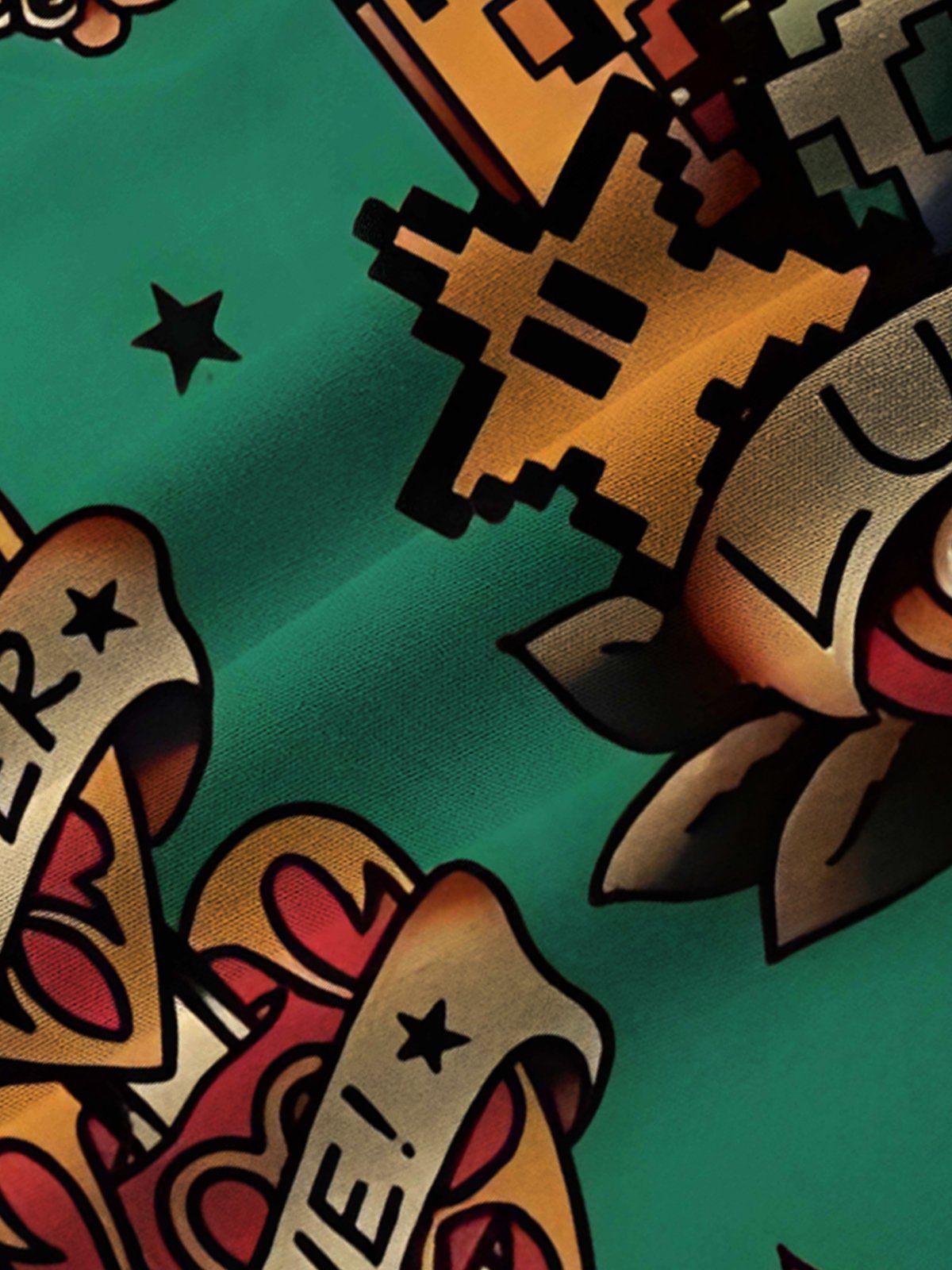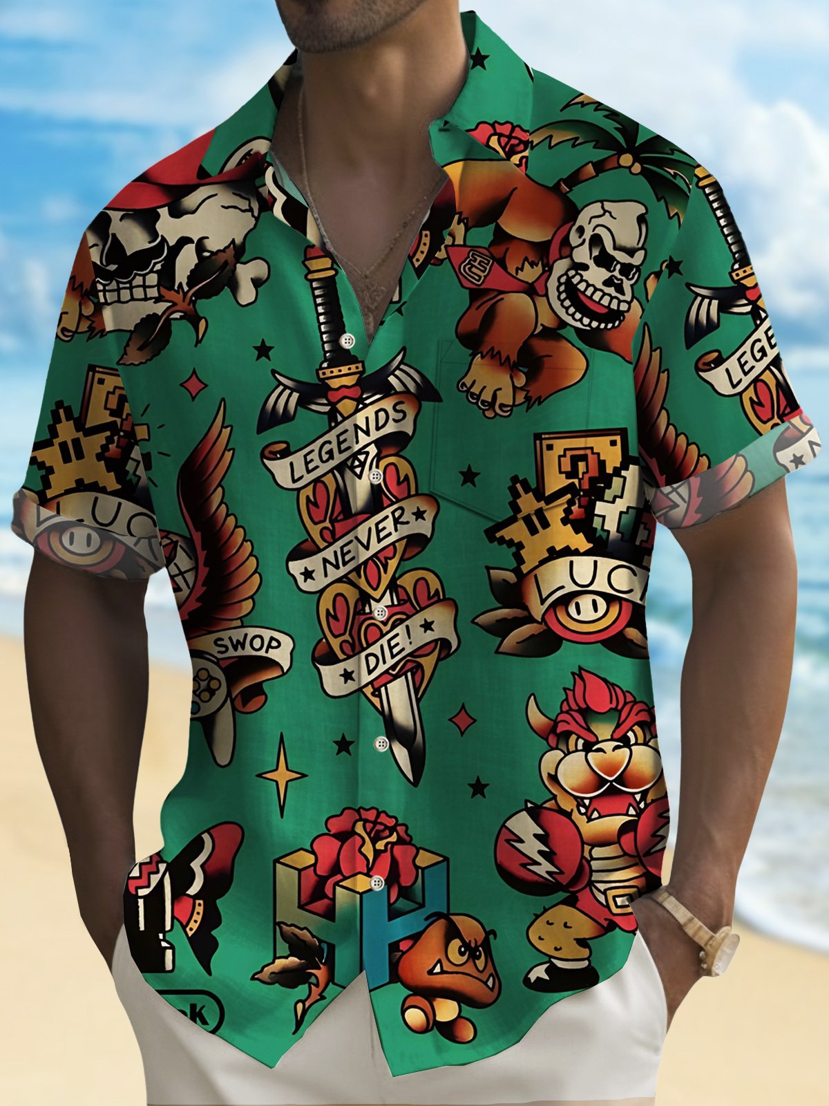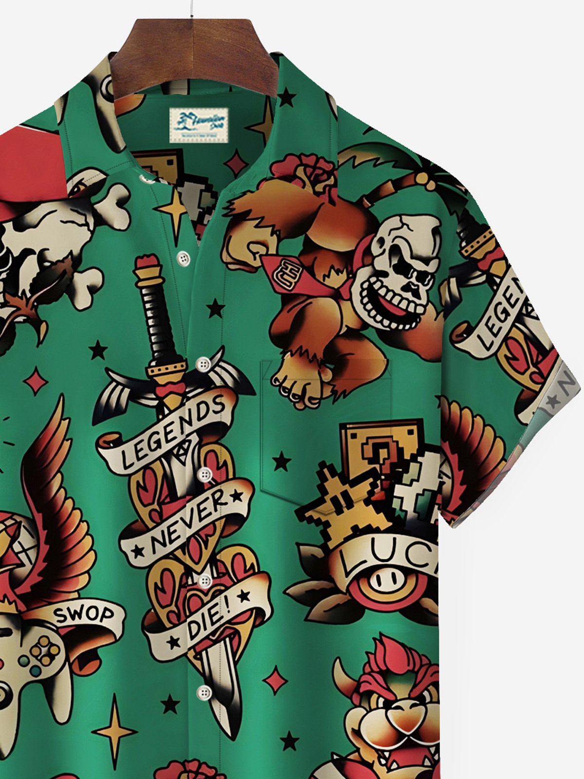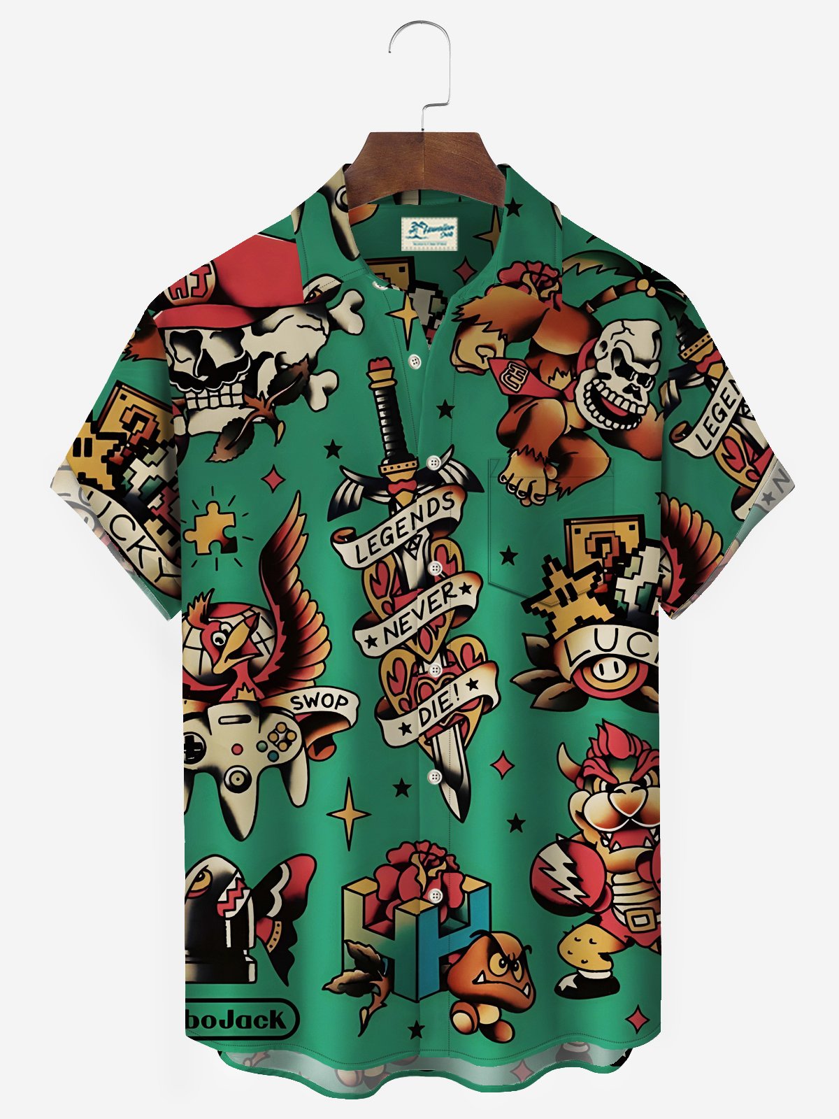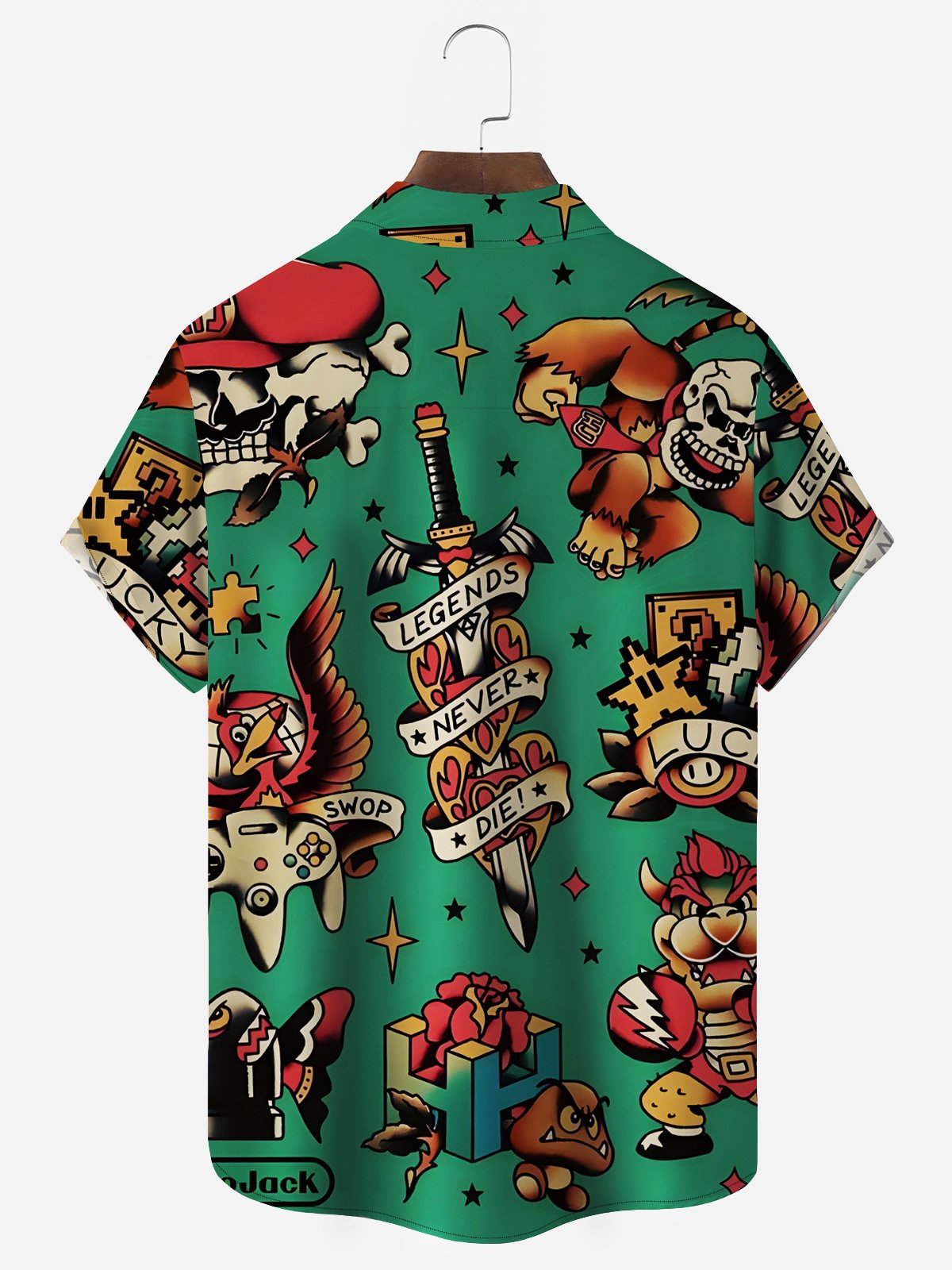 Alohadaddy Vintage Cartoon Game Green Men's Hawaiian Shirts Stretch Easy Care Pocket Camp Shirts Big Tall