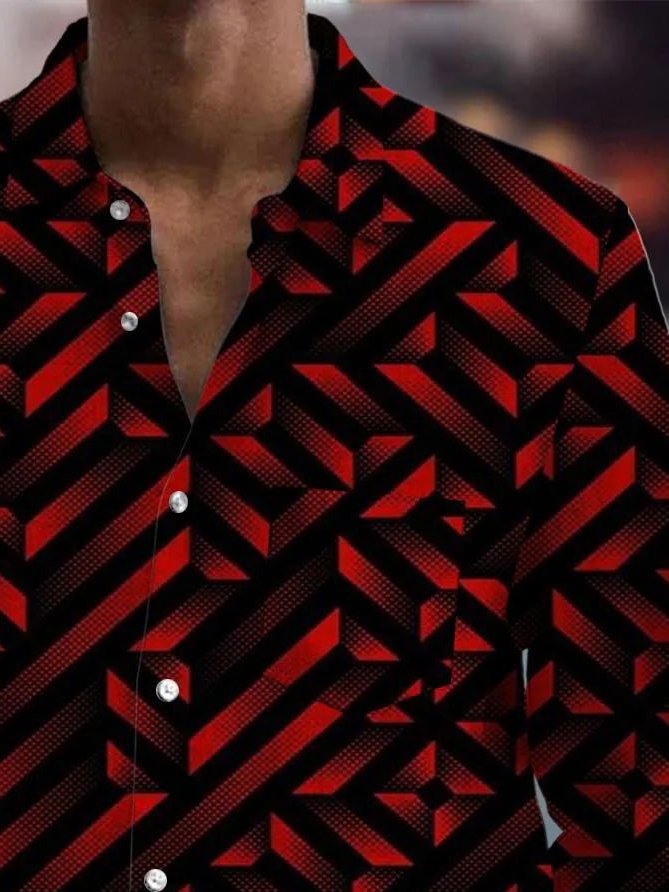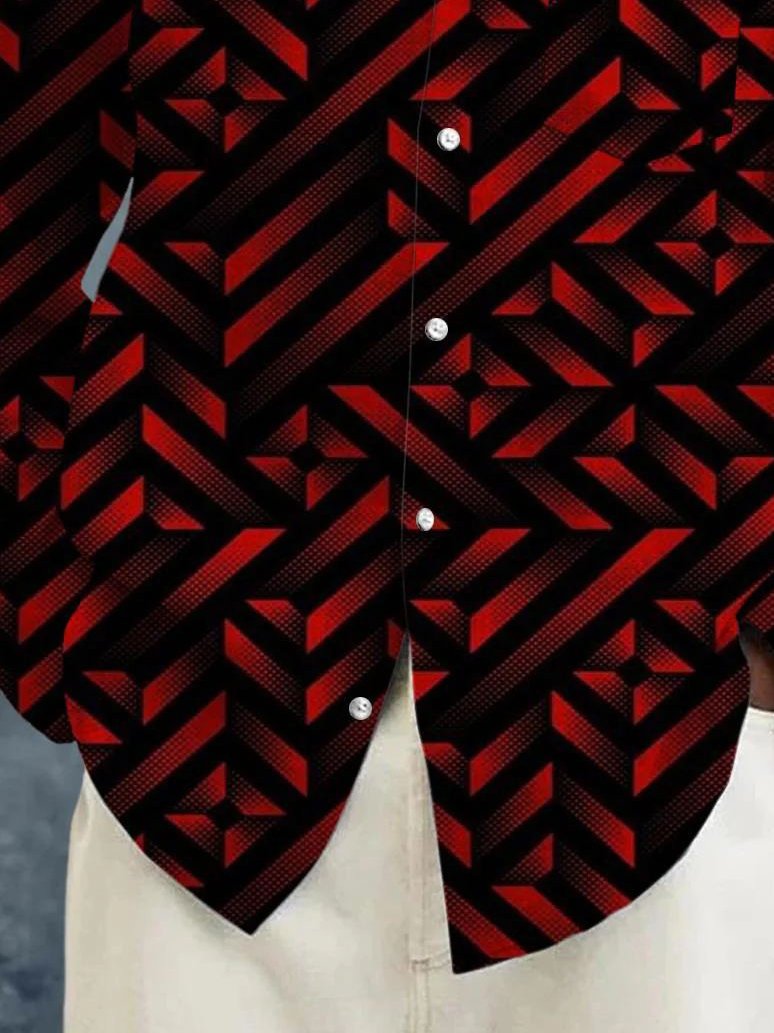 Alohadaddy Vintage Men's Geometric Print Chest Pocket Stretch Long Sleeve Shirt Big Tall