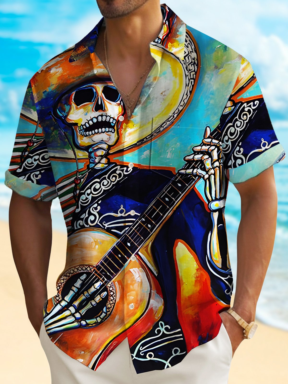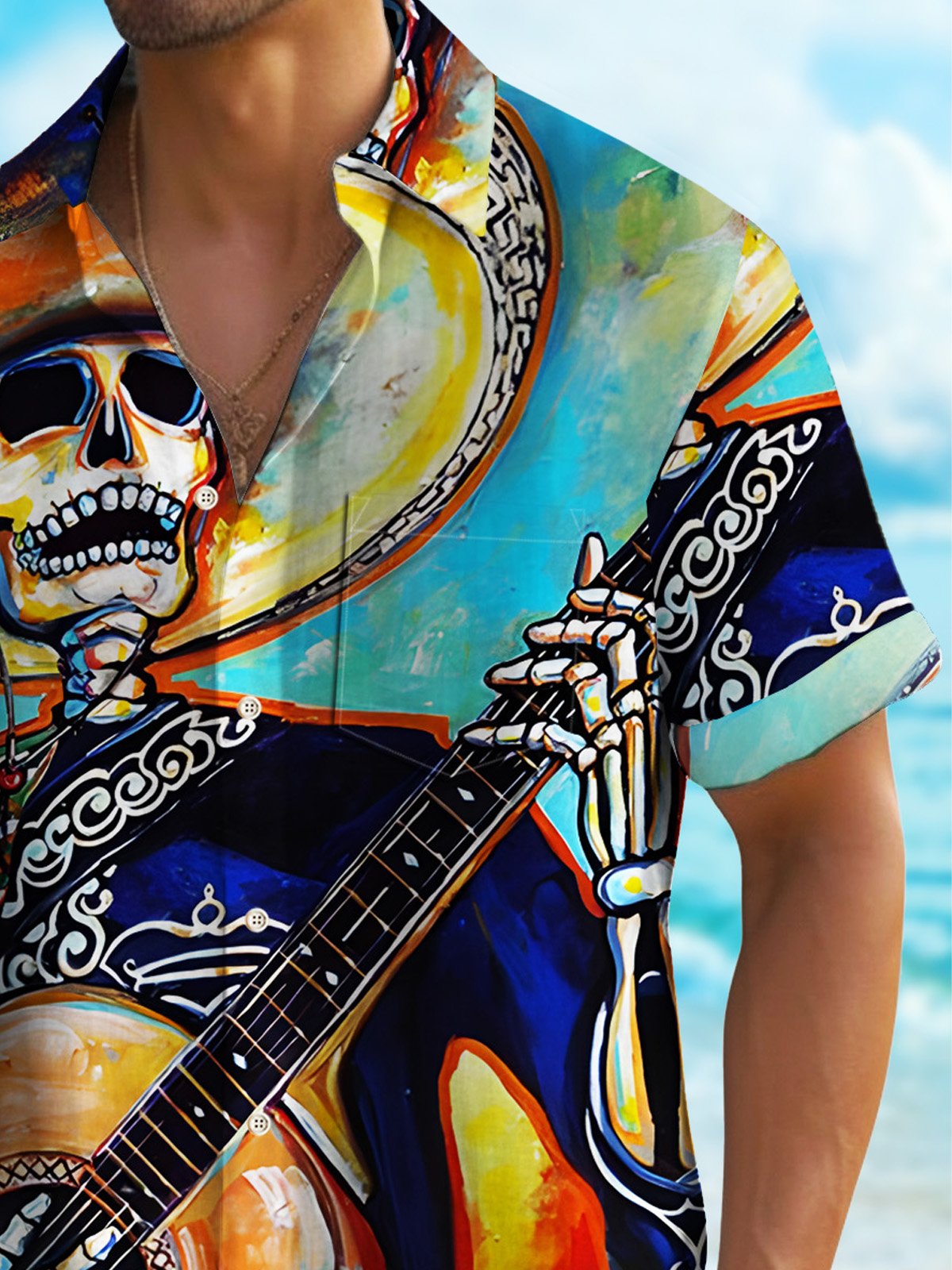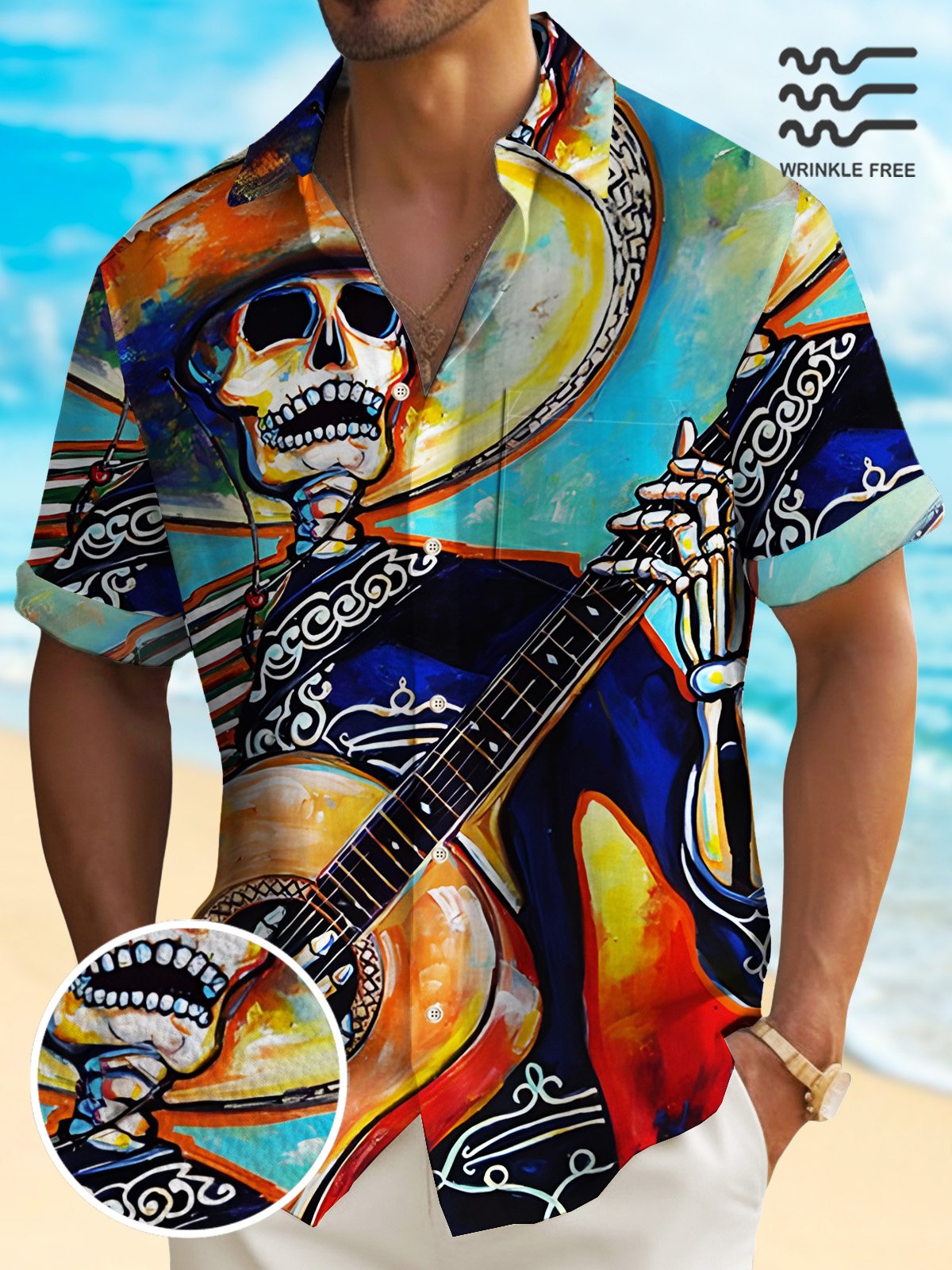 Alohadaddy Vintage Skull Art Men's Hawaiian Shirt Cinco de Mayo Wrinkle Free Seersucker Pocket Camp Shirt Big Tall