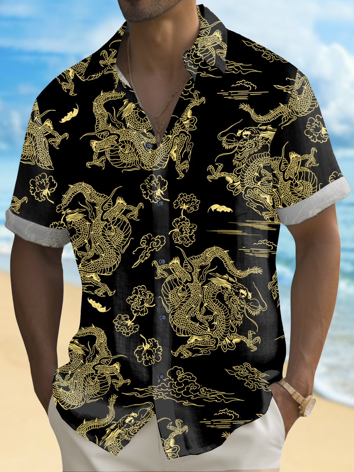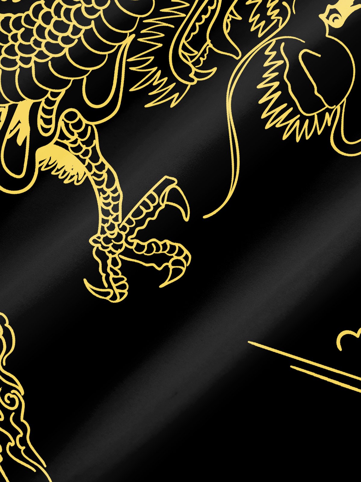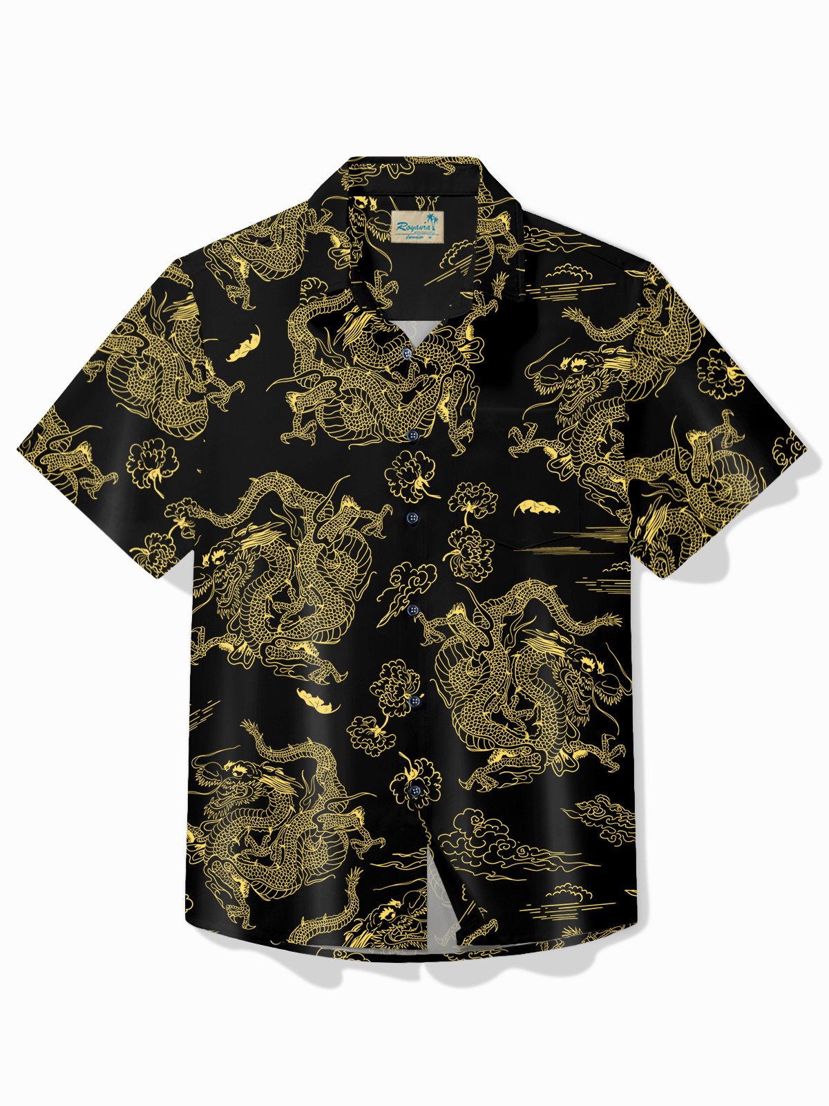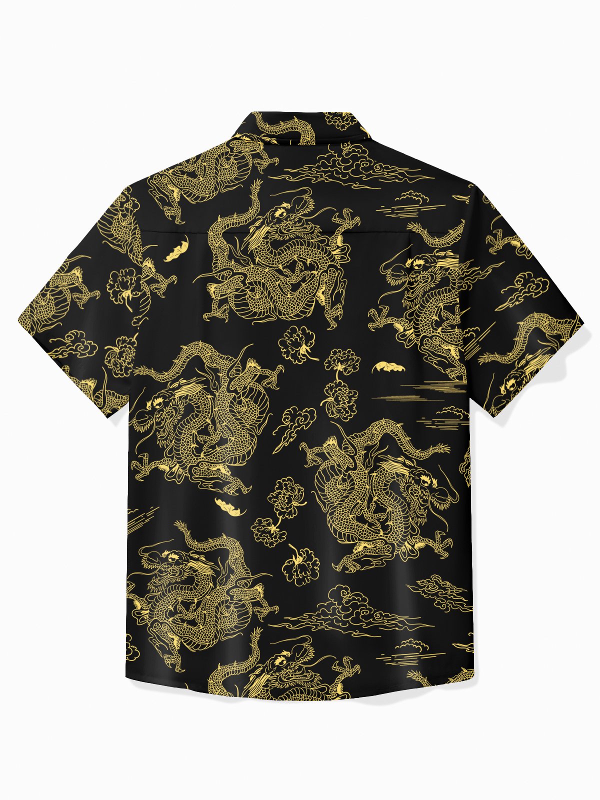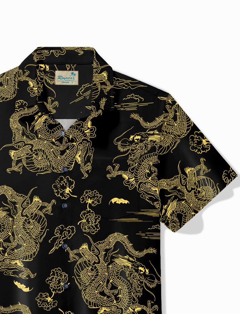 Alohadaddy Vintage Year of the Dragon Black Gold Dragon Print Men's Shirt Stretch Pocket Camping Shirt Big Tall