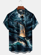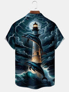 Alohadaddy® Retro Lighthouse Dolphin Wave Print Pocket Stretch Men's Short Sleeve Shirt Big & Tall