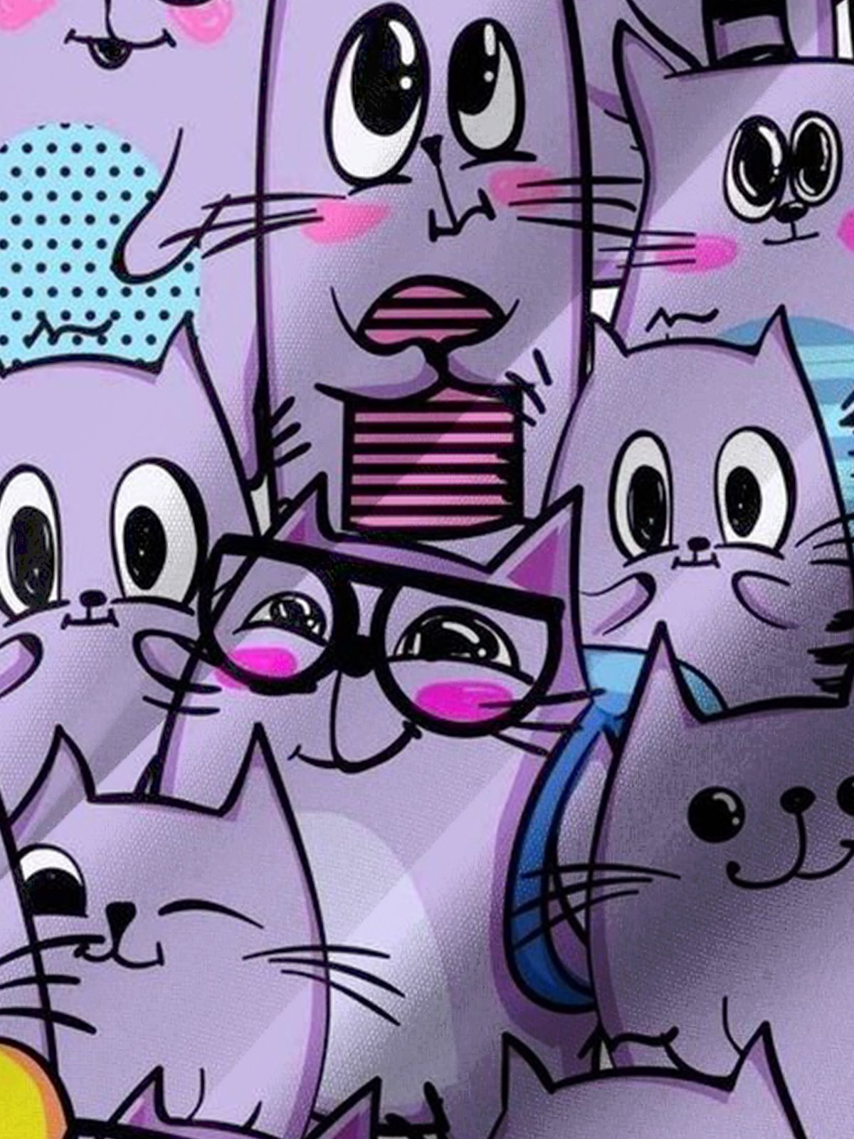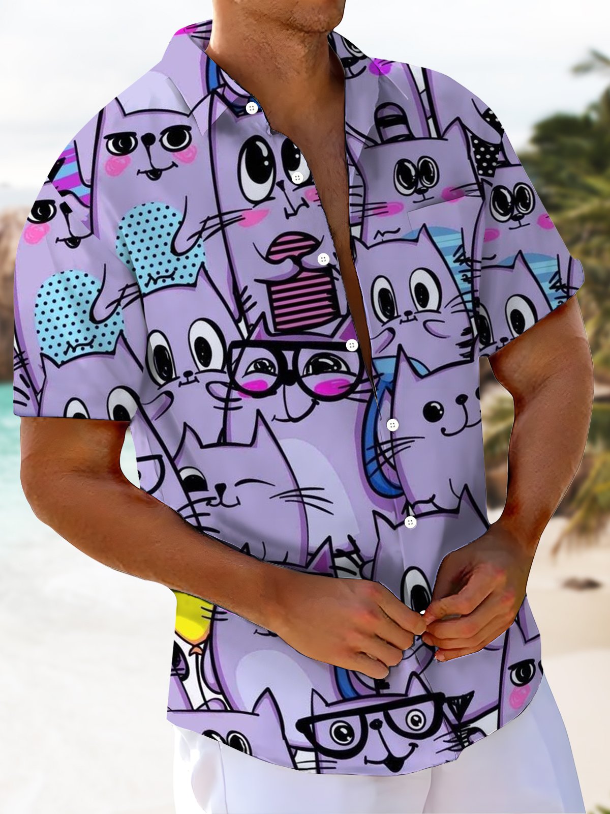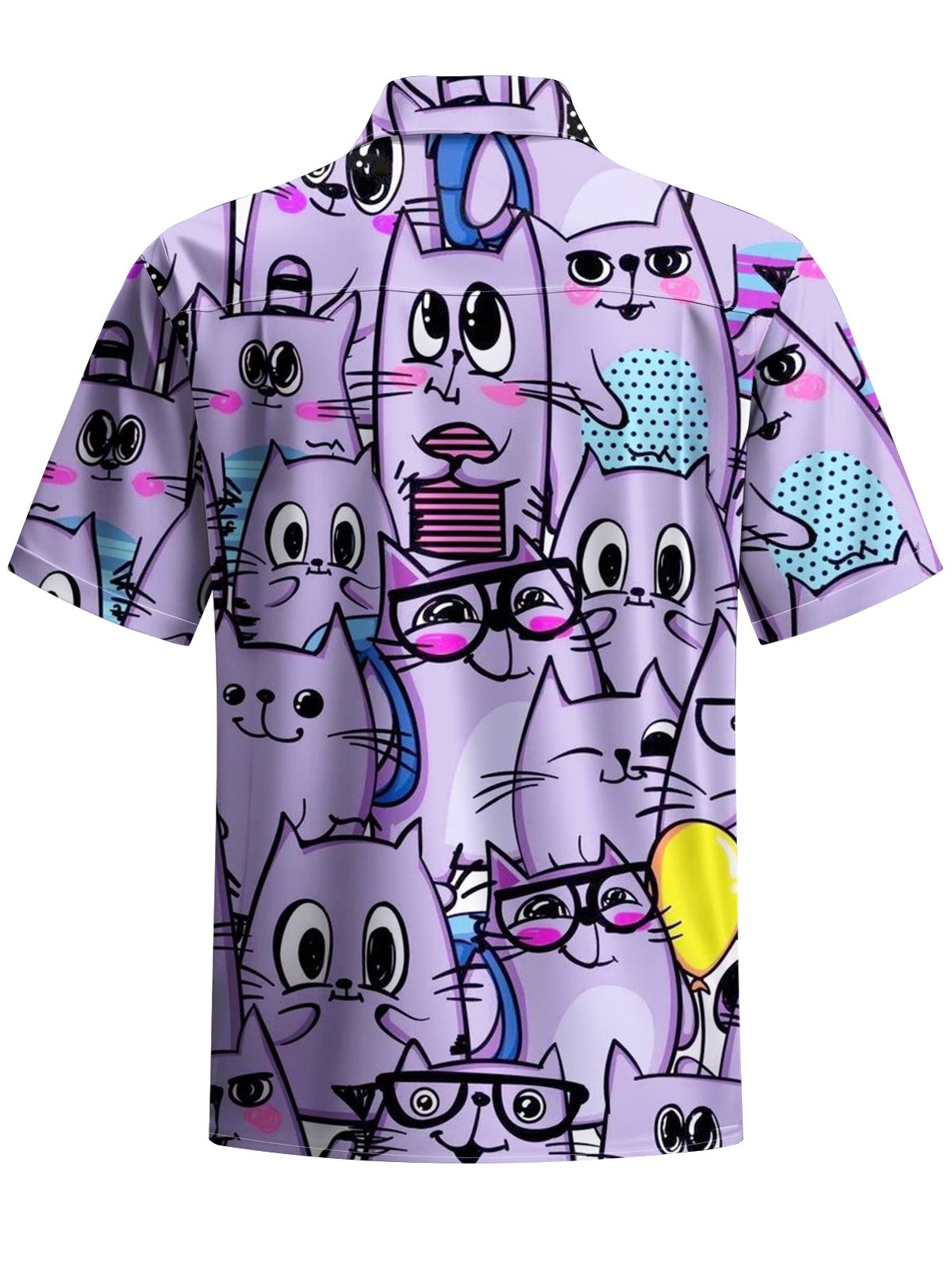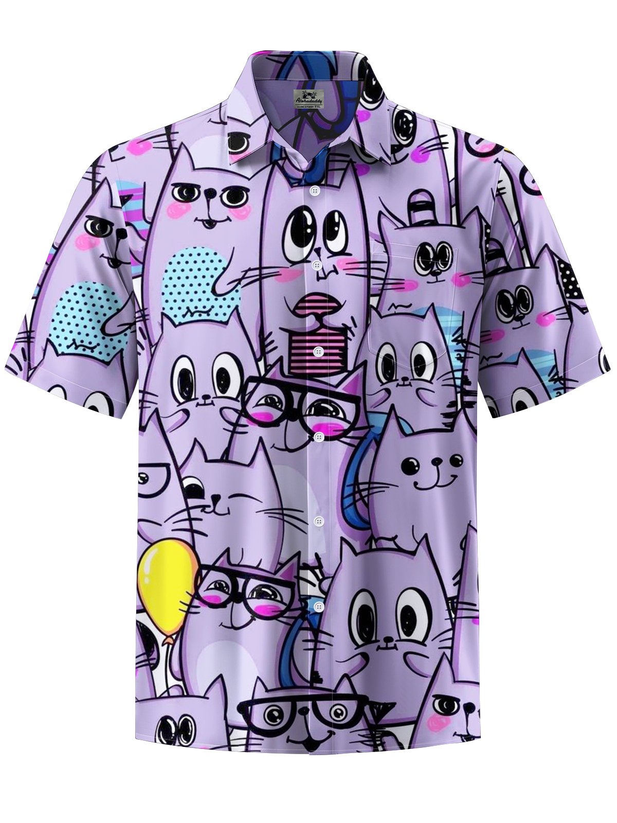 Alohadaddy® Casual Cartoon Cat Print Artwork Chest Pocket Men's Short Sleeve Shirt Big & Tall
