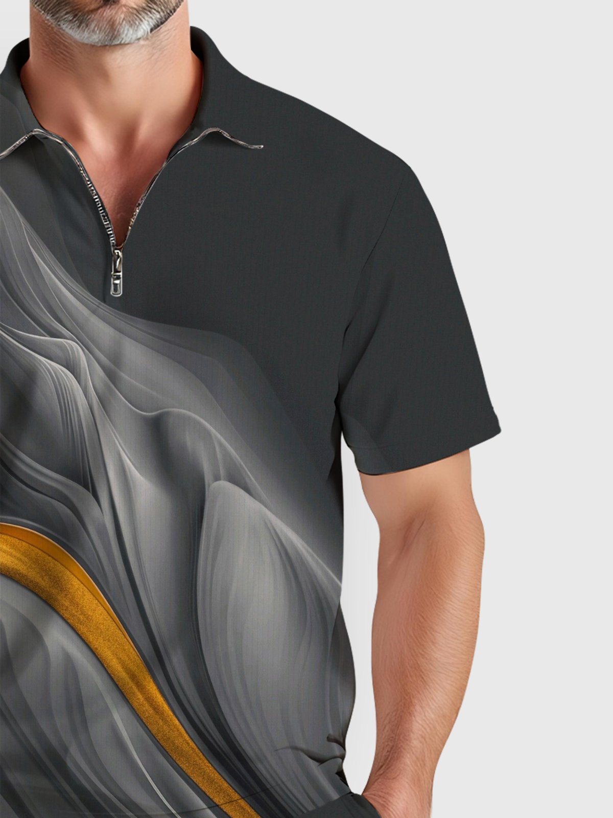 Alohadaddy® Casual Gradient Abstract Print Art Zipper Elastic Large Size Men's Short Sleeve Polo Shirt Set