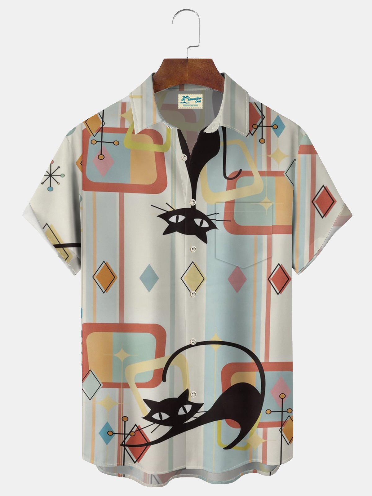 Alohadaddy® Men's Medieval Geometric Cat Print Lapel Pocket Short Sleeve Shirt Big & Tall