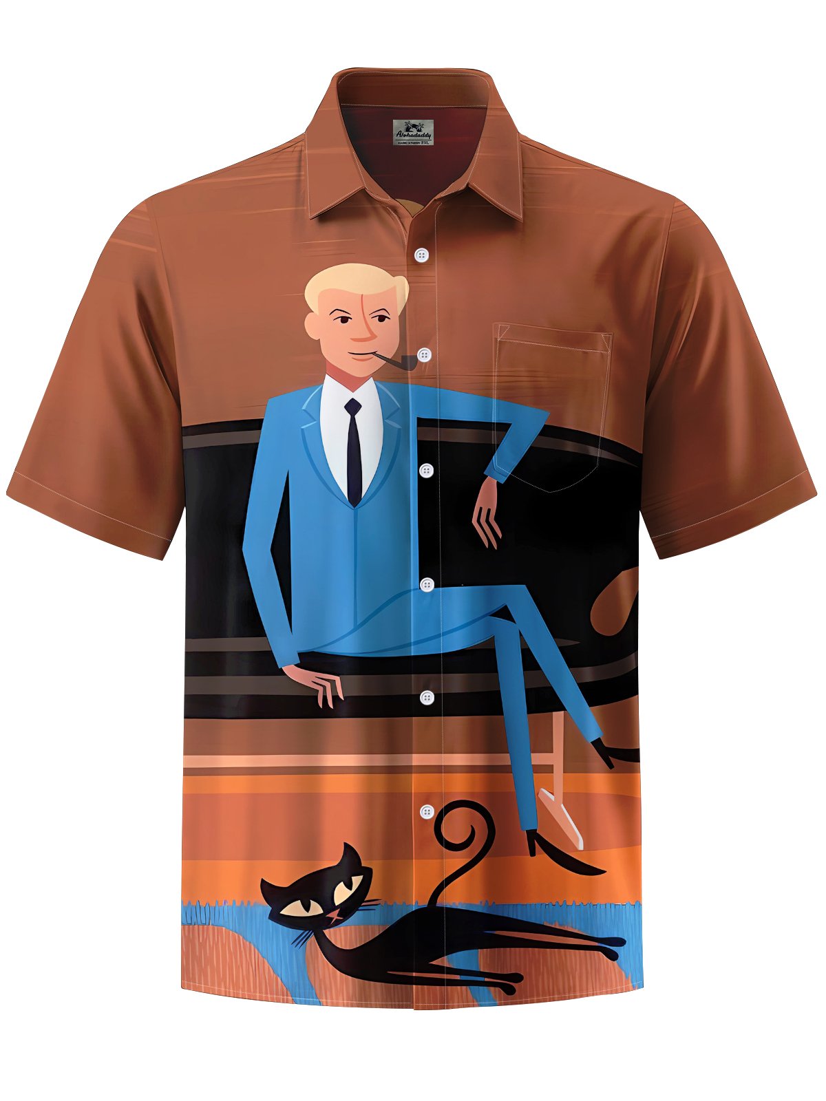 Alohadaddy® Retro Atom Geometric Cartoon Print Art Elastic Pocket Button Men's Short Sleeve Shirt Big & Tall