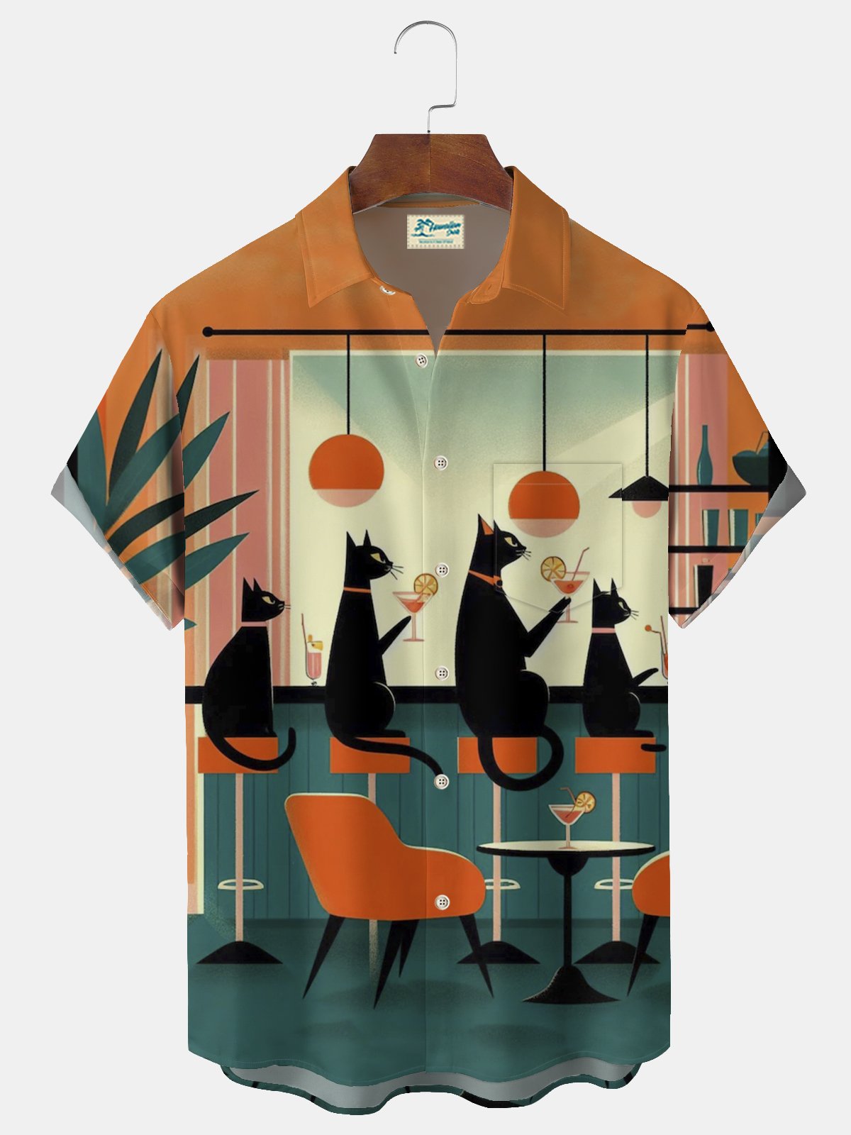 Alohadaddy® Retro Cat Cocktail Party Print Men's Lapel Short Sleeve Shirt Big & Tall