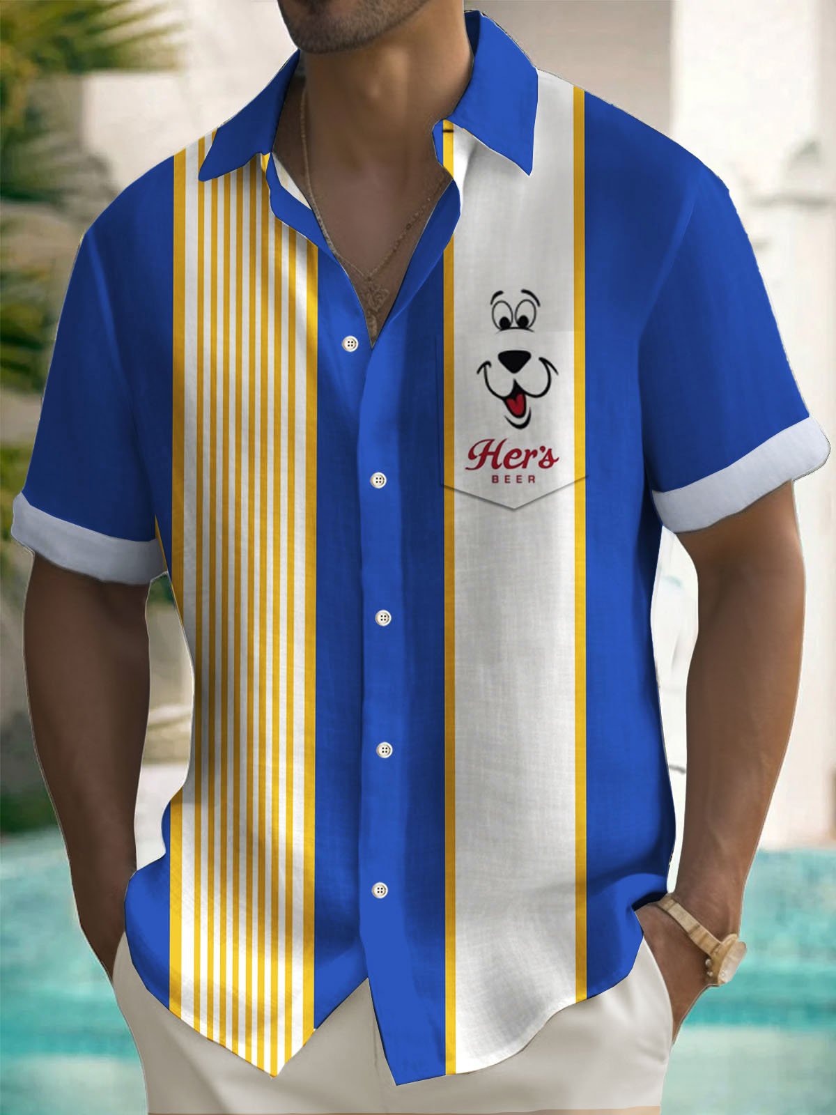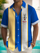 Alohadaddy Retro Beer Cartoon Stripe Print Men's Button Pocket Short Sleeve Shirt