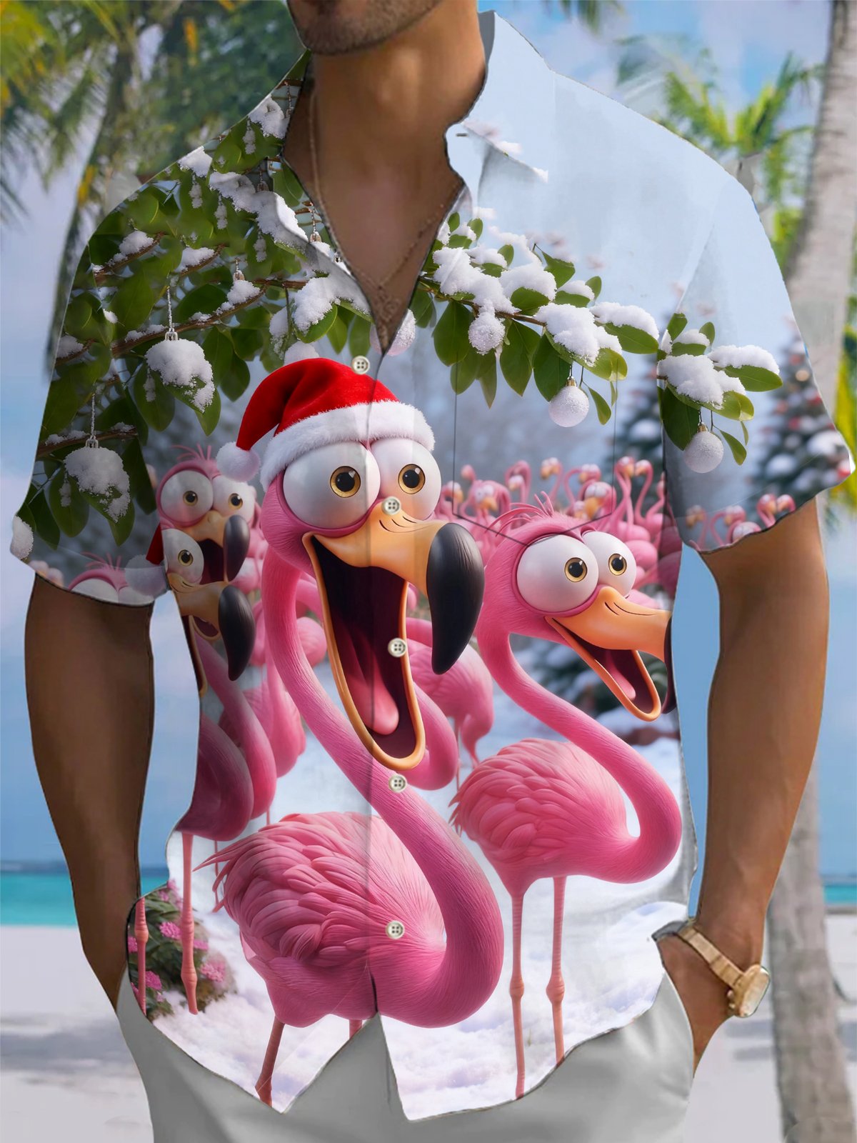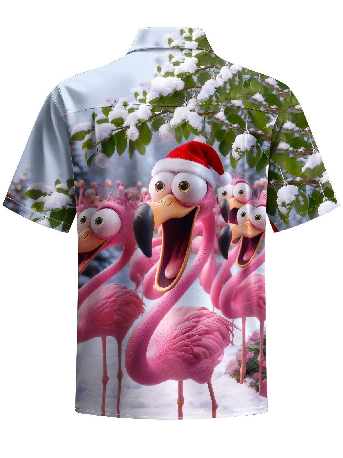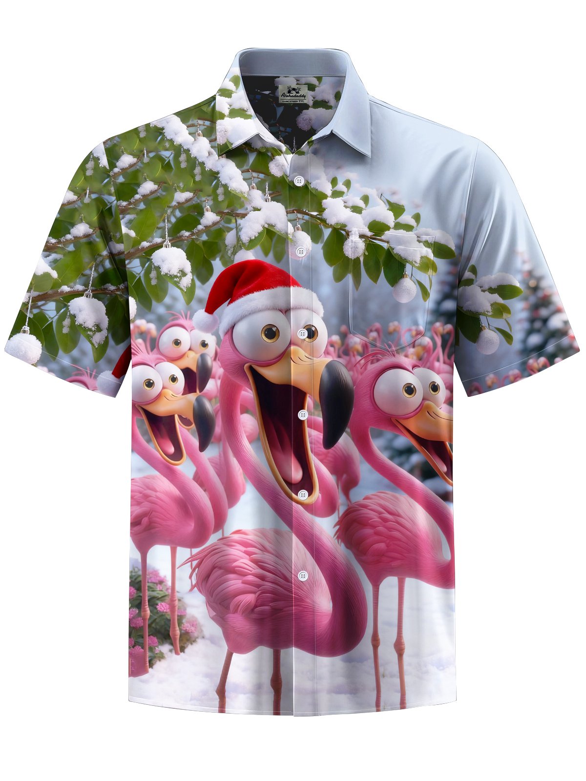Alohadaddy® Christmas Flamingo Print Men's Short Sleeve Shirt Big & Tall with Elastic Pockets and Buttons