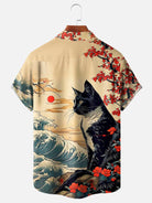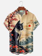 Alohadaddy Men's Retro Ukiyo-e Cat Print Button Pocket Short Sleeve Shirt