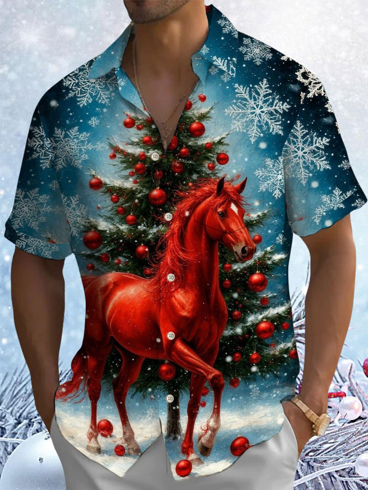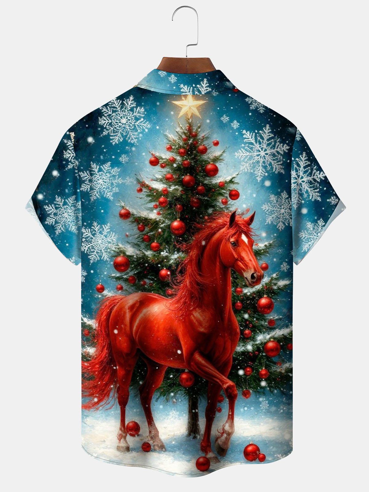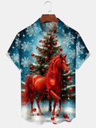 Alohadaddy® Christmas Red Horse Print Pocket Elastic Button Men's Short Sleeve Shirt Big & Tall