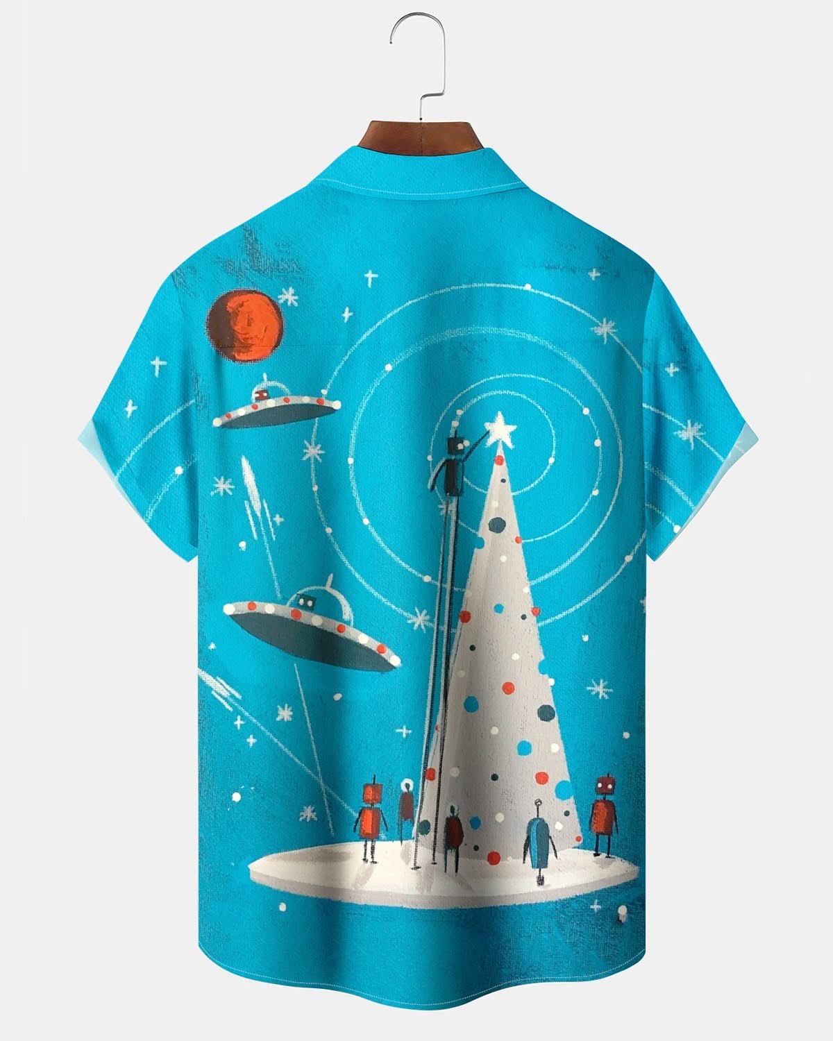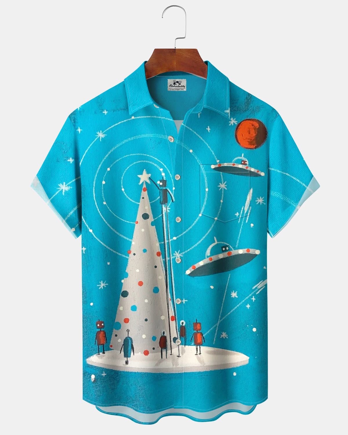 Alohadaddy® Retro Christmas Tree Alien Print Men's Short Sleeve Shirt with Elastic Pockets and Buttons Big & Tall