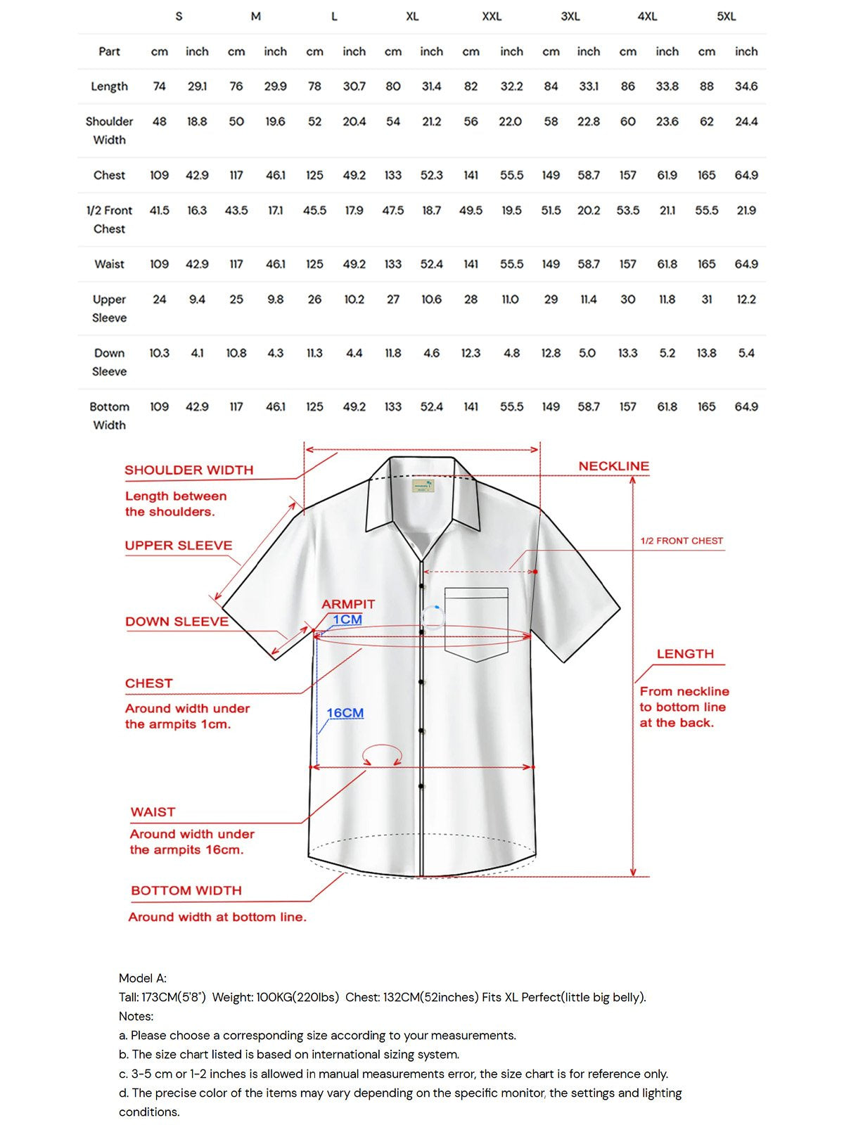 Model A:Tall: 173CM(5'8") Weight: 100KG(220lbs) Chest: 132CM(52inches) Fits XL Perfect(little big belly).