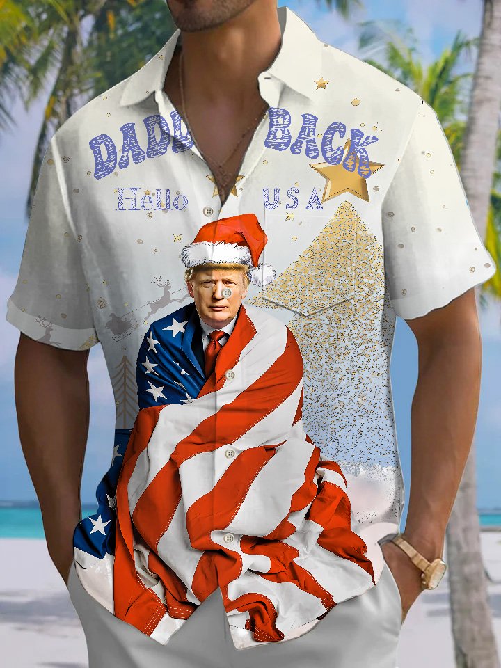 Alohadaddy Christmas Trump Flag Button Pocket Casual Short Sleeve Shirt