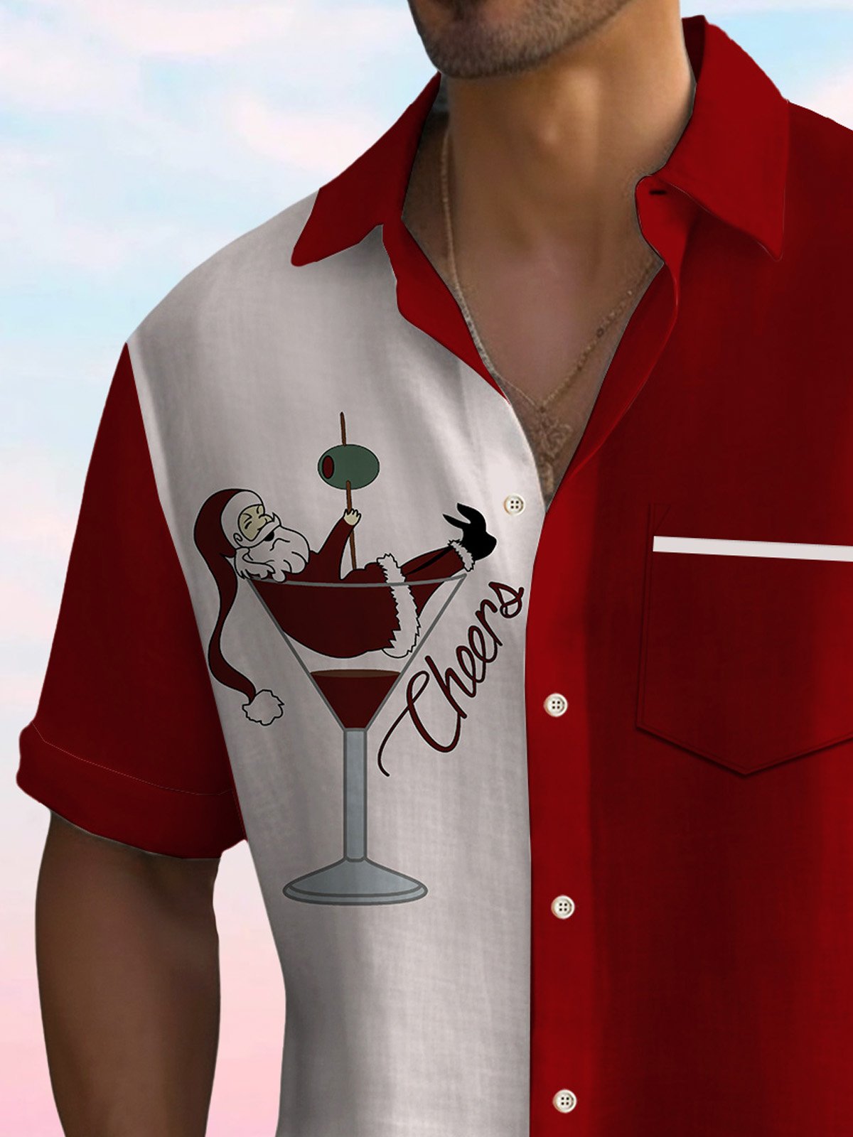 Men Santa With Gifts Bag Print Pocket Front Short Sleeves Shirt